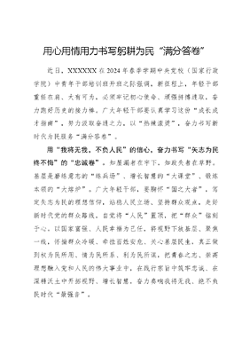 用心用情用力书写躬耕为民满分答卷近日,XXXXXX在2024年春季学期中央党校(国家行政学院)中青年干部培训班开班之际强调,新征程上,年轻干部重任在肩、大有可为,必须牢记初心使命、顽强拼搏进取,奋力跑好历史的接力棒。广大年轻干部要认真学习这份成长成才指南,努力汲取奋进之力,以热辣滚烫,奋力书写新时代为民服务满分答卷。用我将无我,不负人民的信心,奋力书写矢志为民终不悔的忠诚卷。知屋漏者在宇下,知政失者在草野。基层是磨练意志的练兵场、增长智慧的大课堂、锻炼本领的大熔炉。广大年轻干部,要胸怀国之大者,笃定矢志为民的理想信仰,站稳人民立场、坚持群众观点,走好新时代党的群众路线,自觉将人民置顶,把群众铭刻于心。以国家富强、人民幸福为己任,将视野下放基层、聚焦一线,怀揣群众冷暖、牵挂百姓安危、关心基层民生,真正做到权为民所用、情为民所系、利为民所谋,把青春之志、崇高理想融入党和人民的伟大事业中,在践行宗旨中筑牢忠诚、在深耕沃土中开拓视野、增长智慧,奋力奏响我将无我、绝不负民时代最强音。用枝叶关情,念兹在兹的初心,奋力书写俯首甘为孺子牛的为民卷。民之所忧,我必念之;民之所盼,我必行之。广大年轻干部,要树牢为民造福的政绩观,把为人民幸福而奋斗作为自己最大的幸福,做坚定为民造福的无私奉献者。要树牢公仆意识,让自己身上充满泥土味、汗水味、人情味,在接地气中聚人气、纾民困、解民忧、暖民心,以小学生姿态拜师学艺,以孺子牛精神兑现勤务员承诺,不怕苦、不怕脏、不怕累,主动问计于民、问需于民、问效于民,甘于奉献、不辞辛劳、任劳任怨,在奉献中定人生坐标,以功成不必在我的境界和功成必定有我的担当,创造出经得起实践、人民、历史检验的丰功伟绩。用挺膺担当、奋楫笃行的决心,奋力书写撸起袖子加油干的实干卷。坐在办公室里看到的都是问题,深入基层看到的全是办法。广大年轻干部,要大力发扬艰苦奋斗精神和实干作风,将脚步向下迈,积极践行四下基层,把坐而论道变成起而行之,把站在田边看变为带着群众干,在吃劲岗位上蹲苗历练,在急难险重中锤炼兴农富民本领,主动扛大旗、堪大任、挑重担、打头阵、做先锋,积极到群众意见多、困难大、情况复杂、矛盾尖锐的文可居文库——海量学习资料,手机电脑均可下载www.wenkeju.com地方去摸爬滚打,千方百计破难题、解难事、攻难关,奋力为乡村振兴添砖加瓦、为产业发展把脉问诊、为基层治理提效赋能,用自己的辛勤指数换取群众的幸福指数。文可居文库——海量学习资料,手机电脑均可下载www.wenkeju.com