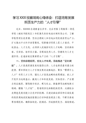 学习XXX视察湖南心得体会:打造培育发展新质生产力的人才引擎近日,XXXXXX在湖南省长沙市,先后考察了湖南第一师范学院(城南书院校区)和巴斯夫杉杉电池材料有限公司,了解学校用好红色资源、坚持立德树人和当地加快发展新质生产力、扩大高水平对外开放等情况。创新驱动实质上是人才驱动。千秋基业,人才为先。必须深入实施新时代人才战略,坚持高标准、实举措,培养各方面、各领域优秀人才,倍增放大人才支撑作用,打造培育发展新质生产力的人才引擎。一、坚持前瞻视野,优化人才布局,系统推进正向赋能。人才是高质量发展的强劲支持,人才优势是最有潜力的优势。要牢固树立人才引领发展的战略地位,聚焦需要什么人才布局人才工作,强化人才发展战略的统筹规划,把人才开发作为战略基点,提高人才和科技发展、实体经济、产业需求的匹配度,围绕数字经济、现代农业、新能源等战略性新兴领域,锻强人才链。要继续深化体制机制改革,从高校分类特色发展到建立分类评价机制,从建设面向国家和区域发展的创新高地到实施技能强企行动和技能根基工程,不断完善统筹协调机制,确保体制优、机制活,形成协同发力、高效畅通、支撑发展的生态体系。人才的资金投入上优先保障,结构的调整上优先推进,政策的效益上优先释放,下好先手棋,增强人才建设的适应和支撑能力。二、坚持创新引领,释放人才活力,推动成果落地注入动能。只有破除束缚人才作用发挥的捆绑绳,打破人才流动的天花板,才能促进人才活力的充分释放。要结合具体实际,放手授权给用人主体,该下放的权力不能攥紧在手,该由用人单位决定的事不能随意拍板,选什么样的人、如何选人,用人单位最有发言权。要避免用人的不评人的挠头事,避免评人的不用人的烧脑事,把用人主体的主观能动性充分发挥出来,以明白选明白评激发人才活力。此外,要疏通人才评价的堵点,在人才评价上破四唯,根据创新能力、业绩水平对人才进行分类评价,防止一把尺子量到底,同时创新激励机制引导人才流动,提升人才供给的质量,推动成果的落地应用。三、坚持引育并举,紧抓人才培养,确保人尽其才撬动效能。人才培养上要多维发力,持续抓好人才能力本领的培养,形成从知到行、从用到会的闭环。要紧盯时代发展变化,主动适应学科交叉、能力多面、知识融通的大趋势,强化基础研究和引领性创新,促进学科链与产业链、文可居文库——海量学习资料,手机电脑均可下载www.wenkeju.com创新链的贯通,精心制定长周期、多方式的人才培养方案,加强国家急需高层次人才培养。要把握人才成长规律,树立唯才是举、用人所长的理念,为人才搭建干事创业舞台,坚持在重点项目、重要任务和实践一线冶炼人才,培厚创新的丰沃土壤,把选人视野拓宽,将用人思维打开,用好用活各类人才,做到人尽其才、才尽其用,让人才拥有实现抱负、施展才华的广阔舞台。四、坚持优化环境,筑巢引凤搭台,真情实意做好人才服务工作要留住人才,需要从人才最关心关注、最直接现实的问题出发,优化政策服务软环境,专心筑巢,确保人才留得住。第一,要坚持党管人才的原则。通过制定政策,建立激励机制,做到人尽其才,大力激发人才创造活力的工作环境,充分调动各类人才的积极性,发挥人才的积极作用。第二,要加强交流合作。夯实制度建设,加强顶层设计,为人才发展提供通道。在推动青年人才个人发展的同时,强化我市人才强市战略的实施。第三,各职能部门要加强对引进人才的服务和管理。结合各类人才的实际情况,善于发现人才、真心爱护人才,加大人才相关工作的改革力度,不断创新人才工作机制。我们要进一步加强对人才的服务和管理工作,要积极为人才松绑,文可居文库——海量学习资料,手机电脑均可下载www.wenkeju.com完善人才管理制度,做到人才为本,信任人才、尊重人才、善待人才,努力破除影响人才发展的瓶颈,开创人才工作的新局面。文可居文库——海量学习资料,手机电脑均可下载www.wenkeju.com