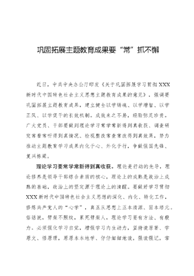 巩固拓展主题教育成果要常抓不懈近日,中共中央办公厅印发《关于巩固拓展学习贯彻XXX新时代中国特色社会主义思想主题教育成果的意见》,强调要巩固拓展主题教育成果,建立健全以学铸魂、以学增智、以学正风、以学促干的长效机制。成效来之不易,经验弥足珍贵。广大党员、干部要做到理论学习常学常新得到真收获、调查研究常看常听得到真情况、检视整改常查常改得到真效果,努力推动主题教育学习成果内化于心、外化于行,争做强国先锋、复兴栋梁。理论学习要常学常新得到真收获。理论是行动的先导,理论修养是领导干部综合素质的核心,理论上的成熟是政治上成熟的基础,政治上的坚定源于理论上的清醒。要做好学习贯彻XXX新时代中国特色社会主义思想的深化、内化、转化工作,修炼共产党人的心学,真正从思想上正本清源、固本培元。俗话说,劈柴不照纹,累死劈柴人,理论学习要有方法、有毅力。必须强化学习自觉,增强学习内生动力,坚持读原著、学原文、悟原理,原原本本地学、仔仔细细地读,强读强记,常学常新,唯有铢积寸累、日就月将,方能融会贯通、水到渠成。须把自己摆进去、把职责摆进去、把工作摆进去,全面系统学,及时跟进学,深入思考学,联系实际学,做到学思用贯通、知信行统一。唯有如此,方能在信仰上不迷茫、思想上不迷航、行动上不迷向。调查研究要常看常听得到真情况。调查研究是谋事之基、成事之道,必须坚持问题导向,抓住重点难点,带着任务、带着目标沉到调研一线去,不唯上、不唯书、只唯实,出好实招、用准实劲、下足实功,力求调得真情况、研得真办法、取得真实效。干工作、下基层、察民情必须走心而不走形,把心沉下来、把腰弯下去,去看一看、听一听基层组织建设、乡村振兴、基层治理、项目推进、矛盾化解、作风建设等方面还有哪些主客观上的堵点、淤点、难点。既要总体分析浮于表面的直观情况,又要深入解剖麻雀看到根子上的真实东西。唯有在态度上诚恳、行动上主动、方法上得当、作风上扎实,才能真正在力戒形式主义、官僚主义上取得明显实质性进展,才能在调查研究中有所悟、有所为、有所得。检视整改要常查常改得到真效果。检视整改是发现问题、解决问题的关键。只有做到三省吾身,不断地查到症结上、落到关键处,方能固本强身、建立免疫。当激活靶向思维,文可居文库——海量学习资料,手机电脑均可下载www.wenkeju.com在主客观上双向发力,真找问题、找真问题,避免以惯性思维想问题,不假思索列清单。要勇于面对问题清单,坚持缺啥补啥哪错改哪儿,以稳准狠的精气神儿确保整改措施的操作性和实效性时时在线。须一步一回头,做到盯死看牢,对标整改台账挂账销号、限期清零,真正补齐短板弱项、改进工作作风、提升履职效能。唯有把人民群众满意不满意作为评判检视整改工作成效的根本标准,在心与行上形成整体合力,方能整出实效、改出真章,方能交出检视整改满分答卷。文可居文库——海量学习资料,手机电脑均可下载www.wenkeju.com
