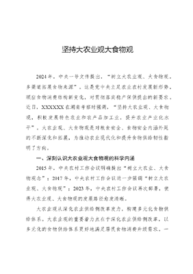 坚持大农业观大食物观2024年,中央一号文件提出,树立大农业观、大食物观,多渠道拓展食物来源。这是党中央立足农业农村发展新形势,顺应食物消费结构新变化,对贯彻落实稳产保供提出的新要求。近日,XXXXXX在湖南考察时强调,坚持大农业观、大食物观,积极发展特色农业和农产品加工业,提升农业产业化水平。大农业观、大食物观是对粮食安全、食物安全内涵外延的不断深化和拓展,为推动农业现代化和提升食物供给韧性指明了方向。一、深刻认识大农业观大食物观的科学内涵2015年,中央农村工作会议明确提出树立大农业、大食物观念;2017年,中央农村工作会议进一步强调树立大农业观、大食物观;2023年,中央农村工作会议再次部署,使得大农业观、大食物观的发展路径愈发清晰。大农业观从深化农业供给侧改革发力,构建多元化食物供给体系。大农业观的重要着力点在于深化农业供给侧改革,以多元化的食物供给体系更好地满足居民食物消费升级需求。一方面,大农业观区别于依赖耕地资源生产食物的传统农业,要求统筹考虑整个国土资源,充分挖掘资源禀赋优势,要按照XXXXXX指出的,向耕地草原森林海洋、向植物动物微生物要热量、要蛋白,全方位多途径开发食物资源。另一方面,大农业观不再局限于单一、平面的农业生产过程,而是强调通过技术创新、管理升级、产业协同等手段,构建立体、循环的农业产业链,兼顾经济效益、社会效益和生态效益。大食物观从转变消费结构发力,顺应人民群众对美好生活的向往。XXXXXX指出,解决吃饭问题,不能光盯着有限的耕地,要把思路打开,树立大食物观。吃饭不仅仅是消费粮食,肉蛋奶、果菜鱼、菌菇笋等样样都是美食。大食物观以完善膳食营养指南为基础,引导居民树立科学的食物消费理念,形成兼具营养、健康与节约理念的食物消费结构。一方面,大食物观强调在满足主粮消费的基础上,提高膳食质量和营养健康水平,推动国民膳食结构从有的吃、吃得饱向吃得多样、吃得科学、吃得健康、吃得绿色转变。另一方面,大食物观强调加快编制适合国民体质的食物消费指南,科学培养居民营养健康食物消费观念,引导居民厉行节约、反对浪费。大农业观与大食物观相辅相成,协力解决食物供给端和需求端的错配问题。现阶段,我国食物供给与需求面临着错配问文可居文库——海量学习资料,手机电脑均可下载www.wenkeju.com题,主要表现为食物生产不能完全适应居民日益多元化的消费需求,且居民营养不足与过剩并存、营养与健康知识缺乏等问题突出。大农业观与大食物观瞄准食物供需错配问题,以顺应消费端的需求结构变化为出发点,以构建多元化食物供给体系为目标,推动生产、加工、分配、流通、消费等各个环节有效衔接,进而实现需求端与生产端相互适应的良性循环,在促进农业高质量发展的基础上,更好地满足人民群众对美好生活的向往。二、践行大农业观大食物观的主要成效在大农业观大粮食观指导下,我国粮袋子更加饱满,2023年人均粮食产量增至493公斤,远高于国际公认的400公斤粮食安全线。我国居民食物消费基本完成从吃饱向吃好的跃迁,进入追求营养健康的新阶段。主食、食用植物油消费相对稳定,肉蛋奶消费量持续增长。在大农业观方面,农业资源开发初见成效。我国高标准农田建设成绩斐然,到2022年累计建成10亿亩,为粮食连续9年稳定在1.3万亿斤以上作出重要贡献。盐碱地综合利用取得重大进展,截至2023年5月,我国形成土壤排盐、土壤生物有机治盐改土等八大体系40多项实用技术,累计推广50多种耐盐碱作物,盐碱地面积总量减少、重度盐碱地占比逐年降低。文可居文库——海量学习资料,手机电脑均可下载www.wenkeju.com微生物技术成为农业新蓝海,以食用菌为例,改革开放以来产量增长了700多倍,产值一跃成为第五大农产品。践行大农业观需要着眼整个国土资源,一些尚未合理利用的林地、草地、水域等资源,可能蕴藏巨大的食物空间。科技研发投入稳定增长。新一轮科技体制改革以来,我国财政农业科技经费从2015年的281.90亿元提高到2020年的379.65亿元,增长明显。涉农企业逐步成为创新投入主体,2021年上市涉农企业研发经费平均投入1.13亿元,相比2019年、2020年增长了16%、18%。农业科技整体水平跨入世界第一方阵,2022年,我国农业科技进步贡献率为62.4%,农作物耕种收综合机械化率达73%,农作物自主选育品种面积占比超过95%,良种对粮食增产贡献率超过45%,为农业注入了不竭发展动力。产业链条与需求基本吻合。为更好满足市场日益多元化、高质化的需求,我国农业产业链条不断完善,产购储加销各环节加快转型升级,农产品更加多样化、个性化、品牌化,助力消费向吃得营养吃得健康转变。2023年,农业农村部公布了第一批178个国家现代农业全产业链