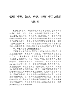 做到学纪、知纪、明纪、守纪学习交流研讨材料XXXXXX强调:组织开展好党纪学习教育,引导党员干部学纪、知纪、明纪、守纪,督促领导干部树立正确权力观,公正用权、依法用权、为民用权、廉洁用权。《中国共产党纪律处分条例》的修订是党中央站在新的历史起点上适应新时代党的建设总要求,全面加强党的纪律建设的重要举措。体现了党中央坚持不懈、持之以恒将全面从严治党向纵深推进的坚定决心和鲜明态度,同时也释放了越往后执纪越严的强烈信号。一、开展党纪学习教育的重要意义开展好党纪学习教育,要坚持以XXX新时代中国特色社会主义思想为指导,聚焦解决一些党员、干部对党规党纪不上心、不了解、不掌握等问题,党员特别是党员领导干部认真学习《条例》,做到学纪、知纪、明纪、守纪,搞清楚党的纪律规矩是什么,弄明白能干什么、不能干什么,把遵规守纪刻印在心,内化为言行准则,进一步强化纪律意识、加强自我约束、提高免疫能力,增强政治定力、纪律定力、道德定力、抵腐定力,始终做到忠诚干净担当。《条例》全面贯彻XXX新时代中国特色社会主义思想和党的XX大精神,从党章这个总源头出发,坚持严的基调,坚持问题导向和目标导向相结合,与时俱进完善纪律规范,进一步严明政治纪律和政治规矩,带动各项纪律全面从严,释放越往后执纪越严的强烈信号,发挥纪律建设标本兼治作用,为以中国式现代化全面推进强国建设、民族复兴伟业提供坚强纪律保障。二、《条例》修订的主要内容与2018年版相比包括以下几个方面:1.充实完善XXX新时代中国特色社会主义思想的指导地位。2.充实完善党的全面领导、两个维护。3.充实完善对党的纪律建设的理论、实践和制度创新成果。4.充实完善运用四种形态的原则、内涵和适用情形。5.充实完善党的作风建设、纪律建设的有关内容。6.充实完善党的纪律处分工作原则、程序以及纪律处分运用规则。7.充实完善纪法衔接有关要求,与国家监察法和刑法、刑事诉讼法等做好有效衔接。三、党对《条例》的贯彻落实《关于在全党开展党纪学习教育的通知》指出深入学习贯彻修订后的《中国共产党纪律处分条例》,是加强党的纪律建设、推动全面从严治党向纵深发展的重要举措。进一步深化对加强党的纪律建设重要性和忽视党纪、违反党纪问题危害性的认识,推动各级党组织和领导班子从严抓好党的纪律建设,推动广大党员、干部强化遵守纪律的自觉,以严明的纪律确保全党坚定自觉同以XXXXXX为核心的党中央保持高度一致,统一思想、统一行动,知行知止、令行禁止。认真抓好《条例》的贯彻执行,对违反党纪的问题,发现一起坚决查处一起,切实维护纪律的刚性、严肃性。要坚持党性党风党纪一起抓,把《条例》纳入党员、干部培训必修课,增强遵规守纪的自觉。要坚持把纪律挺在前面,促进执纪执法贯通,准确运用四种形态,落实三个区分开来,把从严管理监督和鼓励担当作为高度统一起来。四、个人学习心得体会通过学习《中国共产党纪律处分条例》我深刻认识到《条例》是规范党组织和党员行为的重要法规,是推动全面从严治党向纵深发展的重要制度保障。作为一名党员,我将认真学习文可居文库——海量学习资料,手机电脑均可下载www.wenkeju.com《条例》,严格遵守《条例》,自觉接受党的纪律约束,用纪律这把戒尺作为自我要求,严格遵守国家法律法规。一、要认真学习《条例》,深刻领会《条例》的精神实质和内涵。《条例》是对党员的行为规范和纪律要求,通过学习明确自我行为准则,知道什么是可以做的,什么是不可以做的,什么是必须做的,什么是坚决不能做的。要把《条例》作为自己的行动指南,时刻提醒自己,严格要求自己,做到知行合一,言行一致。二、要严格遵守《条例》,自觉接受党的纪律约束。《条例》是对党员的纪律要求,必须要把《条例》时刻作为自己的行为底线,时刻警醒自己,不越雷池一步,不触红线一分。将《条例》作为自己的自律标准,时刻检查自己,不断提高自己,做到自我完善,自我提高。将《条例》作为自己的监督利器,时刻监督自己,敢于批评自己,做到自我革命,自我净化。三、要模范遵守国家法律法规,积极践行社会主义核心价值观。《条例》是对党员的基本要求,不但要把《条例》作为自己的道德规范,时刻规范自己,不断提高自己的道德修养和道德品质,将《条例》作为自己的行为准则,时刻约束自己,积极践行社会主义核心价值观,做到爱国、敬业、诚信、友善。更要把《条例》作为自己的政治责任,时刻牢记自己的党员身份和政治使命,积极参与社会主义民主政治建设和法治建设,做到忠诚、干净、担当。在以后的工作中,我将坚持认真学习《条例》,做到学纪知纪、明纪、守纪,搞清楚党的纪律规矩是什么,弄明白能干什么、不能干什么,把遵规守纪刻印在心,内化为言行准则,强化纪律意识、加强自我约束、提高免疫能力,增强政治定力、纪律定力、道德定力、抵腐定力,始终做到忠诚干净