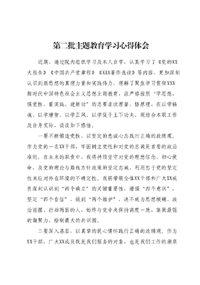 第二批主题教育读书班学习心得体会XXXXXX在学习贯彻XXX新时代中国特色社会主义思想主题教育工作会议上强调,要全面学习领会新时代中国特色社会主义思想,全面系统掌握这一思想的基本观点、科学体系,把握好这一思想的世界观、方法论,坚持好、运用好贯穿其中的立场观点方法。按照学习贯彻XXX新时代中国特色社会主义思想主题教育专题民主生活会有关要求,本人通过集体学习和个人自学等方式,在次重温了党的XX大报告、党章等重要内容,对新思想有了更加全面的认识。下面结合个人实际,跟大家谈几点心得体会。一、要坚定理想信念,树牢宗旨意识。XXXXXX指出:理想信念,就是共产党人精神上的钙。这句话令我深受启发。在过去的工作中,我们要始终保持共产党人的理想信念,坚定不移走中国特色社会主义道路。比如,我们市在抓经济建设的同时,始终把为人民服务作为根本宗旨,先后投资数十亿用于改善民生,让老百姓真正获益。这体现了我们坚定理想信念,始终把人民放在心中最高位置。下一步,我们要进一步加强党的建设,用XXX新时代中国特色社会主义思想武装头脑,筑牢信念之基;要严格要求党员干部心中装着人民,一切为了人民,始终牢记为人民服务的根本宗旨;要坚持正确政治方向,在思想上政治上行动上与以XXX同志为核心的党中央保持高度一致。二、要加强理论武装,筑牢思想之基。XXXXXX指出:理论武装整个党,理论武装广大干部特别是领导干部,是我们党的一项战略任务。这句话令我们深受教育。在过去的工作中,我们坚持把学习贯彻XXX新时代中国特色社会主义思想作为首要政治任务,不断推动全市党员干部提高政治判断力、政治领悟力、政治执行力。比如,我们先后组织了多场专题理论学习研讨班,还开设了线上理论学习平台,形成了学习教育常态化长效化机制,让广大党员干部受到充分理论武装。下一步,我们要持之以恒加强理论学习,把学习成果转化为推动各项事业发展的实际行动;要把学习XXX新时代中国特色社会主义思想作为头等大事,不断强化理论自觉,坚持学思用贯通确保各项工作落实落地;要广泛开展我为群众办实事实践活动,不断增强全体党员干部为人民服务的本领。三、要埋头实干苦干,再创佳绩佳效。XXXXXX指出:干部就是要干事,就是要担当作为。这句话深深鞭策我们。在过去的工作中,我们不断弘扬实干作风,勇于担当作为,为全市改革发展稳定作出应有贡献。比如,我们紧紧围绕年度目标任务,超额完成了上级下达的各项经济社会发展指标,得到了上级的表扬和肯定。下一步,我们要继续发扬作风建设永远在路上的精神,狠抓工作落实,以责任心和使命感统筹各项工作,确保各项任务落到实处;要殚精竭虑为企业发展解难题,让市场主体充分感受到党和政府的支持;要深入基层一线听取民声,努力办好民生实事,让人民群众获得更多实惠。四、要聚焦合格标准,树立良好形象。XXXXXX指出:党员干部就是党的窗口,就是党的名片。这句话警醒我们要时刻注意个人品行。在过去的工作中,我们严格要求全体党员干部遵守党纪国法,坚决反对特权思想和特权现象,努力树立党员干部良好形象。比如,我们先后开展领导干部德操教育,严肃处理个别违纪违法案件,通过典型案例警示教育,确保党员干部队伍风清气正。下一步,我们要进一步弘扬艰苦奋斗、勤政为民、公道正派的优良作风,做人民群众的贴心人、可靠人和良师益友;要坚持从严治党,持之以恒正风肃纪,严肃查处腐败问题,营造风清气正的政治生态;要强化党员干部的宗旨意识、规矩意识和道德意识,筑牢不敢腐、不能腐、不想腐的思想防线。