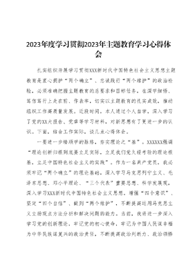 2023年度学习贯彻2023年主题教育学习心得体会扎实组织开展学习贯彻XXX新时代中国特色社会主义思想主题教育是衷心拥护两个确立、忠诚践行两个维护的政治检验,必须准确把握主题教育的总要求和目标任务,在深学细悟、笃信笃行上走在前、作表率,切实以主题教育的扎实成效,推动组织工作高质量发展。近段时间,本人通过个人自学,深入学习了党的XX大报告、党章等学习材料,对新思想有了更进一步的认识。下面,结合工作实际,谈几点心得体会。一要进一步缕顺学的脉络,夯实理论之基。XXXXXX强调理论创新归根到底要立足实际,立足我们党久经考验的理论根基,立足中国特色社会主义的实践。作为一名共产党员,我必须牢记两个确立的理论基础,深入学习马克思列宁主义、毛泽东思想、邓小平理论、三个代表重要思想、科学发展观,深入学习XXX新时代中国特色社会主义思想,增强四个意识、坚定四个自信、做到两个维护,不断提高运用马克思主义立场观点方法分析和解决问题的能力。当前,我将进一步深入学习党的创新理论,牢记党的初心使命,牢记为中国人民谋幸福为中华民族谋复兴的政治责任,不断提高政治判断力、政治领悟力、政治执行力。要坚持问题导向,紧密结合工作实际和实践需要,对理论学习进行系统梳理,找准理论创新与实践创新的结合点,推动理论创新向着实践创新延伸,不断开拓马克思主义中国化新境界。二要进一步明确新的基调,扬起创新之帆。我们党历来高度重视理论创新。党的十八大以来,以XXX同志为核心的党中央统揽伟大斗争、伟大工程、伟大事业、伟大梦想,提出和坚持一系列新的理论观点,形成XXX新时代中国特色社会主义思想,为新时代党和国家事业发展提供了根本遵循。这充分表明,我们党善于从实际出发推进理论创新。当前,我将进一步提高政治站位,牢固树立大局意识,深入学习XXX新时代中国特色社会主义思想,紧密联系工作实际,勇于推进理论创新、实践创新、制度创新,在推动经济高质量发展、社会事业进步上展现新作为。下一步,我将结合纪检监察工作实际,深入贯彻党的XX大和二十届历次全会精神,坚决落实中央八项规定及其实施细则精神,推动全面从严治党向纵深发展。三要进一步吹响行的号角,走实前行之路。我们党来自人民、根植人民,一切为了人民。全心全意为人民服务,是我们党的根本宗旨。站稳人民立场,我们就能赢得人心,团结奋斗的力量就更加强大。当前,人民对美好生活的需要日益广泛,不仅对物质文化生活提出了更高要求,也对民主、法治、公平、正义安全、环境等方面的要求日益增长。这就要求我们必须坚持以人民为中心的发展思想,坚持为人民服务这个根本宗旨。作为一名纪检干部,我将进一步坚持服务大局,坚持问题导向,坚持系统治理,坚持标本兼治,坚持受贿行贿一起查,坚持重遏制、强高压、长震慑,坚决查处政治问题和经济问题交织的腐败案件,坚决反对特权思想和特权现象,保持惩治腐败高压态势,坚决守住不发生系统性风险的底线,以实际行动维护人民群众权益,不负人民重托。通过此次学习,我将继续深入学习贯彻XXX新时代中国特色社会主义思想,以崭新精神风貌和务实作风,推动各项事业在新时代取得新成就。