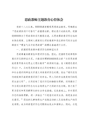 思政教师主题教育心得体会党的十八大以来,XXXXXX高度重视思想政治教育,明确提出思政课作用不可替代的重要论断。理论是行动的先导。现围绕XXXXXX关于思政课的系列重要论述,从思政课的意识形态性的本体论维度、立德树人高度的认识论维度和适应新时代的方法论维度对理直气壮开好思政课的理论基础进行分析。一、把握好思政课和意识形态的辩证关系思政课兼具教育性和意识形态性,因此,把握好思政课程和意识形态的辩证关系,才能深刻理解XXXXXX提出的办好思政课就是要开展马克思主义理论教育的深刻内涵。在《德意志意识形态》中,马克思恩格斯首次从历史唯物主义出发,在社会存在和社会意识的辩证关系意义考察意识形态问题,指出意识在任何时候都只能是被意识到了的存在,而人们的存在就是他们的现实生活过程,从而打破了意识形态的抽象性理解,进而揭示了作为观念的意识形态与社会物质生产之间的内在关联,使之有了更为坚实和更具解释力的社会存在基础。在此基础上,针对意识形态的抽象理解,进一步指出不是意识决定生活,而是生活决定意识。现实的从事物质生产实践活动的人及其物质生产的历史进程,成为考察意识形态问题的出发点和落脚点。同时,在现实的物质生产实践和交往过程基础上,建构起国家、社会组织及其观念的上层建筑。作为观念上层建筑的学校则是意识形态工作的重要组织,成为开展马克思主义理论教育的前沿和用XXX新时代中国特色社会主义思想铸魂育人的重要阵地。从而,也使社会主义德育为重要内容的思政课具有鲜明的社会主义意识形态性。这是因为,在马克思看来,任何一个时代的统治思想始终都不过是统治阶级的思想。而支配着物质生产资料的阶级,同时也支配着精神生产资料,因此,那些没有精神生产资料的人的思想一般地受统治阶级支配的。作为一定社会历史条件下精神生产的产出物即意识形态,本质上主要体现为统治阶级的思想,而统治阶级的特殊利益及其在观念上的诉求都被赋予了普遍性的形式并反作用于物质生产的全过程。这也决定了开好思政课,必须从思政课的意识形态性的本体论维度出发,牢牢把握意识形态的主动权,使社会主义意识形态贯穿于思政课的全过程,引导学生不断增强中国特色社会主义道路自信、理论自信、制度自信和文化自信,厚植爱国主义情怀,把爱国情、强国志、报国行自觉融人坚持和发展中国特色社会主义、建设社会主义现代化强国和实现中华民族伟大复兴的教学实践之中。这不仅仅是思政课必须直面的理论逻辑,也是党管教育百年历史经验的深刻总结,更是马克思主义意识形态理论的核心要义。二、把握好思政课和立德树人的辩证关系XXXXXX在党的XX大报告中强调,青年强,则国家强⋯⋯全党要把青年工作作为战略性工作来抓,用党的科学理论武装青年用党的初心使命感召青年,做青年朋友的知心人、青年工作的热心人、青年群众的引路人。从生命成长的规律出发,青少年正处在世界观、人生观和价值观形成的关键时期,不但需要精心引导,更需要遵循成长规律的培育。因此,XXXXXX指出,青少年思想政治教育是一个接续的过程,要针对青少年成长的不同阶段,有针对性地开展思想政治教育。正是在这个意义上,提出了思政课是落实立德树人根本任务的关键课程的重要论断。只有从立德树人高度的认识论维度领会这一重要论断,才可能从思想认识上坚定思政课独特的德育理念、目标和重点。首先,思政课要明确德育理念。2014年5月30日,XXXXXX在北京市海淀区民族小学考察时指出,学校要把德育放在更加重要的位置,努力做到每一堂课不仅传播知识、而且传授美德,让社会主义核心价值观的种子在学生们心中生根发芽。2016年9月9日,XXXXXX在北京市八一学校考察时强调,基础教育是立德树人的事业,要旗帜鲜明加强思想政治教育、品德教育,加强社会主义核心价值观教育,引导学生自尊自信自立自强。XXXXXX的系列重要讲话,从认识论的高度为正确处理思政课与立德树人的辩证关系提供了根本遵循。思政课要坚决贯彻XXXXXX提出的德育课程理念建构起知识传习、素质提升、能力提高与价值引领相融合的德育课程,更为充分地发挥好思政课的立德树人作用。其次,思政课要明确德育目标。XXXXXX指出,我们培养人的目标是什么要搞清楚,现在非常明确坚定地提出要培养社会主义建设者和接班人。思政课的德育目标就是要通过马克思主义基本理论的学习,使学生学习掌握马克思主义的立场、观点和方法,进而经由精神建设这一思想路径,引导学生树立正确的世界观和人生观,在大是大非问题上做出正确抉择。再次,思政课要明确德育重点。开设思政课,其重点是培养德智体美劳全面发展的社会主义事业的建设者和接班人,而不是培养精致的利己主义、旁观者,更不是反对者。为此,XXXXXX指出学校是党领导的学校,是中国特色社会主义的学校,马克思主义是我们立党立国的根本指导思想,中国特色社会主义是中国学