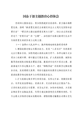 国企干部主题教育心得体会党的XX大报告指出,要加快构建新发展格局,着力推动高质量发展,强调高质量发展是全面建设社会主义现代化国家的首要任务要坚持以推动高质量发展为主题。XX企业必须把握好这个首要任务和主题,加快提升铁路运输现代化水平为高质量发展提供有力运输支撑。(一)坚持以人民为中心,提升铁路运输服务质量效率1.增强铁路运输公共服务能力。发展人享其行的铁路客运出行服务系统。加快构建以高铁运输为骨干,各种运输方式合理分工的城市群、都市圈出行服务系统。扩大高速铁路、城际铁路等高时效性运输服务覆盖范围,提高动车组列车客运比重,提高普通列车客运服务水平。建设物畅其流的铁路货运物流服务系统。发展规模化集聚、网络化辐射的铁路货运物流组织方式提高铁路货物运输效率与全程跟踪服务能力。2.扩大铁路运输多样化有效供给。在客运方面,根据实际需求,有序发展按需响应、资源共享、灵活舒适的出行服务产品,以更好满足旅客出行需要。在货运方面,加快冷链物流、大宗商品物流等专业物流发展。利用交通运输结构优化调整的契机,引导公路大宗物资运输向铁路转移,增强铁路运输服务对需求变化的适应性和灵活度。3.促进铁路运输新业态新模式健康发展。把握现代信息技术发展机遇,提高铁路运输线上线下服务能力。以交旅融合为导向,推动旅游旅游客运服务。大力推进专业物流系统培育建设加快发展高铁快运等高质量专业物流。(二)坚持重本夯基,增强铁路运输支撑保障能力1.精准补齐铁路运输发展短板。加快川藏铁路、沿江高铁、渝昆高铁、西(宁)成(都)铁路等重大工程规划建设。积极融入都市圈轨道交通网络建设,推动都市圈干线铁路、城际铁路、市域(郊)铁路、城市轨道交通等多网融合发展。2.超前谋划布局新一轮铁路基础设施建设。推进新一代高速磁悬浮交通系统试验线建设和试点布局,根据技术试验情况适时推进超高速铁路示范线路建设。依托以八纵八横为主骨架的高速铁路网,建设适应跨区域运输服务需求、服务品质高、运行速度快的高品质铁路网。打造智慧铁路运输枢纽,以现代信息技术为媒介,将高铁客运站打造成为汇集各类客流、商流、资金流信息流的城市智慧中枢。加强综合开发,合理确定客运站及周边区域用地布局、规模和范围。提升开发品质,有序拓展客运站商业服务功能。(三)坚持绿色安全发展,增强铁路运输发展后劲1.推进铁路运输绿色低碳发展。探索推广使用交-直-交电力机车,提高铁路机车牵引效能水平。利用国家优化调整运输结构的契机,发挥铁路在大宗货物中长距离运输中的骨干作用,有效节能减排。推动新材料、新技术、新工艺在铁路运输领域的广泛应用,有效防治铁路沿线噪声、震动。加强铁路基础设施生态选线,减少铁路运输对生态敏感区域的影响。2.提高铁路运输安全性和可靠性。坚持预防为主、综合治理的方针,提高铁路安全意识和治理能力。完善铁路安全生产责任体系,强化安全事前预防及风险防控能力。强化企业安全生产主体责任,深入推进铁路安全生产标准化建设和风险管理。鼓励支持智慧物联网等新技术、新方向,进一步夯实铁路安全生产保障体系。3.构建铁路安全风险防控体系。提升铁路运输应急风险防控能力,健全铁路运输应急风险防控机制,构建全方位铁路运输应急救援体系。(四)坚持技术创新和体制改革,形成新发展动能1.扩展智能技术应用领域。优化完善覆盖智能建造、智能装备、智能运营等领域的智能铁路技术体系、数据体系和标准体系研发打造铁路智能综合调度系统,进一步推广应用电子客票。基于人工智能、大数据等优化铁路综合枢纽运输组织,推动与之相衔接的各种运输方式实现信息互通、组织衔接。2.深化铁路运输重点领域和关键环节改革。在有条件的地方试点城际铁路、市域(郊)铁路等网运分离和多网融合盘活铁路枢纽周边土地资源,带动轨道交通周边土地联动开发,建立公开透明、公平合理的铁路清算和分配机制。深化铁路投融资体制改革,多渠道盘活存量优质资产,支持有条件的铁路企业上市,依托具有较好盈利前景的项目实施债转股、资产证券化等试点。(五)注重交互融合,更好服务国家战略实施和社会发展1.助力构建全面开放新格局。以扎实推进国际经济合作走廊建设、为高质量共建一带一路、陆海新通道建设当好先行为牵引,聚焦关键通道、关键城市和关键项目,着力联通陆路,推动中国高铁走出去,推进与周边国家开展交通基础设施互联互通合作。2.支撑国家重大战略实施。如构建京津冀协同发展的一体化网络,要求加快干线铁路和城际铁路建设,强化干线铁路与城际铁路、城市轨道交通的高效衔接。建设长江经济带综合立体交通走廊,要求构建功能更加完善、层次更加清晰的沿江铁路运输体系,加快推进沿江高速铁路建设,推进区域间重要普通铁路建设3.推进铁路运输与区域经济深度融合发展。依托铁路运输通道,培育壮大沿线新极点和经济合作走廊,形成区域经济带状联动