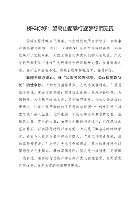 榜样你好:望高山而攀行逐梦想而无畏壮阔征程呼唤当代青年,伟大时代赋予全新使命,崇高事业需要榜样引领。近日,《榜样8》专题节目持续热播,全方位展示了默默奉献、无怨无悔的优秀党员们的人生轨迹。广大年轻干部要从榜样先进事迹中汲取精神力量,挺膺青春之姿,在平凡中创造不凡,在新征程中扬帆逐梦、奋勇前行。攀理想信念高山,逐风雨多经志弥坚,关山初度路犹长的使命梦。树之茂盛靠根深,人之忠诚靠铸魂。理想信念是魂,魂固方能神聚;理想信念是根,根深方能叶茂。为国铸盾、矢志强军的钱七虎,用赤诚写传奇、以初心铸成就的唐菊兴,让每个孩子都能放飞梦想的刘玲琍……榜样们把对党忠诚融入血脉、化作基因,不断从中汲取真理的力量、创新的力量、实干的力量,虽曾处于困顿与逆境中,但理想信念坚若磐石,以实际行动践行着为党、为人民不懈奋斗的铮铮誓言,成长为人民护卫者和群众护路人。看似寻常最奇崛,成如容易却艰辛。对于广大年轻干部而言,要在追逐榜样中以理想坚定人生朝向,厚植家国情怀,同人民一道拼搏、同祖国一道前进,用实际行动践行中国共产党人在党言党、在党爱党、在党忧党、在党为党的崇高理想理念。攀不负人民高山,逐勤勉敬业守初心,甘为驻村螺丝钉的民生梦。民为邦本,本固邦宁。无论是带领乡亲绘就农村现代画、走出一条强富美高的乡村振兴之路的吴惠芳;还是治病治心治贫、让村民更幸福的李桂科;又或是让居民生活像花儿一样、把维护民族团结作为社区最大的事的热孜万古丽·沙吾提,他们心系人民、苦干实干,用赤子之心解民困,用关切之心纾民忧,他们的身影成为了居民们最坚实的依靠。民心是最大政治,民生是头等大事,作为年轻干部要深入基层、了解民情,倾听群众的真实需求和期望,成为他们可信赖的贴心人,将全心全意为人民服务书写在日常工作中,将初心使命擘画在乡土大地和百姓心中,以实际行动和不懈的努力,把人民对美好生活的向往作为始终不渝的奋斗目标,为他们的幸福生活付出最大的努力和真情。攀敢想敢为高山,逐栉风沐雨自担当,越是艰险越向前的实干梦。XXXXXX强调:干部不仅要有担当的宽肩膀,还得有成事的真本领必须做到能力过硬,不断掌握新知识、熟悉新领域、开拓新视野。敢担当才能展现大作为。高原耕耘者唐菊兴立足自身过硬专业技能高原探矿,做好科学研究,解决经济社会发展的资源问题,崎岖山路彰显地质报国本色;横坎头村党委红绿结合、漫漫求索,形成了党群齐心、锋领过坎的强大合力,绘就了创富致富带富帮富引领共富的美好画卷。惟其艰难,方显勇毅,年轻干部要汲取榜样身上克服万难、勇往直前的奋斗精神,在为党分忧、为国尽责、为民奉献中知行合一、主动担当、积极作为,不做怕见风雨的泥菩萨,通过实践锻炼把弱项变成擅长项,把短板变成潜力板,把痛点变成发展点,心无旁骛地躬耕于新征程,持之以恒走好新时代的赶考路。