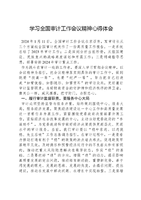学习全国审计工作会议精神心得体会2024年1月11日,全国审计工作会议在京召开,X审计长从三个方面向全国审计机关作了一份高质量工作报告,一是系统总结了2023年审计工作;二是深刻分析当前形势,从强国建设、民族复兴的战略高度谋划和开展工作;三是明确指导思想,部署安排2024年审计重点工作。作为战斗在审计一线的工作者,要深入学习贯彻会议精神,以会议精神为指引,把会议精神落实到具体的审计工作中,做到既要技高一筹,也要纪严一等,努力把自己打造成如臂使指、如影随形、如雷贯耳的审计尖兵,更好履行审计监督职责,当好财政资金的守护神和经济秩序的捍卫者,像关公一样,威风凛凛,把守财门,赤胆忠心。一、履行审计监督职责,要服务中心大局审计必须坚持监督与服务并重,始终做到围绕中心、服务大局,服务经济发展,聚焦经济建设这一中心工作和高质量发展这一首要任务开展工作。紧紧围绕党委政府决策部署开展工作,紧贴经济社会改革发展的中心,主动当好党委政府的参谋助手,为党委政府科学做好经济决策提供更高层次、更高水平的审计服务。当前,我们审计要以稳中求进、以进促稳、先立后破工作总基调为指引。在审计过程中,一是要着力推动打通有利于稳的政策的淤点堵点难点,促进政策早落地早见效,及时揭示和预警经济运行中的不良苗头和有害倾向,推动把重大风险隐患解决在萌芽状态,夯实稳的基础。二是要把好进的方向,增强进的动力,揭示影响高质量发展的突出问题,推动培育新动能、重塑新优势,善于用发展的眼光、发展的思维、发展的角度,去揭示问题、提出建议,推动在发展中解决问题、在增长中实现转型。三是要增强立的意识,坚定破的决心,要始终坚持实事求是的态度和立场,对于审计的事项,首先应该有个判断,明确要达到立的审计目标,然后朝着这个目标去推进。在这个目标未明确之前,要审慎提出破的建议。要坚定破的决心。对于阻碍高质量发展的体制性障碍、机制性弊端,该破的要在立的基础上坚决破,对于看准了的问题要准备好打持久战,久久为功,直到把阻力、障碍扫清为止。当下,我们要以高昂斗志、心无旁骛、全身心投入到国债项目资金跟踪审计中,努力揭示存在的突出问题,提出合理建议、推动有效整改,促进各项工程建设成为民心工程、优质工程、廉洁工程,充分发挥国债资金效益,为中国式现代化X新篇章、建设经济强省美丽X作出积极贡献,以优异成绩迎接中华人民共和国成立75周年!二、履行审计监督职责,要做实研究型审计立足经济监督定位,聚焦财政财务收支真实合法效益主责主业,站在经济社会发展全局高度审视自身工作,从促进经济社会长远发展角度,深入开展研究型审计,提出科学化、合理化意见建议,切实把审计监督实效转化为推动经济社会高质量发展的强大动能。一是围绕中心、服务大局去研究。善于站在全局和战略的高度思考问题,紧紧围绕党委政府决策部署进行研究,紧贴经济社会改革发展的中心。积极与被审计对象对接沟通,收集研究党中央、国务院、各部委和省委省政府新的决策部署、指示要求、政策法规,找准审计职责定位,精准审计方向内容,始终做到党委政府工作中心是什么,审计就审什么。二是围绕揭示重大问题、防范重大风险隐患去研究。要结合实际,有针对性的开展研究工作。通过走访调研、座谈询问、查看相关资料等方式调查了解并掌握被审计单位财务收支、管理体制、机构设置、人员编制、财务隶属关系、财务核算流程、内部控制制度等情况,从中找出政策落实中的难点、堵点,进而确定审计的重点和目标。三是围绕创新审计方法、提升审计质量去研究。本着提升现场审计效率、保证审计质量的目的,强化审计实施方案的研究讨论。针对实施的审计项目,要早谋划、早准备、早着手,通过开展充分的审计调研,详细了解被审计单位具体情况,找出可能出现问题的环节、事项、部门,充分发挥民主,集思广益、深入讨论、反复研究,不断提升审计实施方案的操作性、指导性、约束性,进一步防范审计风险。三、履行审计监督职责,要勇于创新担当在新的背景和形势下,审计人在履行好审计监督职责方面,要勇于创新担当,真抓实干,既能治已病,又能防未病,既要能查处大案要案,揪出贪污腐败分子,清除社会主义经济建设大厦的蛀虫;又要能提出合理的审计建议,能够让被审计单位心服口服地进行整改,为省委、省政府的经济决策提供有利依据。具体体现在以下方面:(一)积极学习探索,提高素质。一是要深入学习XXX新时代中国特色社会主义思想,深刻领悟两个确立的决定性意义,增强四个意识,坚定四个自信,坚决做到两个维护。二是要通过审计大讲堂、网络培训、学习强国、X干部网络学院和厅里组织的各类学习,不断扩展知识面,优化知识结构,不断夯实思想理论功底。三是要积极学习业务知识,尤其大数据审计方面的知识,不断提高自己的业务水平,紧跟审计工作的时代步伐,适应大数据审计模