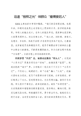 追逐榜样之光做群众最需要的人XXX主席在新年贺词中强调,我们的目标很宏伟,也很朴素,归根到底就是让老百姓过上更好的日子。孩子的抚养教育,年轻人的就业成才,老年人的就医养老,是家事也是国事,大家要共同努力,把这些事办好。钱七虎、刘玲琍、唐菊兴、吴惠芳、李桂科、热孜万古丽·沙吾提等优秀共产党员,扎根基层,发挥着党员先锋模范作用。党员干部要在学习榜样的力量中点燃奋斗的激情,不断提高履职能力,努力在新征程中找准方向感,在新征程上书写崭新的华章。怀揣梦想向前走,做推动发展的带头人。村民的小吴书记吴惠芳用行动发电、绘制发展蓝图,托起农民的城市梦。乡村振兴一线还有千千万万个小吴书记,不忘初心、砥砺前行,将小我融入大我,把振兴目标变为现实。党员干部要带头学习提高,在学真悟实、学以致用上下功夫,坚定理想信念,充实思想头脑,指导行为实践。带头提升干事创业、改革创新能力,破除本领恐慌,在实践锻炼中增强推动高质量发展、服务群众、解决问题、防范化解风险本领,积极履职尽责,勇于担当作为,做起而行之的行动者、当攻坚克难的奋斗者。面对改革发展稳定任务,要在实践中求真知、找规律、积经验,不断增强群众意识,提高群众工作能力,成为工作岗位上的行家里手。脚踏实地向下迈,做群众认可的贴心人。热孜万古丽·沙吾提履职尽责,为社区的大小事情操碎了心、跑断了腿,被喜爱她的居民亲切地称为解忧送暖的花儿书记。平凡的工作用不厌其烦的重复、日复一日的坚持,也能做出伟大的事业。党员干部要扑下身子、脚步向下、沉到一线,多到困难多、群众意见集中、工作打不开局面的地方,与群众坐在同一条板凳上唠家常,与百姓吃同一个锅里饭问冷暖,既听顺风话也听逆耳言,及时回答问题、解疑释惑、化解矛盾,着力集民智、聚民心、汇民力,真心实意切实解决群众难题。要践行新时代枫桥经验,弘扬四下基层优良传统,以百姓之心为心,会说百姓话,倾听群众事,看透群众表情,拉近与群众的距离,做群众认可的贴心人,让群众的心更暖意更顺。立足岗位向上攀,做百姓信赖的守护人。中国好医生李桂科用40多年的坚守,诠释医者仁心;用40多年的陪伴,书写大爱之心;用40多年的耕耘,践行入党初心。党员干部要立足岗位努力拼搏、开拓创新,以昂扬向上的进取精神,坚定不获全胜决不收兵的决心,在脱贫攻坚战中全力以赴;以冲锋在前的担当精神,践行我是党员我先上的初心,在风雪路上不畏艰难,昂首向前;以越是困难越向前的斗争精神,怀揣请党放心,强国有我的信心,奋斗在基层一线自信自强。要心中有人民,以群众满不满意、高不高兴、答不答应作为工作出发点和落脚点,解决好群众的心头儿事,把惠民生的事办实、暖民心的事办细、顺民意的事办好,推动党的各项决策部署落地生根,做百姓信赖的守护人。