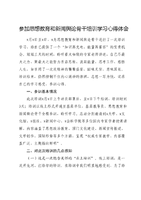参加思想教育和新闻舆论骨干培训学习心得体会x月x日至x日,x为思想教育和新闻舆论骨干进行了一次培训学习,给自己提供了一个知识再充电、能量再蓄容的宝贵机会。短短三天的时间,聆听着大咖级的专家老师讲述,自己尽最大之力、聚最大之能努力开启思维、汲取能量、思考工作、感悟人生,如享用了一次次精神的饕餮盛宴,回味无穷,意味深长。培训结束,仍然抑制不住内心涌动的澎湃,总想一写为快,记录自己的学习感受,参训心得。一、参训基本情况此次培训x月x日上午动员部署后,至x日下午结训,培训时间3天;培训以线上形式开通至基层单位,基层教导员、思想教育和新闻舆论骨干全程参训,聆听学习。总站分别邀请到x大学、x文化馆、x报社、x新闻中心、x会科学院等多位国内专家学者授课讲解,内容涵盖了思想政治教育、国门文化建设、新闻宣传报道、文学创作、国际形势等多个方面,呈现权威专家教学、内容覆盖广泛、主题指向鲜明。二、对此次培训的几点感知(一)这是一次饱含关怀的云上培训。线上培训,是一次开先河、打烙印的培训。在培训中我们明显地感受到,为了给基层同志举办好此次培训班,x用心良苦,从课程设置、培训方式都能让基层同志感受到x党委寄予了很高的期望。线上培训,集中组织难度大,但x从具体承办到处领导全程跟踪问效,基层聆听学习,x举办方也全程参训,尽最大可能确保培训效果。科学统筹、通盘考虑、举办也参加的工作作风也给基层树了方向,立了标杆(二)这是一次充实有效的蓄能充电。学习如蓄电池,一生需要不间断充电蓄能,才能始终保持工作劲头和人生活力。此次培训班,x在各项任务十分繁重的情况下开展,是继总站四会政治教员云上擂台赛之后,对云上政工的又一次探索。初衷目的就是给大家培训充电蓄能,专家讲解、记者经验分享、内部互动交流……精心的课程安排,通过线上培训的方式,让全省思想教育和新闻舆论骨干接受了新信息、新理念,汲取了新知识,增加理性思考,以新的思维、新的眼光、新的姿态思考谋划思想教育和新闻舆论工作。一个个新鲜前沿的理念、一桩桩深遂经典的案例,一段段饱含深情的阐释,引发出自身对工作、对经历、对人生的全新感悟和深度思考。同时,总站主动思考,创新方式的工作作风也提醒我们:要始终保持在研究状态下工作推陈出新,打造特色。(三)这是一次灵活多元的视野开拓。此次培训班,总站政治处竭尽所能为大家邀请全省乃至全国知名专家学者。无论是周边国家形势与新形势下思想政治工作的结合,还是新闻采写与文学创作的有效对接,授课教授都是深入浅出,鲜活的样板、久经积累的工作经验都是信手拈来,饱含深情的阐释,无一不让我感受到思维能量的巨大撞击,引发对新形势下思想教育与新闻舆论的全新感悟和深度思考。开拓的视野是领导干部的大脑和双翼,必须始终保持宏观、开放、创新、优化的状态,善于学习,超越陈规,才能积极焕发勇往直前的工作动力,打造丰富全新的智慧人生。(四)这是一次沉淀自己的静心思考。任务繁重了,工作干久了,不自觉地容易萌生浮躁;书读少了,思维定式了,眼光狭隘了,推陈出新越发显浅薄。特别自己从事宣传教育文化岗位,一个理念先行、眼光前瞻的工作岗位,由于缺乏知识更新和学习研修,经常感觉精品佳作总出不了新思路,总站不上新高点总找不开新视野,忙于落实,疲于应付,零敲碎打,形成工作低层次徘徊的怪圈,如井底蛙般困挠自己。总站的此次培训突如醍醐灌顶般打开思维双翼,沐浴心灵深处。白天聆听名师讲授,晚上开展线上交流,这是一种久违却非常亲切的学习感觉,让心安静下来,畅游知识海洋,领略理论风采,思考智慧人生。三、下步工作的几点启发启发一:思想教育和新闻舆论工作需要弘正气、扬号角。如何评价思想教育和新闻舆论工作做的好不好,其中最为关键的就看是否体现时代前沿的号角,是否引领一个时代风尚,是否具有鲜明的思想立场,是否彰显主流的价值观。全省思想教育和新闻舆论骨干责无旁贷地扛起了这份关键的重任,通过一件件新闻作品、一幅幅图片瞬间、一次次一线采访,去挖掘发现、传递报道云岭雄关一线的感人事迹,让在边境密林深处、交通不便、条件艰苦的基层单位、抵边警务室坚守的民辅警,受到社会各界的关心关注,从而进一步增强广大民辅警归属感、获得感。同时思想教育和新闻舆论只有聚焦中心主业、紧跟形势任务才能有益事业、永葆活力。始终把镜头、笔触倾注到全体民辅警坚守岗位忘我奉献维护边境安全稳定上,让思想教育和新闻舆论弘正气、扬号角,接地气,近警心。启发二:思想教育和新闻舆论工作需要有人物,有故事。任何一项工作都需要人去执行去完成,去执行就会有故事,所有的人物会有故事,所有的故事都是人物的关系。做好移民管理机构思想教育和新闻舆论工作需要从人物入手,从小处着眼。我们常年驻守边境一线,一名民警就是一本故事荟,每一个故事都有不同的众多感人细节。作为思想教育和新闻舆论
