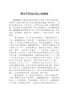 青年干部培训班心得感悟XXXXXX在2024年春季学期中央党校(国家行政学院)中青年干部培训班开班之际作出重要指示强调,新征程上,年轻干部重任在肩、大有可为,必须牢记初心使命、顽强拼搏进取,奋力跑好历史的接力棒。青年兴则国家兴,青年强则国家强,XXXXXX的叮嘱字字千钧。年轻干部当紧握接力棒,坚定信仰、迈稳脚步、锚准目标、接续奋斗,才能不负时代、无愧使命。一要坚定信仰,以少年应有鸿鹄志,当骑骏马踏平川之志,紧握理想信念接力棒。回望党的百年历史,是万千忠骨,万千热血以灼热的信仰信念、炽烈的家国情怀,书写出可歌可泣的壮丽篇章。XXXXXX指出,理想信念就是共产党人精神上的钙,没有理想信念,理想信念不坚定,精神上就会缺钙,就会得软骨病。心有所信,方能行远;学有所悟,而后笃行。年轻干部应把坚定理想信念作为人生的头等大事、终身课题常修常炼。既要坚持长线学习,以日拱一足的功夫追求以今日之我胜昨日之我的目标,从百年党史中补钙壮骨、固本培元,领悟中国共产党为什么能、马克思主义为什么行、中国特色社会主义为什么好;也要注重融会贯通,自觉运用党的创新理论武装头脑、指导实践、推动工作,把理想信念建立在对科学理论的理性认同上,建立在对历史规律的正确认识上,建立在对基本国情的准确把握上,从而做到绝对忠诚、绝对纯洁、绝对可靠。二要迈稳脚步,以海压竹枝低复举,风吹山角晦还明之势,紧握实干担当接力棒。XXXXXX指出:要坚持艰苦奋斗,不贪图安逸,不惧怕困难,不怨天尤人,依靠勤劳和汗水开辟人生和事业前程。艰苦奋斗是我们党的传家宝,一部中国共产党党史就是一部艰苦奋斗史。长征路上红军啃树皮过草地,克服了环境陌生、物资缺乏、不断减员的各种困难,最终不仅取得了战略转移的胜利还赢得了人民群众的信任;罗布泊上空升腾爆炸的蘑菇云和浩渺太空中卫星传回的《东方红》见证着科学家们扎根戈壁荒原、奋战深山峡谷隐姓埋名的20余载岁月。历览前贤国与家,成由勤俭败由奢。年轻干部要想克服依赖心理、洗掉书生气,就应当自找苦吃,担子要拣沉的挑、任务要冲难的选,勇于到条件艰苦的基层、国家建设的一线、项目攻关的前沿经受锻炼、增长才干,直面各种挑战和困难。通过实干苦干锤炼意志、积累经验,方能在心态和能力上做到把攀山越水当寻常事,将狂风暴雨作平常天。三要锚准目标,以月缺不改光,剑折不改刚之姿,紧握开拓创新接力棒。一切伟大成就都是接续奋斗的结果。2023年国产大飞机C919穿过象征民航最高礼仪的水门,标志着我国在民航领域的新突破。从运-10的遗憾夭折到C919成功交付商用,中国自主制造大飞机梦想期间历经50载终破茧成蝶。一代又一代科研人员用十年磨一剑实现了163项关键技术、1935项专利、2.4万项标准规范,突破国际垄断壁垒。从理论创新到科学发现,创新改变着人类社会发展的轨迹,给各个领域带来巨大效益。XXXXXX指出惟创新者进,惟创新者强,惟创新者胜。安于现状,只会畏缩不前;创新迭代,才能勇往直前。面对前进道路上层出不穷的新情况新问题,年轻干部要以十年如一日默默奉献的科研人员为榜样,时刻保持清醒头脑和危机意识,敢于以民生需求为导向提出问题聚焦问题;勇于解放思想积极应变,找新出路、想新办法;善于以钉钉子精神把创新思维转化为创新能力逐个突破卡脖子问题。机遇总是留给有准备的人,咬定创新不放松,方能在危机中育先机、于变局中开新局。