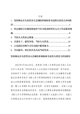 目录1.坚持和完善人民代表大会制度积极探索全过程人民民主的X路径.12.坚定制度自信强化使命担当全力推动新时代人大工作高质量发展.83.当好人大代表之我见134.善谋实干,创先争优,当好人大代表165.立足岗位不断学习在实践中提升能力196.学以致用,知行结合为人民当好代表21坚持和完善人民代表大会制度积极探索全过程人民民主的X路径2023年9月4日至9日,我参加了X市人大常委会在全国人大会议中心举办的2023年地方人大代表和干部培训班学习培训。分别聆听了全国人大常委会原副秘书长、全国人大法律委员会原副主任委员李连宁《深入学习贯彻XXXXXX关于坚持和完善人民代表大会制度重要思想,坚持和完善人大制度》,国防大学杰出教授、博士生导师X《认清百年变局,从容应对挑战》,全国人大监察司法委员会原副主任委员、全国人大常委会原副秘书长韩晓武《深入学习贯彻XXX法治思想,努力做好人大监督工作》,全国人大常委会办公厅培训中心原主任、联络局原副局长李维国《新时代人大代表如何履行职责》,全国人大常委会办公厅研究室原主任、全国人大财政经济委员会原副主任委员尹中卿《我国当前经济形势—回顾与展望》,全国人大常委会办公厅研究室四局副局长王海冰《深入学习贯彻党的XX大精神,做好人大工作》的讲授和专题辅导报告。通过学习培训,深刻理解了XXXXXX关于坚持和完善人民代表大会制度重要思想和XXX法治思想,对风云变幻的国际形势和我国当前经济形势有了更深入的认识,增强了新时代人大代表履行职责、做好人大工作的责任感、使命感,进一步提升了政治站位、理论素养和履职能力,为更好的履行人大代表和人大工作者职责奠定了理论和法治基础。现将学习心得体会报告如下。一、认清国际国内形势,科学把握战略机遇和风险挑战XXXXXX在党的XX大报告中指出,当前,我国发展进入战略机遇和风险挑战并存、不确定难预料因素增多的时期,各种黑天鹅灰犀牛事件随时可能发生,必须时刻做好准备经受风高浪急甚至惊涛骇浪的重大考验。世界百年未有之大变局加速演变世界之变、时代之变、历史之变正以前所未有的方式展开。中国未来面临全球体系重大调整,世界出现分裂风险;大国博弈更加激烈,美国更加急于对中国进行打压遏制;地缘政治冲突加剧,局部危机可能演变为全局性危机;国内不平衡不充分发展问题突文可居文库——海量学习资料,手机电脑均可下载www.wenkeju.com出,影响经济社会全面协调可持续发展的因素增多四类重大风险挑战。面对严峻复杂的形势和各类挑战,我们一要强化底线思维极限思维,在急剧变化的世界中守好国家安全底线,推进国家安全体系和能力现代化;二要弘扬伟大斗争精神,高度重视国家凝聚力和民族斗争精神培育,树立牢固的必胜信念;三要切实贯彻新发展理念,构建新发展格局,推动经济社会高质量发展。二、坚持和完善人民代表大会制度,坚定不移走中国特色社会主义政治发展道路人民代表大会制度是坚持党的领导、人民当家作主、依法治国有机统一的根本政治制度安排,是支撑中国国家治理体系和治理能力的根本政治制度。党的十八大以来,XXXXXX继续推进人民代表大会制度理论和实践创新,提出了一系列新理念、新思想、新要求,主要表现在:坚持中国共产党的领导;坚持用制度体系保障人民当家作主;坚持全面依法治国;坚持民主集中制;坚持中国特色社会主义政治发展道路;坚持推进国家治理体系和治理能力现代化。在新的历史条件下,坚持和完善人民代表大会制度对于坚持和完善人民当家作主制度体系,发展社会主义民主,充分发挥中国特色社会主义制度和国家治理体系优越性,具有十分重要的意义。实践已充分证明,人民代表大会制度是符合中国国情和实际文可居文库——海量学习资料,手机电脑均可下载www.wenkeju.com体现社会主义国家性质、保证人民当家作主、保障实现中华民族伟大复兴的好制度。在新时代坚持和发展中国特色社会主义、实现中