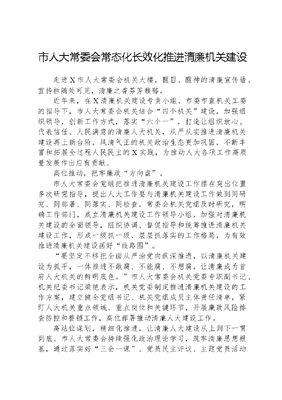 市人大常委会常态化长效化推进清廉机关建设走进X市人大常委会机关大楼,醒目、醒神的清廉宣传语、宣传栏随处可见,清廉之香芬芳馥郁。近年来,在X清廉机关建设专责小组、市委市直机关工委的指导下,市人大常委会机关结合四个机关建设,加强组织领导,创新工作方式,落实六个一,打造让组织放心、代表信任、人民满意的清廉人大机关,从严从实推进清廉机关建设再上新台阶,风清气正的机关政治生态更加巩固,不断丰富和拓展全过程人民民主的X实践,为推动人大各项工作高质量发展作出应有贡献。高位推动,把牢廉政方向盘。市人大常委会党组把推进清廉机关建设工作摆在突出位置多次研究指导,提出人大工作要与清廉机关建设工作做到同研究、同部署、同落实、同检查。常委会机关党组及时研究,明确工作部门,成立清廉机关建设工作领导小组,加强对清廉机关建设的全面领导,组织协调、督促指导和统筹推进清廉机关建设工作,形成一级抓一级、层层抓落实的工作格局,为有效推进清廉机关建设画好线路图。要坚定不移把全面从严治党向纵深推进,以清廉机关建设为抓手,一体推进不敢腐、不能腐、不想腐,让清廉成为首府人大机关的鲜明底色。市人大常委会机关党委专职副书记、机关纪委书记梁艳表示,机关党委制定推进清廉机关建设的工作方案,建立健全党组书记、机关党组成员主体责任清单,紧盯人大机关重点领域、重点岗位和关键环节,开展廉政风险排查防控和整顿工作,高位部署推动清廉人大建设工作。高站位谋划,精细化推进,让清廉人大建设从上到下一贯到底。市人大常委会持续强化政治理论学习,筑牢清廉思想根基,通过落实好三会一课、党员民主评议、主题党员活动日等制度,把清廉机关建设融入到立法、监督、代表工作等各工作环节,确保了机关党员干部清廉思想更加坚定、法纪观念更加牢固、权力运行更加规范、担当作为更加自觉。创优阵地,讲好人大廉洁故事。抓住了宣传阵地,就是抓住了廉政宣传的关键。市人大常委会精心打造人大机关党建文化墙,设立清廉读书角,同时利用人大一刊一网一栏一屏两微平台,多角度、全方位宣传清廉文化,营造积极向上、风清气正的浓厚氛围。我们在X人大官方网站、微信公众号等平台,一直保持工作日每日更新推送的频率,人大干部职工和广大代表也养成了每天阅读的习惯。市人大常委会调研室副主任XX表示。党员干部的工作作风,对于建设清廉机关至关重要。为此市人大常委会全面加强机关党组织和干部队伍建设,强化党风廉政教育,督促干部职工从自己做起、从现在做起、从点滴做起,严守党章党规党纪,做廉洁自律的表率。作为一名新时代人大系统工作者,我要严格执行各项廉政规定,筑牢党员干部清廉防火墙,增强清廉的内生动力,树立人大机关干部的良好形象。市人大监察和司法委员会办公室主XX说。近年来,市人大常委会举办了多场以清廉文化为主题的演讲比赛,机关干部职工从不同层面、不同角度,以热诚朴实的情感、深情激昂的语言,展现忠诚、干净、担当、奉献的精神风貌,传递爱国、爱党、爱岗的正能量。市人大常委会办公室行政接待科副科长XX表示,通过参与创建清廉机关,进一步增强廉洁意识、底线意识,在今后的工作中,将时刻保持纪律意识、规矩意识,警醒自身,以更加昂扬的精神风貌和务实的工作作风,立足岗位、争先创优,为推动首府人大高质量发展贡献个人力量。服务中心,推动创建工作提质增效。人大代表是人民行使国家权力的代表,是国家权力机关的文可居文库——海量学习资料,手机电脑均可下载www.wenkeju.com组成人员。市人大常委会机关在清廉机关建设中,将人大代表作为创建践行的主体,强化清正廉洁作表率的代表引领作用。让代表认识到廉洁的重要性,在履职过程中自觉强化廉洁意识,从而更加心无旁骛地联系群众、服务群众。市人大常委会选联工委副主任X介绍。自参加创建清廉机关学习活动以来,我对廉政文化有了更深入的认识和理解,作为一名基层党员干部和人大代表,要时刻牢记党的宗旨,甘于做人民的公仆,严格要求自己,廉洁从政。市人大代表,X区X街道秀和社区党委书记、居委会主XX表示,将始终把群众的利益放在第一位,以满腔的热情和高度负责的态度对待群众,努力在自己的岗位上为群众谋利益,扎实开展走访调研,实现清廉与人大工作双提升,进一步拉近人大代表与群众之间的距离,切实为人民群众做好事、办实事。推进清廉机关建设,最终落脚点是抓好发展。市人大常委会以五比五促为抓手,把清廉机关建设融入党建引领推进四个机关建设活动,转作风促学风树新风,实现党建与业务双提升。市人大常委会机关X个党支部与各县(市、区)16个人大代表联络站及基层立法联系点联建,推动站点深度融合,带动建成一批示范站点。丰富站点活动内容,探索创新联络站+模式,推进三官一员进站点联系人大代表服务群众工作,把维护稳定的工作做到社会最前沿