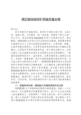 用正确政绩观引领高质量发展同志们:树立和践行正确政绩观,是领导干部的为政之德、从政之道、施政之要,不仅事关一地一域发展,更事关国之大者、党之大计。我省承载着XXXXXX和党中央的深切关怀、殷切期望。XXXXXX在参加江苏代表团审议时强调,高质量发展是全面建设社会主义现代化国家的首要任务,必须完整、准确、全面贯彻新发展理念,必须更好统筹质的有效提升和量的合理增长,必须坚定不移深化改革开放、深入转变发展方式,必须以满足人民日益增长的美好生活需要为出发点和落脚点,希望我省继续真抓实干、奋发进取,在高质量发展上继续走在前列,为谱写强富美高现代化建设新篇章实现良好开局,为全国大局作出新的更大贡献。XXXXXX重要讲话为全省各级领导干部树立和践行正确政绩观、在正确轨道上推动高质量发展指明了前进方向、提供了根本遵循。我们要认真学习贯彻XXXXXX重要讲话精神和党中央决策部署,以深入开展党纪学习教育为重要契机,把树立和践行正确政绩观作为重要原则、重要指引,教育引导广大党员、干部切实增强思想自觉、政治自觉、行动自觉,在正确政绩观引领下奋力谱写XX高质量发展新篇章。一、把握科学内涵,增强践行正确政绩观的动力源XXXXXX对干部政绩观问题始终高度重视,党的十八大以来作出一系列重要讲话和重要指示批示,前不久又在有关材料上作出重要批示,深刻阐释了政绩为谁而树、树什么样的政绩、靠什么树政绩等重大理论和实践问题。我们要深入学习领会XXXXXX关于树立和践行正确政绩观的重要论述,准确把握其丰富内涵、精髓要义和实践要求,自觉对标对表、笃信笃行,以实际行动坚定拥护两个确立、坚决做到两个维护。一是坚持从政绩观看初心使命,把准政绩为谁而树的根本立场。XXXXXX强调,中国共产党把为民办事、为民造福作为最重要的政绩,把为老百姓办了多少好事实事作为检验政绩的重要标准。金杯银杯不如群众的口碑,干部是不是做到为官一任、造福一方,人民群众感受最真切,也最有发言权。树牢正确政绩观,就要从XXX新时代中国特色社会主义思想中悟透为了谁、依靠谁、我是谁这个根本问题,始终坚持人民至上、站稳人民立场、恪守为民情怀,用心用情解决群众牵挂的操心事、烦心事、揪心事,坚决不做那些作秀不做事的表面文章、重面子不重里子的形象工程、造势不造福的虚假政绩、竭泽而渔不泽被后人的寅吃卯粮,努力追求人民群众的好口碑、追求历史沉淀之后的真正评价。二是坚持从政绩观看发展理念,把准树什么样的政绩的根本要求。XXXXXX指出,要树立正确政绩观,要处理好稳和进、立和破、虚和实、标和本、近和远的关系,坚持底线思维,强化风险意识,自觉把新发展理念贯穿经济社会发展全过程。新发展理念是把握新发展阶段、构建新发展格局的行动指南,也是检验干部政绩观是否符合时代要求的重要标尺。要引导广大干部完整、准确、全面贯彻新发展理念,坚定不移用这一重要理念来看待政绩、创造政绩、衡量政绩,坚决防止不按规律办事、盲目大干快上的政绩冲动,不顾财力、无视风险、盲目举债的投资冲动,高耗能、高污染、低水平项目卷土重来,捡到篮子里就是菜的项目冲动,只追新兴产业风口、不顾传统产业升级的不当倾向和冲动,不贪一时之功、不为一事之誉、不计一段之成,以功成不必在我、功成必定有我的责任担当,跑好高质量发展的接力赛。文可居文库——海量学习资料,手机电脑均可下载www.wenkeju.com三是坚持从政绩观看实干担当,把准靠什么树政绩的根本路径。XXXXXX要求,党的干部必须勤勉敬业、求真务实、真抓实干、精益求精,创造出经得起实践、人民、历史检验的实绩。推进中国式现代化XX新实践是一项全新的事业,面临许多未知的风险和挑战,更加需要各级干部拿出拼的精神、实的干劲、敢的担当,在党中央顶层设计框架下创造性作为,在高质量发展轨道上科学作为,在守牢底线前提下积极作为,把那些打基础、利长远、见实效、创实绩的事情抓好做实,以干部敢为引领带动地方敢闯、企业敢干、群众敢首创,汇聚起勇挑大梁、走在前列的强大合力。二、深化教育培训,把牢践行正确政绩观的总开关政绩观是领导干部对如何履行职责、追求何种政绩的总体认识和根本观点。实践证明,领导干部政绩观端正,就会坚守党性宗旨、创造发展实绩;反之,就会损害群众利益、贻误党的事业。要充分发挥干部教育培训的先导性、基础性、战略性作用,把政绩观教育作为换届后领导班子建设的重中之重,坚持集中教育与经常性教育相结合,引导广大干部真正把正确政绩观内化于心、外化于行。一是突出抓好党性教育。XXXXXX强调,树立和践行正确政绩观,起决定性作用的是党性。一些干部之所以政绩观错位、权力观扭曲、责任心缺失,根子在于背离了党性、沾染了杂念。要结合主题教育,把学思