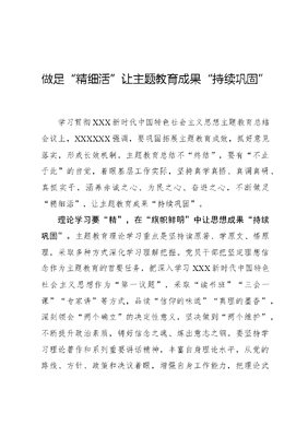 做足精细活让主题教育成果持续巩固学习贯彻XXX新时代中国特色社会主义思想主题教育总结会议上,XXXXXX强调,要巩固拓展主题教育成效,抓好意见落实,形成长效机制。主题教育总结不终结,要有不止于此的自觉,着眼基层工作实际,坚持真学真悟、真调真研、真抓实干,涵养赤诚之心、为民之心、奋进之心,不断做足精细活,让主题教育成果持续巩固。理论学习要精,在旗帜鲜明中让思想成果持续巩固。主题教育理论学习重点是坚持读原著、学原文、悟原理,采取多种方式深化学习理解把握。党员干部把坚定理想信念作为主题教育的首要任务,把深入学习XXX新时代中国特色社会主义思想作为第一议题,采取读书班三会一课专家讲等方式,品读信仰的味道真理的墨香,深刻领会两个确立的决定性意义,坚决做到两个维护,不断提升政治素质,铸好信念之魂、炼出意志之钢。要坚持学习理论著作和系列重要讲话精神,丰富自身理论水平,从党的路线、方针、政策和决议着眼,增强自身工作能力,把理论武装与工作业务结合起来,把党的创新理论转化为推动工作的强大动力,真正实现武装头脑、指导实践、推动工作。为民服务要细,在低身请教中让民生成果持续巩固。XXXXXX强调,保障和改善民生要抓住人民最关心最直接最现实的利益问题。党员干部帮助群众解决最关心最直接最现实的利益问题,是基层各项工作推进的核心所在。党员干部要在主题教育中先学一步、学深一层,当问需于民、问计于民、问策于民的泥腿子干部,迈开步子、跑田间地头,经常到街坊四邻聊一聊、到村头巷尾看一看、到田间地头问一问,俯下身子真心当好向群众讨教的小学生,以毕恭毕敬的姿态去请教,这样才能近距离倾听群众的呼声,搞清楚群众所思所想所盼,原汁原味地掌握好第一手资料,才能真真实实地获得最权威的发言权,真真正正解决好群众操心事、烦心事、揪心事,在服务基层中体验泥土芬芳。推动工作要活,在知行合一中让实干成果持续巩固。基层工作千头万绪、错综复杂,主题教育任务艰巨、任重道远,基层工作和主题教育的高效推进落实都需要付出艰辛的汗水。要把主题教育融入重点工作重大项目,紧密结合乡村振兴、项目建设、招商引资等中心工作开展活动,以学促干、以干促学,深入一线践初心、担使命,进企业、解难题、促发文可居文库——海量学习资料,手机电脑均可下载www.wenkeju.com展,为企业、为群众办实事办好事,解决群众的急难愁盼问题,切实让群众尝到党员暖心服务的甜味,要将主题教育常态化制度化融入基层党员教育当中,坚持真情实干和真情实学相结合,把学到的理论知识、精神主旨转化和运用到实际工作当中、植根于民生工程当中,不搞形式主义,不搞浅尝辄止,不做表面文章,让主题教育在日常岗位上点滴温润渗透,在工作生活中的方方面面都掷地有声。文可居文库——海量学习资料,手机电脑均可下载www.wenkeju.com