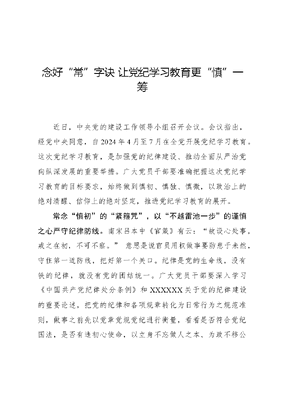 念好常字诀 让党纪学习教育更慎一筹近日,中央党的建设工作领导小组召开会议。会议指出,经党中央同意,自2024年4月至7月在全党开展党纪学习教育。这次党纪学习教育,是加强党的纪律建设、推动全面从严治党向纵深发展的重要举措。广大党员干部要准确把握这次党纪学习教育的目标要求,始终做到慎初、慎独、慎微,以政治上的绝对清醒、信仰上的绝对坚定,推进党纪学习教育的展开。常念慎初的紧箍咒,以不越雷池一步的谨慎之心严守纪律防线。南宋吕本中《官箴》有云:故设心处事,戒之在初,不可不察。 意思是说官员用权做事要防患于未然,守住第一道防线,把好第一个关口。纪律是党的生命线,没有铁的纪律,就没有党的团结统一。广大党员干部要深入学习《中国共产党纪律处分条例》和XXXXXX关于党的纪律建设的重要论述,把党的纪律和各项规章转化为日常行为之规范准则,做事之前先以党章党规党纪进行衡量,看看是否符合党纪国法,是否有违初心使命,以立身不忘做人之本、为政不移公仆之心的谨慎自觉,从源头拒腐防变,抵御禁果诱惑,做到身正影直,不越雷池一步。常打慎独的预防针,以吾日三省吾身的自律之心严明责任担当。《礼记·中庸》有云:莫见乎隐,莫显乎微,故君子慎其独也。慎独的核心要义在于人前人后一个样,现如今不乏部分腐败分子嘴上喊反腐、背后搞贪腐,台上讲规矩、台下走关系的现象,究其根本是无视党纪规章,责任意识淡薄。党员干部要始终强化自身责任意识,以党纪国法作为行动指南,心中高悬明镜、手中紧握戒尺,勒紧自律的缰绳,在实际行动中做到知行合一。在党纪学习教育中汲取奋进力量,始终坚持担当为要,实干为先,拿出真抓实干的韧劲和狠劲,推动党纪学习成果内化于心,外化于行。常注慎微的清醒剂,以勿以恶小而为之的敬畏之心严用百姓之权。《淮南子·人间训》有言:圣人敬小慎微,动不失时。 事物的发展总是由小到大、由量变到质变一步步积累演变而来,大多数腐败分子身上的大问题、大错误往往也是由小问题、小毛病引发而来。广大党员干部要把党纪学习教育的成果融入为民实践之中,将人民群众满不满意作为评判党纪学习教育成效的根本标准,以不矜细行,终累大德自警自励,不被小恩小惠所蒙蔽,始终以先进典型为对照,坚文可居文库——海量学习资料,手机电脑均可下载www.wenkeju.com定走好群众路线,审慎用好手中人民群众赋予的权利,切实把党纪学习成果转化为权为民所用、情为民所系、利为民所谋的实际行动和工作成效。文可居文库——海量学习资料,手机电脑均可下载www.wenkeju.com