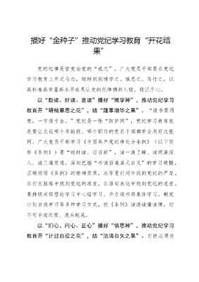 播好金种子推动党纪学习教育开花结果党的纪律是管党治党的戒尺,广大党员干部要在党纪学习教育上开足马力,时时刻刻博学之、慎思之、笃行之,以高标准高质量高水平成果让党的纪律镌刻入脑、铭记于心。以勤读、好读、善读播好博学种,推动党纪学习教育开研精覃思之花,结踵事增华之果。读书需用意,一字值千金。党纪是一张防护网,党纪学习教育就是要让无论哪个年龄段、哪个职位的党员干部都学会用好这张网。广大党员干部学习《中国共产党纪律处分条例》(以下简称《条例》)要时时读、日日新,读一遍了解、读两遍深入、读三遍贯通,深刻把握书读百遍其义自见的学习精髓,正确领悟《条例》的精神实质,在字里行间中找到党纪的严度,在行文脉络中找到党纪的准度,在语句表达中找到党纪的适度。要持续采取理论学习中心组学习、开办读书班集体学习、制定计划自我学习等多种学习方式,把《条例》读透读懂读薄,切不可半途而废、虎头蛇尾。以扪心、问心、正心播好慎思种,推动党纪学习教育开计过自讼之花,结洁清自矢之果。打铁必须自身硬,办好中国的事情,关键在党,关键在党要管党、全面从严治党。学而不思则罔,广大党员干部要提高政治判断,在做不做之前不妨多想一步,把事情对照党纪反复揣摩、仔细掂量。事前多想也要事后总结,在平时也要善于自省。自省不是走过场般的表表态、填填表、动动嘴,而是要通过观看案例故事集、警示教育片等回忆过往行为,对照剖析自己,逐条梳理自身存在的问题,用党纪之笼管好权力之虎,用慎思之法时常鞭策自己,触及灵魂深处,杜绝想腐、愿腐、敢腐的心思。以朴实、扎实、切实播好笃行种,推动党纪学习教育开踔厉奋发之花,结臻于至善之果。只顾理论学习而不在实际中检验就如池中的无根之萍,遇潮则倒、遇汐则倾。知者行之始,行者知之成,在党纪学习教育中,党员干部要继续发扬中国共产党调查研究的优良传统,深入一线蹲点调研,对反映和发现的问题逐一梳理汇总形成清单,对于已存在的问题,要深入研究,立好靶、拉紧弦、射出箭,敢于刀刃向内,坚持当下改和长久立,对整改完成的要倾听回音。通过调查痛点,研究透解点,让党纪学习教育融入基层大地、结出丰硕成果。文可居文库——海量学习资料,手机电脑均可下载www.wenkeju.com