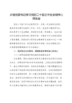 乡镇党委书记学习党的二十届三中全会精神心得体会党的二十届三中全会胜利召开,为进一步全面深化改革、推进中国式现代化指明了方向。作为一名基层乡镇党委书记,我认真学习了全会精神,深感使命光荣、责任重大。全会为新时代全面深化改革吹响了新的号角,为推进乡村全面振兴提供了根本遵循。我将把学习贯彻全会精神作为当前和今后一个时期的重要政治任务,切实把思想和行动统一到全会精神上来,以改革创新精神推动乡村全面振兴。一、深刻领会全会精神,增强推进改革的信心和决心(一)改革是推进中国式现代化的根本动力全会强调,要把全面深化改革作为推进中国式现代化的根本动力。回顾改革开放40多年来的历程,正是在党的坚强领导下,通过不断深化改革,我国农村面貌发生了翻天覆地的变化。从家庭联产承包责任制到集体林权制度改革,从农村税费改革到农村土地制度改革,每一次重大改革都极大激发了农村发展活力,推动农业农村现代化不断向前迈进。作为基层干部,我深刻体会到,改革开放是决定当代中国命运的关键抉择,是党和人民事业大踏步赶上时代的重要法宝。新时代推进乡村全面振兴,必须坚持用好改革这个关键一招,通过深化农村改革破除体制机制障碍,为乡村发展注入不竭动力。(二)坚持党的领导是改革取得成功的关键全会强调,要把党的领导贯穿改革各方面全过程。作为基层党委书记,我深刻认识到,坚持和加强党的全面领导是改革取得成功的关键。在推进农村改革过程中,XX乡党委始