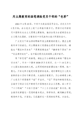 用主题教育的画笔调绘党员干部的色彩2023年3月30日,中共中央政治局召开会议,决定从今年4月开始,在全党自上而下分两批开展学习,贯彻习近平新时代中国特色社会主义思想主题教育,推动全党为全面建设社会主义现代化国家、全面推进中华民族伟大复兴而团结奋斗。广大党员干部当深刻明晰开展主题教育的意义,摆正主题教育学习的姿态,用主题教育之笔描绘出党员干部的色彩,调绘出理论知识本色思想觉悟底色勤劳肯干原色和创业建功成色,在中国式现代化的道路上阔步前行。用学思想的画笔,调绘出万山磅礴看主峰的理论知识本色。作为一个拥有9600多万名党员、在一个14亿多人口大国长期执政的大党,必须用党的创新理论统一思想、统一意志,只有这样才能更加紧密团结起来,进而带领亿万人民向着新的奋斗目标不断迈进。大海航行看舵手,万山磅礴看主峰。广大党员干部要摒弃虚字当头、空字挂帅的错误观念,全面学习领会习近平新时代中国特色社会主义思想,深入学习十个明确十四个坚持十三个方面成就等内容,既全面系统掌握这一思想的基本观点、科学体系,做到融会贯通,避免碎片化、片面性;又把握好这一思想的世界观、方法论,坚持好、运用好贯穿其中的立场观点方法,更好领会其中精髓要义,不断增进对党的创新理论的政治认同、思想认同、理论认同、情感认同,真正把马克思主义看家本领学到手。用强党性的画笔,调绘出一颗红心永向党的思想觉悟底色。回望党的百年奋斗历程,只有理想信念坚定的人,才能始终不渝、百折不挠,才能在风雨漂泊中坚定不移紧跟党的步伐。心中有信仰,脚下才有力量。广大党员干部要牢牢把握强党性的要求,主动把自己摆进去、把思想照进去,自觉用习近平新时代中国特色社会主义思想改造主观世界,深刻领会党的创新理论,不断提高政治判断力、政治领悟力、政治执行力,始终保持共产党人的政治本色,筑牢信仰之基、补足精神之钙、把稳思想之舵。要更加自觉深刻领悟两个确立的决定性意义,增强四个意识、坚定四个自信、做到两个维护,在思想上政治上行动上同以习近平同志为核心的党中央保持高度一致。用重实践的画笔,调绘出勤政天下无难事的踏实肯干原色。理论的价值在于指导实践,学习的目的全在于运用。习近平新时代中国特色社会主义思想是实践的理论,这一思想扎根现实土壤、回应实践需求,从理论和实践的结合上深入回答关系治国理政的课题,是党和人民奋进新征程的行动指南。党员干部要自觉践行习近平新时代中国特色社会主义思想,坚持学思用贯通、知信行统一,树牢知行合一、勤劳实干的价值观念,积极识变、主动应变、革新求变,勇于冲锋在解决经济难题的最前沿、处置社会矛盾的第一线,在解决群众急难愁盼的烦心事、揪心事上下功夫、出实招,以时时放心不下的责任感,为党和人民履好职、尽好责,奋勇前行在中国式现代化的康庄大道上。用建新功的画笔,调绘出砥砺奋进开华章的创业建功亮色。习近平总书记强调,强国建设、民族复兴的宏伟目标令人鼓舞、催人奋进,我们这一代共产党人使命光荣、责任重大。新征程充满光荣与梦想,也充满艰辛和挑战。广大党员干部要充分发扬敢为天下先的优良品质,终保持奋发向上的干劲、冲劲、韧劲。要从小事做起,心系百姓、为民所谋,始终将人民群众的获得感和成就感作为干事的准绳,在民生工作上多做文章,多下功夫,更好一步、更快一步地推进人民群众对美好生活向往目标的实现。要胸怀国之大者,坚持凝心聚力促发展、驰而不息抓落实,立足岗位作贡献,努力创造经得起历史和人民检验的实绩,在新时期的发展道路上建新功、展宏图,为中国式现代化的壮阔画卷添绘色彩。
