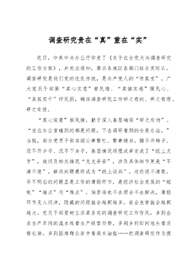 调查研究贵在真重在实近日,中共中央办公厅印发了《关于在全党大兴调查研究的工作方案》,并发出通知,要求各地区各部门结合实际认。调查研究是我们党的优良传统,是共产党人的传家宝。广大党员干部要真心实意察民情、真情实感暖民心、真抓实干纾民困,确保调查研究工作研之有向、研之有理、研之有效。真心实意察民情,勤于深入基层确保研之有向。坐在办公室碰到的都是问题,下去调研看到的全是办法。当前,部分党员干部自诩公事繁忙、繁事缠身,挪不开椅子、迈不开步子、沉不下身子,基层情况顺理成章变成了纸上文字,被问及相关情况支支吾吾,涉及具体细节更是不清不楚,解决问题最终成为纸上谈兵。这些说不清楚,弄不明白的问题正是工作的薄弱环节,是经济社会发展的短板堵点与难点。倘若谁也不去理会不去解决,薄弱环节无人问津,隐藏的问题就会越积越多,社会危害就会越积越大。党员干部要树立求真务实的调查研究工作作风,多到企业生产车间的流水线看生产经营形势,多到乡村田间地头看庄稼长势,多到困难群众家中看柴米油盐……把调查研究作为摸实情、察民情的重要手段。真情实感暖民心,善于问政于民确保研之有理。衙斋卧听萧萧竹,疑是民间疾苦声。当前,部分党员干部下基层调研喜欢高谈阔论,对基层工作指指点点,对基层干部品头论足;导致基层干部群众不愿说、不想说、不敢说,最终听不到基层干部群众的心里话、不能真正了解基层工作真实现状。在调查研究中,要坚持有则改之,无则加勉的态度,不遮掩问题,不回避矛盾。学会从基层干部群众抱怨的问题声音里找到矛盾症结、从复杂诉求中厘清责任清单。知屋漏者在宇下,知政失者在草野。出台的一项政策对不对,方向偏不偏,效果好不好,基层干部群众最有发言权。调查研究者要拿出三人行必有我师焉的谦虚精神,拜人民为师、向人民学习,向基层干部群众询问工作思路和改革措施,分析问题症结所在,找到解决问题的对策和办法。真抓实干纾民困,敢于动真碰硬确保研之有效。一语不能践,万卷徒空虚。现实中,部分党员干部在调查研究过程中发现了问题、提出了对策,形成了一篇看似质量很高的调研报告,并以此获了奖,但如果要追问到底解决了哪些实际问题,却说不出来,这样就失去了调查研究的真正意义。调查就像十月怀胎,解决问题就像一朝分娩。调查研究的最终目的在于解决问题,党员干部要拿出真抓实干的态度和以行之有效的举措,把调研成果转化为整改问题、化解矛盾、推动发展的金点子,做深做实调查研究的后半篇文章,以看得见摸得着的实际行动破解难题,达到研以致用的效果。同时,要形成跟踪监测的长效机制,长期跟进,随时解决出现的新问题,确保调查研究效果经得起历史、组织和群众的检验。