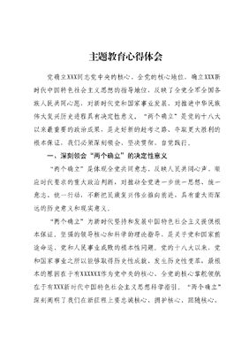 主题教育心得体会党确立XXX同志党中央的核心、全党的核心地位,确立XXX新时代中国特色社会主义思想的指导地位,反映了全党全军全国各族人民共同心愿,对新时代党和国家事业发展、对推进中华民族伟大复兴历史进程具有决定性意义。两个确立是党的十八大以来最重要的政治成果,是走好新的赶考之路、夺取更大胜利的根本保证,我们必须深刻领会、坚决贯彻、自觉践行。一、深刻领会两个确立的决定性意义两个确立是体现全党共同意志、反映人民共同心声、顺应时代要求的重大政治判断,对推动全党进一步统一思想、统一意志、统一行动,不断把民族复兴伟业推向前进,具有重大而深远的历史意义和现实意义。两个确立为新时代坚持和发展中国特色社会主义提供根本保证。坚强的领导核心和科学的理论指导,是关乎党和国家前途命运、党和人民事业成败的根本性问题。党的十八大以来,党和国家事业之所以能够取得历史性成就、发生历史性变革,最根本的原因在于有XXXXXX作为党中央的核心、全党的核心掌舵领航在于有XXX新时代中国特色社会主义思想科学指引。两个确立深刻阐明了我们在新征程上要忠诚核心、拥护核心、跟随核心、捍卫核心,坚持以XXX新时代中国特色社会主义思想为指导这一根本性问题,为我们党团结带领全国各族人民在新时代坚持和发展中国特色社会主义提供了根本保证,必将推动中国特色社会主义事业航船劈波斩浪、一往无前。两个确立为全面建成社会主义现代化强国提供根本保证在中华民族伟大复兴战略全局和世界百年未有之大变局相互交织相互激荡的复杂情况下,在党领导人民向全面建成社会主义现代化强国的第二个百年奋斗目标迈进的重大历史关头,两个确立体现了我们党深刻总结历史经验、深入把握历史规律的高度历史自觉和强大政治定力,体现了全党统一思想、团结一心、步调一致向前进的坚定信心。新的征程上,坚定捍卫两个确立坚决做到两个维护,我们就一定能锚定既定奋斗目标,汇聚更为磅礴的奋进力量,全面建成社会主义现代化强国。两个确立为推进中华民族伟大复兴历史进程提供根本保证。拥有领导核心的政党,才能够凝聚磅礴力量;依靠科学理论指导的事业,才拥有光明前途。今天,我们比历史上任何时期都更接近、更有信心和能力实现中华民族伟大复兴的目标,实现中华民族伟大复兴进入了不可逆转的历史进程。两个确立作为党的十八大以来最重要的政治成果,为推进中华民族伟大复兴历史进程提供了根本保证。深刻把握两个确立,我们就能始终把握发展规律,运用科学世界观和方法论谋划事业发展、应对风险挑战,中华复兴号巨轮就能行稳致远。二、准确把握两个确立的必然逻辑。两个确立是历史的必然选择、人民的必然选择、时代的必然选择,蕴含着深刻的历史逻辑、理论逻辑和实践逻辑。两个确立具有历史必然性。我们党是具有强烈历史自觉和使命担当的马克思主义政党。两个确立是我们党深刻总结党的历史经验,特别是党的十八大以来中国特色社会主义伟大实践形成的最重要的政治成果,体现了我们党以宽广深邃的历史视野把握历史规律、推动党和国家事业发展的政治智慧,体现了我们党强烈的历史担当、高度的历史自觉和坚定的历史自信。我们党在内忧外患中诞生、在历经磨难中成长、在攻坚克难中壮大,不断从胜利走向胜利,很重要的一条历史经验就是始终有坚强的领导核心、有科学的理论指导。党的百年奋斗史雄辩地证明,坚强的领导核心和科学的理论指导关乎党和国家前途命运,对于确保革命、建设、改革事业顺利发展具有决定性作用。两个确立具有理论必然性。纵观马克思主义发展史和世界社会主义发展史,维护党中央权威和集中统一领导,是一个成熟的马克思主义政党必须始终坚持、任何时候任何情况下都不能含糊和动摇的重大原则,这是马克思主义建党学说的一个基本观点。马克思、恩格斯在总结巴黎公社教训时深刻指出:巴黎公社遭到灭亡,就是由于缺乏集中和权威。列宁认为:造就一批有经验、有极高威望的党的领袖是一件长期的艰难的事情。毛泽东同志指出:要建立领导核心。邓小平同志指出:没有核心的领导是靠不住的。两个确立是我们党对马克思主义科学理论的自觉实践,是对马克思主义建党学说的深化和发展两个确立具有实践必然性。两个确立是新时代我们党立足中国特色社会主义伟大实践、在推进中华民族伟大复兴历史进程中作出的重大政治判断,体现了党和国家事业发展的实践逻辑。党的十八大以来,以XXX同志为核心的党中央立足新的历史方位,把握发展大势,引领时代潮流,以伟大的历史主动精神、巨大的政治勇气、强烈的责任担当,推动党和国家事业取得历史性成就、发生历史性变革。XXXXXX是经过历史检验、实践考验、斗争历练的当之无愧的党的核心,是赢得全党全国人民衷心拥护爱戴的人民领袖,是实现中华民族伟大复兴的领路人;XXX新时代中国特色社会主义思想是当代中国马克思主义、二十