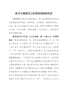 推开主题教育之窗看处处崭新风景XXXXXX在黑龙江考察时指出,第二批主题教育已经启动,各地要坚持科学谋划、统筹安排、分类指导,确保取得实效。当前,第二批主题教育正在深入开展,党员干部要推开主题教育之窗,从大处着眼、从细处着想、从实处着力、从难处着手,看处处崭新风景。 推开理论学习之窗,从大处着眼,看入脑入心的理想信念。理论创新每前进一步,理论武装就要跟进一步。从要把全党变成一个大学校到必须学会自己不懂的东西;从善于学习,善于重新学习到必须大兴学习之风,坚持学习、学习、再学习,在百年奋进征程中,我们党始终把打造学习型政党摆在突出位置,不断开创事业发展新局面XXXXXX指出,中国共产党人依靠学习走到今天,也必然要依靠学习走向未来。第二批主题教育单位要把理论学习作为主题教育的重中之重,组织党员干部认真学习研读《XXX著作选读》《XXX新时代中国特色社会主义思想专题摘编》《论党的自我革命》和《XXX关于调查研究论述摘编》等学习材料。党员干部要在理论学习中深刻领悟两个确立的决定性意义,清楚认识到中国共产党为什么能、马克思主义为什么行、中国特色社会主义为什么好,用理论上的清醒推动政治上的坚定,矢志不渝听党话、跟党走。推开调查研究之窗,从细处着想,看走深走实的为民情怀。调查研究是谋事之基、成事之道,是我们党的传家宝。XXXXXX强调,大兴调查研究,提高党员、干部特别是领导干部科学谋划工作、解决实际问题、抓好工作落实能力。第二批主题教育面对群众更直接,需要解决的问题更具体。要推动第二批主题教育走深走实,就不能把眼光只放在书本上、放在过去的经验上,而是要深入基层,走进群众,想群众之所想、急群众之所急。坐在办公室碰到的都是问题,深入基层看到的全是办法。党员干部要坚持问题导向,坚持问需于民、问政于民、问计于民、问效于民,以蹲下身子看蚂蚁的心态深入农村、社区、企业、医院、学校、两新组织等基层单位,在与基层干部群众深入交流的过程中发现问题和分析问题,找到破解问题的有效办法。对调查研究发现的问题,能短期解决的马上解决,需要多部门长期推进的,要按计划分阶段推进并逐项验收,调查研究成果要及时反馈给群众,确保调查研究取得实效。 推开推动发展之窗,从实处着力,看见行见效的实干担当。时代是出卷人,我们是答卷人,人民是阅卷人。第二批主题教育向基层一线延伸,基层干部群众的感受更直接,更能第一时间反馈推动发展的成效。第二批主题教育的成效好不好,群众满意不满意,关键要看推动发展是否有力,群众是否得到实惠。然而,在实际工作中,依然有极少部分党员干部盲目追求闪亮政绩,大搞形象工程和政绩工程,长此以往不仅会影响个人成长,更会损坏党和人民的事业发展。面对人民群众对美好生活的向往和期盼,党员干部要秉持空谈误国、实干兴邦的工作态度,以逢山开路遇水架桥的闯劲、不破楼兰终不还的拼劲、咬定青山不放松的韧劲,重点围绕乡村振兴、农村人居环境整治、社会治理、基层深化改革等重点工作想办法、破难题,把基层干部群众急难愁盼的事情一件件干好、一茬茬推进、一步步落实,让人民群众真切感受到主题教育的成效就在身边。推开检视整改之窗,从难处着手,看长管长严的清正作风。作风建设事关党的形象,人心向背、事业成败,必须高度重视。第二批主题教育重点面向基层党员干部,群众期盼解决的问题更具体、更紧迫,在检视整改中要重点整治基层腐败、形式主义、官僚主义等群众强烈关注的问题。那些看似问题不大的基层微腐败、形式主义、官僚主义严重损害党和政府的形象,必须下大力气整治。党员干部应结合主题教育把自己摆进去、把职责摆进去、把工作摆进去,照镜子、正衣冠、洗洗澡、治治病,认真开展批评和自我批评,勤掸思想尘、多思贪欲害、常破心中贼,以勿以恶小而为之的谨慎防微杜渐,在明大德、守公德、严私德上下功夫,干干净净做事,清清白白做人,永葆共产党人清正廉洁的优良传统。要抓好建章立制工作,坚持当下改与长久立相结合,巩固主题教育探索的好经验和好做法,对反复出现的问题要注重从源头和制度上解决问题,从而实现主题教育的常态化和长效化。