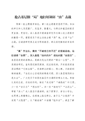抢占基层根局地打好调研由击战同第一批主题教育相比,第二批主题教育层级下移,参加的单位和人员范围广、类型多、数量大,与群众和基层的联系更直接、更密切。深入基层开展调查研究作为第二批主题教育的重要一环,需要党员干部主动抢占根局地,打好由击战,让调查研究真正成为帮助基层、群众排忧解难的有效举措。真字当头,秉持不破楼兰终不还的坚毅品格,站位调研全局,深入基层由内而外调出问题全面目。基层是政策的落脚点,是解决民生问题的最后一公里。开展调查研究,首先要把情况摸清、把症结找准,只有疏通好基层治理的毛细血管,找准群众的操心、烦心事,才能做到精准施策。坐在办公室碰到的都是问题,深入基层看到的全是办法,广大党员干部要把基层作为调研的常去之地,秉持认真的态度、求实的作风,转变走过场凑热闹坏习惯,少一些自以为想当然,多一些接地气沾泥土,带着真心走入基层开展调研,放下官架子、甘当小学生,在思想上尊重群众,在感情上贴近群众,善于从小抱怨中发现大隐患,从微表情中读懂弦外音,真正了解民之所急、民之所盼,读懂群众真心声,调出问题全面目,切实为群众解难题、办好事,以真研真究满足群众殷殷期盼。沉字为要,提振绝知此事要躬行的破题信心,破除调研困局,深入基层由浅入深查出百姓困难事。XXXXXX指出,调查研究多了,基层跑遍、跑深、跑透了,我们的本领就会大起来。我们的认识就会产生飞跃,我们的工作就会做得更好。可见,躬行才能知民意,足践才能知村情。调研过程中,党员干部要想及时、准确获得第一手资料、充分掌握鲜活的民情民意,就绝不能把屁股端端正正坐在板凳炕沿上便了事,必须眼下看,心下沉,身下躬,身入心至地走到群众呼声最强烈的地方去。调研时多与各类人士接触,在面对面的真情交流中充分了解他们的所需所求,还要善于引导群众打开话匣子,多与群众说家常话、讲大白话,真切地和群众掏心窝子推心置腹,与人民群众打成一片,听到群众反映的急难愁盼事要及时记录下来并想方设法去解决,只有把群众的鸡毛蒜皮事当成关键事来调研,才能帮助群众解决好关乎安危冷暖的民生大事。实字为本,激荡敢教日月换新天的斗争热情,开创调研新局,深入基层由表及里研出解题新对策。一语不能践,万卷徒空虚。调查研究不是简单的纸上谈兵隔靴搔痒,真正需要的是凿深井谋新招式的务实调研。广大党员干部要充满解难题的斗争热情,对调研过程中出现的问题,逐一梳理形成问题清单,对于短期内能解决的,必须立行立改、马上就办;对于一时难以解决的难点,要拿出敢于动真碰硬的态度和行之有效的措施,明确责任人,定下时间表,一抓到底,以咬定青山不放松的干劲推动问题彻底解决。毛泽东同志曾说:调查就像十月怀胎,解决问题就像一朝分娩。调查研究的最终目的是解决问题,党员干部不仅要根据前人的有效做法和成功经验提准对策,还要深入基层探寻问题实质,对症下药提出更切合实际的新对策新实招,并把调研成果转化为具体的工作措施,扎实做到研以致用,真正发挥以研资政、以研辅政的重要作用。