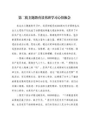 第二批主题教育读书班学习心得体会在这次主题教育学习中,我深切感受到XXX新时代中国特色社会主义思想不仅包括了治国理政的重大理论和策略,还贯穿了中国共产党人的政治品格、价值追求、精神境界和作风要求,包含着深厚的真理力量、实践力量和人格力量,增强了我对党的创新理论在政治认同、思想认同、理论认同和情感认同方面的认识。我坚持读原著、学原文、悟原理,进一步加深了对学思想、强党性、重实践、建新功总要求的理解,受到很大感染和启发。一要凝心铸魂永葆忠诚之心。XXXXXX指出:理想信念之于共产党员来说,就像空气之于人,像水之于鱼一样。理想信念是共产党人精神上的钙,是共产党人走好新时代长征路的精神支柱。我们市深入开展主题教育,通过我为群众办实事实践活动,坚定理想信念,筑牢初心使命。这增强了全市上下推进高质量发展的思想自觉和行动自觉。作为党员领导干部,我们必须凝心铸魂,我将进一步弘扬伟大建党精神,坚定理想信念,筑牢初心使命,永葆共产党人政治本色。二要实干担当淬炼过硬作风。XXXXXX指出:干部最重要的品质就是敢于担当,敢于作为。担当作为是党员干部的政治品格,也是党员干部的精神追求。我们市坚持以人民为中心的发展思想,牢记为民初心,勇于担当作为。我们统筹疫情防控和经济社会发展,加快建设现代化经济体系,推动高质量发展,以优异成绩庆祝建党100周年。这充分展现出我们市干部群众的过硬作风和担当精神。作为副市长,我必须实干担当,进一步坚持问题导向,以抓铁有痕、踏石留印的精神抓落实,以实际行动践行初心使命。三要奋发有为开创事业新局。XXXXXX指出:没有奋斗就没有出路,奋斗才能梦想成真。奋斗是最宝贵的精神财富,是中国共产党人的精神标识。我们市深入贯彻新发展理念,坚持走生态优先、绿色发展之路,抓住机遇,砥砺奋进,以奋发有为的精神状态开创高质量发展新局面。我们先后被评为全国生态文明建设示范市、全国绿色发展典型案例城市,为全面建成社会主义现代化强国提供了宁德经验。作为副市长,我必须奋发有为。下一步,我将进一步弘扬奋斗精神,以永不懈怠的政治品格和胸怀谋划未来,以奋发有为的精神状态开创全市高质量发展新局面。