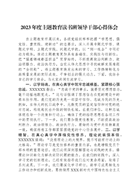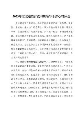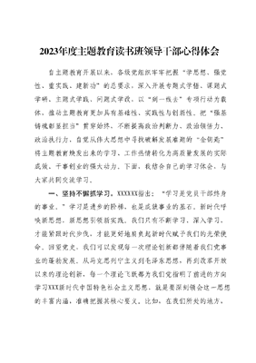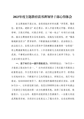 2023年度主题教育读书班领导干部心得体会自主题教育开展以来,各级党组织牢牢把握学思想、强党性、重实践、建新功的总要求,深入开展专题式学悟、课题式学研、主题式学践、问题式学改,以到一线去专项行动为载体,推动主题教育更加具有基础性、实践性与创新性。把强基铸魂彰显担当贯穿始终,不断提高政治判断力、政治领悟力、政治执行力,自觉从伟大思想中寻找破解发展难题的金钥匙将主题教育焕发出来的学习、工作热情转化为高质量发展的实际成效、干事创业的强大动力。下面,我结合自己的学习体会,与大家共同交流学习。一、善于知行合一提升思维能力。XXXXXX指出:知行合一才能真正做到知行合一。这句话深刻揭示了我们提升思维能力的重要途径。作为党员领导干部,我们要注重理论学习,将理论与实践相结合,不断提升自己的思维能力。回顾历史,我们可以看到,在XXXXXX的领导下,我们党始终强调理论联系实际,注重知行合一。以科技创新为例,我们以XXXXXX为核心的党中央提出了创新是引领发展的第一动力的重要思想,取得了显著成效。数据显示,过去五年,我国科技创新能力显著提升,一批重大科技成果取得突破,为经济社会发展注入了强大动力。这些成绩的取得,正是因为我们善于知行合一,不断提升了思维能力。下一步我们要更加深入地学习XXXXXX的思想,善于知行合一,提升思维能力。我们要注重理论学习,结合实际工作,深入思考问题,不断拓展思维边界。同时,我们要勇于实践,将理论转化为行动,推动工作取得更好发展。二、善于交流碰撞提升解题能力。XXXXXX指出:交流碰撞才能真正解决问题。这句话深刻揭示了我们提升解题能力的关键。作为党员领导干部,我们要注重团结合作,善于交流碰撞,共同解决问题。回顾历史,我们可以看到,在XXXXXX的领导下,我们党始终强调团结合作,注重交流碰撞。以扶贫工作为例,我们以XXXXXX为核心的党中央提出了精准扶贫战略,取得了显著成效。数据显示,过去五年,我国农村贫困人口减少了近1亿,贫困发生率下降到1.7%以下,贫困地区基础设施得到了极大改善,群众生活水平明显提高。这些成绩的取得,正是因为我们善于交流碰撞,共同解决问题。下一步,我们要更加深入地学习XXXXXX的思想,善于交流碰撞,提升解题能力。我们要注重团结合作,加强沟通交流,倾听不同声音,汇聚智慧力量,共同解决工作中的难题。同时,我们要勇于创新,敢于突破传统思维,找到解决问题的新路径和新方法。三、善于总结成果提升研讨质量。XXXXXX指出:总结成果才能真正提升研讨质量。这句话深刻揭示了我们提升研讨质量的重要途径。作为党员领导干部,我们要注重总结经验,提升研讨质量。回顾历史,我们可以看到,在XXXXXX的领导下,我们党始终强调总结经验,注重研讨质量。以经济发展为例,我们以XXXXXX为核心的党中央提出了创新、协调、绿色、开放、共享的发展理念,取得了显著成效。数据显示,过去五年,我国经济保持了中高速增长,经济结构不断优化,创新能力和竞争力显著提升。这些成绩的取得,正是因为我们善于总结成果,不断提升了研讨质量。下一步,我们要更加深入地学习XXXXXX的思想,善于总结成果,提升研讨质量。我们要注重经验总结,总结成功经验和失败教训,吸取经验教训,不断提高工作的质量和效益。同时我们要注重创新思维,开展深入研究,推动工作的创新和发展。各位同志,学习XXX新时代中国特色社会主义思想,是我们党员领导干部的重要政治任务。让我们善于知行合一,善于交流碰撞,善于总结成果,不断提升自身素质和工作水平,为实现中华民族伟大复兴的中国梦而努力奋斗!谢谢大家!