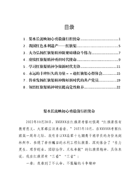 目录1.渠水长流映初心勇毅前行担使命..12.我国红色水利遗产——红旗渠..53.大力弘扬红旗渠精神凝聚磅礴奋斗伟力..74.赓续红旗渠精神勇担时代使命..95.学习红旗渠精神争做新时代先锋116.永远的丰碑恒久的力量--赴红旗渠心得体会157.传承发扬红旗渠精神做好新时代的共产党员.198.领悟红旗渠精神切实提高党性修养..22渠水长流映初心勇毅前行担使命2022年10月28日,XXXXXX在红旗渠考察时强调红旗渠很有教育意义,大家都应该来看看。2023年10月,在XXXXXX考察红旗渠一周年之际,我有幸以XX县第十七期青干班学员的身份来到林州市,参观了举世瞩目的水利工程红旗渠,深刻体会了自力更生、艰苦创业、团结协作、无私奉献的红旗渠精神,具体来说,我在红旗渠有三看三省:一看:我看到了不认命、不服输的斗争精神一个地区若想有水,水源主要有三条路:一是天上水,二是地下水,三是外来水。在上世纪60年代的林县,前两条路已经被堵死,若想解决缺水的问题,只能走第三条路。红旗渠的主线路都建在太行山的半山腰,在那个年代,没有重型机械,没有先进仪器,缺乏资金支持,甚至有时候连饭都吃不饱。但是困难没有吓倒林县人民,数十万群众自带工具,自带口粮,夫妻并肩,父子同行,硬是靠着自己的双手和简陋的工具,一锤一斧劈凿出了红旗渠。二看:我看到了自力更生、艰苦奋斗的顽强作风在红旗渠纪念馆,一张张图片、一段段影像、一个个实物、一行行文字,为我们再现了当年自力更生、艰苦奋斗的感人场景工地上白手起家办起了炸药厂、水泥厂、石灰厂、修配厂,有效解决原料短缺问题。一批边学边干的土专家,使用仅有的一台简陋的测量仪器,再加上洗脸盆、麻绳和皮尺,硬是用土办法就测出了红旗渠上千公里的渠线,放在今天仍是难以想象的。三看:我看到了共产党人永不褪色的初心使命十年九旱,是林县人修渠前的真实写照,引水,就是当时林县共产党人的初心使命。以林县县委书记杨贵为代表的共产党人以重新安排林县河山的大无畏革命气概和愚公移山的强大精神力量,毅然决然带领全县人民,在险峻的太行山悬崖峭壁上建成了1500多公里的人工天河。这一人间奇迹,不仅改变了林县人民严重缺水的情况,更是见证了中国共产党人始终把人民的期盼放在心中首要位置的初心使命。一省:要牢固树立为人民服务的宗旨杨贵书记接受央视记者采访时说过:我一直信奉一句话:群众最关心的事,就是大事。领导干部就要实事求是为群众办实事。如果只做表面文章,会很危险,群众会对你丧失信心的。林县党员干部坚持立党为公、执政为民,实现好、维护好发展好最广大人民的根本利益,用实际行动向我们诠释了怎样做才是一名合格的共产党员。二省:要相信群众和依靠群众群众的力量无穷大,红旗渠不是某一个人建成的,而是数十万人齐心协力、团结协作建成的,没有群众的强烈愿望和创造精神,不会产生修建红旗渠的设想;没有干部和广大群众的苦干精神,也不可能建成红旗渠。XX的发展,也不能仅仅靠某一位领导而是要靠30万泉城百姓。三省:要坚持实事求是求真务实是红旗渠精神的重要体现,也是红旗渠修建成功的重要因素。杨贵讲道:工程动工前都是实地考察过的,而且是边干边测量,边调整施工方案。1960年,开工刚20天,战线太长工期太慢,我们就适时确定了分段攻坚的策略。一段渠先通了,群众看到水后干劲就更大了。应该说,整个工程我们都是对群众负责,对自己负责的。作为一名秘书,要想高质量完成好自己的本职工作,我认为最重要的一点就是脚踏实地,办公室有句话文经我手无差错,事交我办请放心,衡量秘书工作得好坏,有两项重要指标,一是办文,二是办事,只有脚踏实地把材料写好,把领导交办的事做好,才能做到文武双全,才能成为一名合格的秘书,最忌讳的就是好高骛远。红旗渠精神虽然形成于上世纪60年代,但正如XXXXXX所强调的,红旗渠精神是我们党的性质和宗旨的集中体现,历久弥新,永远不会过时。我坚信,此行给我们XX县第十七期青干班的每一名学员都留下了深深的记忆,红旗渠的精神也必将在我们的心田扎根、生长。我国红色水利遗产——红旗渠作为一名共产党员和水利基层干部,我有幸在全县第十七期青干班组织安排下,来到河南省林州市学