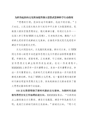 为担负起新的文化使命提供强大思想武器和科学行动指南思想的引领,犹如征途中的旗帜、远航中的灯塔。2月6日,人民日报头版头条刊发任仲平文章《为强国建设、民族复兴提供坚强思想保证、强大精神力量、有利文化条件——论深入学习贯彻XXX文化思想》,引发热烈反响,激励广大干部群众更好担负起新的文化使命,在推进中国式现代化进程中建设中华民族现代文明。文化兴则国运兴,文化强则民族强。新时代以来,以XXX同志为核心的党中央把宣传思想文化工作摆在治国理政重要位置,举旗定向、谋篇布局,正本清源、守正创新,推动新时代宣传思想文化事业取得历史性成就。在这一历史进程中,XXXXXX主持召开一系列重要会议、发表一系列重要讲话、作出一系列重要指示,在新时代文化建设方面提出一系列新思想新观点新论断,形成了XXX文化思想。这一重要思想为做好新时代新征程宣传思想文化工作、担负起新的文化使命提供了强大思想武器和科学行动指南。XXX文化思想明确了新时代新的文化使命,为新时代党的宣传思想文化工作指明前进方向。XXXXXX指出:在新的起点上继续推动文化繁荣、建设文化强国、建设中华民族现代文明,是我们在新时代新的文化使命。新时代以来,两个巩固九个坚持十四个强调七个着力……XXX文化思想涵盖新时代文化建设的发展方向、历史使命、目标任务、发展战略、发展途径、发展保证等基本问题,既是对过往理论和实践经验的深刻总结,也为继续做好新时代宣传思想文化工作指明前进方向。XXX文化思想的提出具有里程碑意义。XXX文化思想明确了肩负新的文化使命必须坚持的基本原则,标志着新时代党对宣传思想文化工作的规律性认识上升到一个新高度。XXXXXX强调,更好担负起新的文化使命,坚定文化自信,秉持开放包容,坚持守正创新,激发全民族文化创新创造活力。必须深刻认识到,坚定文化自信,就是要坚持走自己的路,立足中华民族伟大历史实践和当代实践,用中国道理总结好中国经验,把中国经验提升为中国理论,坚持理论与实践相结合,更加坚定中国特色社会主义道路自信、理论自信和制度自信;秉持开放包容,就是要更加积极主动地学习借鉴人类创造的一切优秀文明成果,坚持中国与世界相融通,在文明交流互鉴中推进中华民族现代文明建设,增强中华文明的传播力影响力;坚持守正创新,守正守的是马克思主义在意识形态领域指导地位的根本制度,守的是两个结合的根本要求,守的是中国共产党文化领导权和中华民族的文化主体性,创新创的是新思路、新形态、新话文可居文库——海量学习资料,手机电脑均可下载www.wenkeju.com语、新机制、新形式,实现古今贯通、融通中外、与时俱进、科学有效。XXX文化思想明确了新时代文化建设的路线图和任务书,为做好党的宣传思想文化工作提供了根本遵循。必须深刻认识到,XXX文化思想明体达用、体用贯通,既有文化理论观点上的创新和突破,又有文化工作布局上的部署要求,既有本体论、认识论高度上的整体观照,又有实践论、方法论上的具体指导,充分体现了理论与实践相结合、世界观和方法论相统一。深入学习贯彻XXX文化思想,就要准确理解其中的重要概念和提法,同时加强系统性、整体性把握,吃透基本精神,领会核心要义,明确实践要求,做到学有所悟、融会贯通。思想的光芒照亮前路,文化的力量鼓舞人心。前进道路上坚持以XXX文化思想为引领,以高度政治自觉、饱满精神状态、顽强斗争意志、科学思路方法做好工作,我们就一定能够担负起新的文化使命,在实践创造中进行文化创造,在历史进步中实现文化进步,以文化兴盛支撑国家强盛。文可居文库——海量学习资料,手机电脑均可下载www.wenkeju.com
