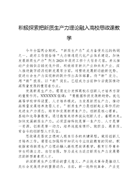 积极探索把新质生产力理论融入高校思政课教学今年全国两会期间,新质生产力成为备受关注的热词之一。政府工作报告将大力推进现代化产业体系建设,加快发展新质生产力列为2024年政府工作十大任务之首,并从推动产业链供应链优化升级、积极培育新兴产业和未来产业、深入推进数字经济创新发展等方面,对塑造发展新动能新优势、促进社会生产力实现新的跃升作出具体部署。向新发力、用新提质、以新促长,已经成为当前和今后我国推动高质量发展的重要着力点。发展新质生产力,需要充分发挥高校在创新人才培养方面的重要作用。XXXXXX强调:要根据科技发展新趋势,优化高等学校学科设置、人才培养模式,为发展新质生产力、推动高质量发展培养急需人才。新质生产力是创新起主导作用的先进生产力质态。培育和发展新质生产力,创新是核心要素,基础和先导靠教育,通过教育来培养拔尖创新人才。着眼未来,加快发展新质生产力,必须坚持科技是第一生产力、人才是第一资源、创新是第一动力,培养造就有情怀、敢担当、高素质、肯奋斗的创新型人才队伍。思政课是落实立德树人根本任务的关键课程。做好创新人才培养工作,需要在加强科学知识与专业技能教育的同时,积极探索将新质生产力理论融入高校思政课教学,教育引导青年学生明德立志、自信自强,努力成长为适应新质生产力发展要求的新型高素质人才。讲深新质生产力理论的重大意义。产业技术革命是推动人类社会发展进步的重要动力。当前,新一轮科技革命、产业变革与我国加快转变经济发展方式历史性交汇,我国发展面临着千载难逢的历史机遇,同时也面临巨大挑战。把握发展机遇、应对国际竞争、破解发展难题、实现高质量发展,必须以能够更好适应时代发展要求的新的生产力理论来指导。新质生产力理论正是在这一背景下应运而生。思政课老师当立足马克思主义基本原理,立足当代经济科技发展实践,讲清楚新质生产力理论是我们党坚持马克思主义生产力发展学说,深刻总结概括新时代高质量发展实践,着眼当前和未来发展需要提出的原创性理论成果,引导青年学生深刻领会新质生产力理论提出的时代背景和重大意义,增强学习掌握这一重要理论的思想自觉。讲透新质生产力理论的丰富内涵。新质生产力理论思想深刻、内涵丰富,同时具有鲜明的实践性、时代性等特点。从基本定义上看,新质生产力是创新起主导作用,摆脱传统经济增长方式、生产力发展路径,具有高科技、高效能、高质量特征,符合新发展理念的先进生产力质态。思政课老师需坚持以马克思主义生产力理论为指导,从新质生产力定义出发,多角度、多层次深刻阐释这一理论的丰富内涵。从产生背景上,讲清楚新质生产力是技术革命性突破、生产要素创新性配置、产业深度转型升级而催生;从内在意涵上,讲清楚新质生产力以劳动者、劳动资料、劳动对象及其优化组合的跃升为基本内涵;从特点特质上,讲清楚新质生产力以全要素生产率大幅提升为核心标志,特点是创新,关键在质优,本质是先进生产力;从实践要求上,讲清楚发展新质生产力要及时推动科技创新成果转化应用,加快发展方式绿色转型,在全面深化改革中形成相适应的新型生产关系;从原则方法上,讲清楚发展新质生产力必须坚持从实际出发,做到先立后破、因地制宜、分类指导,等等。通过深入透彻讲述,引导青年学生完整理解新质生产力的理论内涵和实践要求。文可居文库——海量学习资料,手机电脑均可下载www.wenkeju.com讲明发展新质生产力的青年担当。新质生产力顺应新一轮产业革命大势,代表先进生产力发展方向。当前,党和国家围绕加快发展新质生产力所作的谋划部署,既是立足当下、破解经济社会发展难题的重要举措,也是着眼长远、为未来发展储备能量的关键布局。青年学生作为活跃于时代前沿的弄潮儿,是未来引领推动新质生产力发展的生力军。高校思政课当从党和国家事业长远发展角度,将适应新质生产力发展要求作为时代新人的应具素质,教育引导青年学生胸怀国之大者,增强以新质生产力发展推动强国建设、民族复兴的使命感责任感;加强包括科学家精神、企业家精神、新时代北斗精神等在内的中国共产党人精神谱系教育,引导学生树立科技报国、实业报国的理想信念;强化创新创业能力培养,教育引导学生在掌握专业知识、夯实学识功底基础上,培育创新思维、激发创造热情、增强创业本领,在实践磨砺中努力成长为适应新质生产力发展要求、堪当民族复兴重任的时代新人。文可居文库——海量学习资料,手机电脑均可下载www.wenkeju.com
