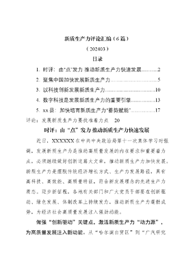 新质生产力评论汇编(6篇)(202403)目录1.时评:由点发力 推动新质生产力快速发展22.聚焦中国加快发展新质生产力53.以科技创新发展新质生产力..104.数字科技是发展新质生产力的重要引擎135.xx县:加快培育新质生产力蓄势赋能17评论:发展新质生产力要找准着力点20时评:由点发力 推动新质生产力快速发展 近日,XXXXXX在中共中央政治局第十一次集体学习时强调,发展新质生产力是推动高质量发展的内在要求和重要着力点,必须继续做好创新这篇大文章,推动新质生产力加快发展。新质生产力是摆脱传统经济增长方式、生产力发展路径,具有高科技、高效能、高质量特征,符合新发展理念的先进生产力质态。迈步新征程,各地有关部门和广大党员干部要在创新驱动、绿色发展、体制改革上持续发力,推动新质生产力蓬勃成势,为经济社会高质量发展注入强劲动能。做强创新驱动关键点,激活新质生产力动力源,为高质量发展注入新动能。从哈尔滨自贸区到广汽研究院,从宜宾极米科技到苏州工业园区,XXXXXX的足迹遍布南北,对于加强科技创新,推动创新驱动发展始终念兹在兹。当前,新一轮科技革命和产业变革正加速重塑世界经济结构,推动新质生产力加快发展,必须要紧紧扭住科技创新这个牛鼻子。我们要始终贯彻创新是引领发展的第一动力的工作理念,完整、准确、全面贯彻新发展理念,敢于创新、勇于创新,积极发扬钉钉子精神,瞄准科技前沿新赛道,在拼搏创新中练就新本领、破解新难题,为助推经济高质量发展提供源源不竭的动力源泉。做优绿色发展基础点,点燃新质生产力强引擎,为高质量发展提供重要极。绿色发展是高质量发展的底色,新质生产力本身就是绿色生产力。在XXX生态文明思想科学指引下,神州大地,山清水秀,绿色低碳发展迈出坚实步伐。当前,我国进入高质量发展阶段,生态环境的支撑作用越来越明显。实践充分证明,新质生产力是实现两山转化的新途径,只有把绿色发展的底色铺好,才会有今后发展的高歌猛进。新时代,我们要坚定不移走生态优先、绿色发展之路,牢固树立和践行绿水青山就是金山银山的理念,让生态优势不断转化为发展优势,让绿宝盆变为聚宝盆,更好促进人与自文可居文库——海量学习资料,手机电脑均可下载www.wenkeju.com然和谐发展,让生态红利惠及更多人民群众,奋力谱写新时代生态文明建设新篇章。做实体制改革着力点,激发新质生产力新活力,为高质量发展筑牢硬支撑。XXXXXX强调,发展新质生产力,必须进一步全面深化改革,形成与之相适应的新型生产关系。发展新质生产力是一项重要的系统工程,各地有关部门要在深化体制改革上下硬功夫、细功夫。一方面,要深化人才体制改革,完善人才引育用留工作机制,构建人才集聚强磁场、人才培育孵化器、人才成长大舞台,创新人才发展制度和激励制度,摒弃和破除束缚人才创新创造活力的体制机制障碍,为发展新质生产力、推动高质量发展培养人才。另一方面,要加快构建更加完善的要素市场化配置体制机制,创新生产要素配置方式,激发劳动、知识、技术、管理、资本和数据等生产要素活力,让各类先进优质生产要素向发展新质生产力方向顺畅流动。同时,要进一步健全规则、完善制度、加强监管,让一切生产要素创新活力竞相奔涌,汇聚推动经济社会高质量发展的磅礴力量。聚焦中国加快发展新质生产力作为世界经济增长重要引擎,中国经济发展形势持续吸引全球关注。多家外媒关注到,中国更加重视把创新作为引领发文可居文库——海量学习资料,手机电脑均可下载www.wenkeju.com展的第一动力,着力推动技术革命性突破、生产要素创新性配置、产业深度转型升级。2024年中国经济规划展现新风貌,科技创新为产业注入新力量。科技创新成为推动中国经济发展重要力量国际金融论坛报告显示,2023年,中国经济对世界贡献率达32%,是世界经济增长重要引擎。国际舆论认为,中国经济治理客观务实、理性自信,中国经济从经济发展的长短周期看都有强力支撑。德国《青年世界报》网站关注到,刚刚过去的中国全国两会广泛讨论了中国经济的形势和发展方向。政府工作报告显示,中国对2024年再次实现5%左右的经济增长充满信心。科技创新成为推动中国经济发展重要力量。西班牙《起义报》网站近日刊文谈道,中国过去40年的经济增长是世界历史上规模最大、持续时间最长的增长,中国经济在实现总规模扩大的同时,质量获得显著提升。文章认为,中国企业在5G通信设备、新能源汽车、数字支付、人