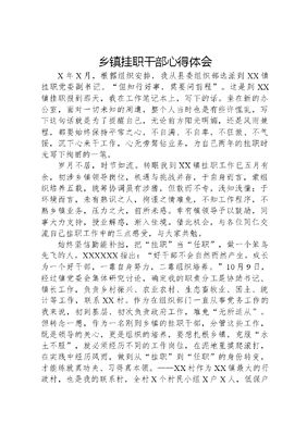 乡镇挂职干部心得体会X年X月,根据组织安排,我从县委组织部选派到XX镇挂职党委副书记。但知行好事,莫要问前程。这是到XX镇挂职报到那天,我在工作笔记本上,写下的话。坐在新的办公室,面对一切未知的周遭,整个人当时也是有些许慌乱,写下这句话就是为了提醒自己,无论前方阳光明媚,还是风雨兼程,都要始终保持平常之心,不自满、不自卑,不狂傲、不气馁,沉下心来干工作,心无旁骛钻业务,为自己两年的挂职时光写下绚丽的一笔。岁月不居,时节如流。转眼我到XX镇挂职工作已五月有余,初涉乡镇领导岗位,机遇与挑战并存,于自身而言,蒙组织培养五载,统筹协调虽有涉猎,但散而不专,浅知浅懂;于环境而言,未有熟识之人,拘谨之情难免,不知工作程序,不熟乡镇业务,压力之大,前所未感。幸有镇领导予以鼓励,同事大力支持,授业解惑,渐入佳境。借此机会,与各位同仁交流自己挂职工作中的三点感受,与大家共勉。始终坚信勤能补拙,把挂职当任职,做一个笨鸟先飞的人。XXXXXX指出:好干部不会自然而然产生。成长为一个好干部,一靠自身努力,二靠组织培养。10月9日,经过镇党委会集体研究讨论,确定我的职责分工是协助书记、镇长工作,负责乡村振兴、农业农村、生态畜牧业、国土、统计等工作,联系XX村。作为在组织部门一直从事党务工作的我来说,初到基层、初次负责政府工作,难免无所适从。但转念一想,作为一名刚到乡镇的挂职干部,分管这些工作,既是领导的关心,更是组织的培养,要想扎根乡镇,克服水土不服,就必须经历不同的工作岗位,在泥地里摸爬滚打,在实践中经历风雨,做到从挂职到任职的身份转变,才能练就真功夫、习得真本领。——XX村作为XX镇最大的行政村,也是我的联系村,全村X个村民小组X户X人,低保户X户X人,五保户X户X人,残疾人X户X人,监测户X户X人,从数据来分析,XX村是脱贫攻坚后评估XX的必查村。但自从2019年脱贫攻坚国家评估后,村干部、驻村干部的工作主动性、积极性不同程度有所减退,为了带动村干部的工作积极性,我主动参与到XX的脱贫攻坚成果巩固提升工作中,白天带着村干部走村入户了解群众生产生活情况、核实收入、了解问题困难,晚上与村干部一起开研判会、录数据、完善资料。最后,XX村顺利迎接了市级初步评估督查,得到市级检查组充分认可,同时,作为挂职联系领导的我也才真正得到XX村干部群众的认同。经历过这件事情后,我深感,挂职干部绝非座上宾,只有以身作则、率先垂范,把挂职当任职,工作才能如身使臂,如臂使指。于是,在工作中,我始终秉承组工干部讲政治、重公道、业务精、作风好的优良传统,坚持5+2白+黑的工作作风,做到工作日期间24小时人在XX、心在XX,坚持工作不熟就多起起身,人生地疏就多跑跑路,做到不带官气、不带书生气,多带客气、多带乡土气。始终坚持脚踏实地,把锻炼当磨炼,做一个向下扎根的人。好好干,争取把挂字去掉,这是挂职以来在我耳边时常响起的一句话,不论是亲朋好友,还是同学同事,我知道这是一种人往高处走的美好祝福,但我更知道,到乡镇挂职机会难得,主要任务就是认真学习、不断磨炼、丰富自己。作为从机关部门初到乡镇挂职的干部,缺少乡镇工作经验,在面对千头万绪的乡镇工作、五花八门的群众利益诉求时,难免力不从心。但同时也是机遇与挑战并存,要茁壮成长,根本是要通过挂职,做到从锻炼到磨炼的能力质变——记得刚到XX不久,面对旱情,人民群众生产生活用水出现紧缺,XX镇X村与X村发生了一起争夺水源的矛盾纠纷,我作为水务的分管领导,主动到村调解矛盾纠纷。X书记,你今天来调解我们两个村这个事情搞不成!你是下来挂职的,是文可居文库——海量学习资料,手机电脑均可下载www.wenkeju.com这两年镀完金就高升了,我们的事情你就别管了!其实,我知道,作为挂职干部,很多人对我们都存在一种混经历、当过客的认识误区。为了一探究竟、解决群众矛盾纠纷,也为了争口气,我带着大家爬到1个小时的山路到了深山中的水源点,经过各部门配合,最终成功解决了这起饮水纠纷。所以这件事情给了我又一个启示:到乡镇,最大的感受,是工作实,接地气,唯有脚踏实地,工作才能掷地有声。始终坚持以心换心,让身到变心到,做一个为民办事的人。从农村走到工作岗位,如今又返回到农村,对农村、对农民我有着土生土长的情感,我更加珍惜这次的挂职试炼机会,而这场试炼,也将成为我锤炼作风能力,砥砺初心使命,最具体、最鲜明也最生动的实践——带领40名护林员赴X镇救火,奋战30多个小时,共战火情;与国土所、安监站整治地质灾害隐患,共战灾情;与XX村组干部、广大群众为乡村振兴出点子、想办法,共战困情……回顾挂职生活,是锻炼,亦是学习,更是成长。我更深知,要得到干部群众的信任和