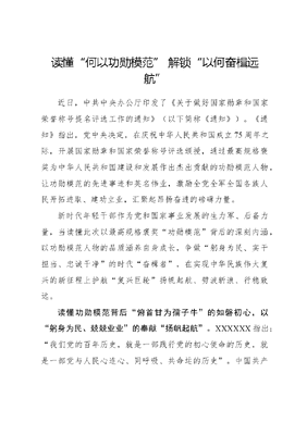 读懂何以功勋模范 解锁以何奋楫远航近日,中共中央办公厅印发了《关于做好国家勋章和国家荣誉称号提名评选工作的通知》(以下简称《通知》)。《通知》指出,党中央决定,在庆祝中华人民共和国成立75周年之际,开展国家勋章和国家荣誉称号评选颁授,通过最高规格褒奖为中华人民共和国建设和发展作出杰出贡献的功勋模范人物,让功勋模范的先进事迹和英名伟业,激励全党全军全国各族人民开拓进取、建功立业,汇聚起昂扬奋进的磅礴力量。新时代年轻干部作为党和国家事业发展的生力军、后备力量,当读懂此次以最高规格褒奖功勋模范背后的深刻内涵,以功勋模范人物的品质涵养自身成长,争做躬身为民、实干担当、忠诚干净的时代奋楫者,在实现中华民族伟大复兴的新征程上护航复兴巨轮扬帆起航、劈波斩浪、行稳致远。读懂功勋模范背后俯首甘为孺子牛的如磐初心,以躬身为民、兢兢业业的奉献扬帆起航。XXXXXX指出:我们党的百年历史,就是一部践行党的初心使命的历史,就是一部党与人民心连心、同呼吸、共命运的历史。中国共产党成立时只有50多名党员,今天已经成为拥有9500多万名党员、具有重大全球影响力的世界第一大执政党。回顾百年党史,人民是我们党的力量源泉,我们党根基在人民、血脉在人民。广大年轻干部接好班,就要紧握百年党史传递来的历史接力棒,赓续先烈前辈历久弥新的为民情,始终坚持全心全意为人民服务,走得再远也不能忘记从何处出发?为什么出发?时刻牢记为中国人民谋幸福的初心,践行宗旨不当看客,发奋图强,以一切为了人民的主心骨姿态办实事,把人民群众急难愁盼的事当做家里事,问需于民、问计于民、问政于民,让复兴巨轮扬起为民之帆启航。读懂功勋模范背后不破楼兰终不还的实干担当,以解放思想、锐意进取的作风劈波斩浪。干部干部,干是当头的。干事担事,是干部的职责所在,也是价值所在。能否敢于负责、勇于担当,最能看出一个干部的党性和作风XXXXXX殷切叮嘱我们要自觉做勇于担当作为的不懈奋斗者。船到中流浪更急,人到半山路更陡,站在新的历史阶段,新时代年轻干部要坚持解放思想、实事求是,以更高的站位、更宽的视野、更大的气魄,在改革开放主战场、国家建设最前沿,自觉锻炼出越是艰险越向前的奋斗品质。发扬踏石留印、抓铁有痕的精神,在干事创业中重痕又重迹,争做想文可居文库——海量学习资料,手机电脑均可下载www.wenkeju.com干事、能干事、干成事的实干家,涉险滩、扛重活。善于逢山开路、遇水架桥,甘做热锅上的蚂蚁,愿接烫手的山芋,在肥沃的改革开放土壤中锻造挺膺担当,把个人成长奋斗融入中国式现代化新征程。读懂功勋模范背后愿得此身长报国的忠诚本色,以自信自强、守正创新的信念行稳致远。XXXXXX强调,坚定理想信念,必先知之而后信之,信之而后行之。从小小红船到巍峨巨轮,今天,中华民族向世界展现的是一派欣欣向荣的气象,正以不可阻挡的步伐迈向伟大复兴。成就巨变的背后,是一代代中国共产党人那些永远不曾改变的强大的理想信念。行百里者半九十,新时代的年轻干部要自觉做对党忠诚老实的模范践行者,始终同党中央保持高度一致。深学细悟XXX新时代中国特色社会主义思想,深刻把握这一重要思想的科学体系、核心要义、实践要求,把学习成效转化为做好本职工作、推动事业发展的生动实践。要进一步增强四个意识、坚定四个自信、做到两个维护。争做发展新质生产力的先锋队和排头兵,跟进学习思考新兴产业和未来产业领域的国家战略部署和新知识,在青春之际用炽热信仰锤炼忠诚精神,确保复兴航线行稳致远,为强国建设、民族复兴作出应有贡献。文可居文库——海量学习资料,手机电脑均可下载www.wenkeju.com