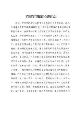 党纪学习教育心得体会近日,中央党的建设工作领导小组召开了专题会议,深入学习并全面贯彻落实XXXXXX关于党纪学习教育的重要讲话和重要指示精神。会议详细听取了关于党纪学习教育准备工作的情况汇报,并审慎研究部署了下一步的党纪学习教育工作。会议明确指出,经党中央审慎研究并同意,决定自2024年4月至7月,在全党范围内深入开展党纪学习教育活动。此次党纪学习教育,是加强党的纪律建设、推动全面从严治党向纵深发展的重大举措,对于提高党员干部的纪律意识和规矩意识,具有深远意义。会议要求,广大党员干部必须深刻理解并牢固掌握党纪学习教育的核心要义,以高度的政治自觉和行动自觉,念好党纪学习教育的防字诀。要始终坚持以严明的纪律防患于未然,确保党的纪律和规矩在全党范围内得到严格执行。同时,广大党员干部要始终保持与以XXX同志为核心的党中央的高度一致,统一思想、统一行动。要做到知行合一、表里如一,确保党的理论和路线方针政策在各级党组织和广大党员干部中得到全面、准确、有效的贯彻落实。通过此次党纪学习教育,我们要进一步筑牢党员干部的思想防线,强化纪律意识和规矩意识,推动全面从严治党向纵深发展,为实现中华民族伟大复兴的中国梦提供坚强保障。要积极落实预防措施,强化风险意识,做到防微杜渐。讲政治是我们党坚持正确方向、保持先进性和纯洁性的重要保障,是我们党增强自我净化、自我完善、自我革新、自我提高能力的根本途径。广大党员干部要深入查找与党的要求存在的差距,自觉锤炼忠诚干净担当的政治品格,增强政治免疫力,切实做到未病先防。要时刻以先进典型为镜,深入进行政治体检,全面查找在政治立场、政治方向、政治原则、政治道路上存在的差距和不足,及时纠正亚健康状态,做到见人见事见思想。同时,要持续加强党性修养,提高政治站位,坚决做到旗帜鲜明讲政治,有效预防各类风险。要敢于直面问题,勇于自我革新,坚决防止问题恶化。XXXXXX指出,我们党之所以伟大,就在于敢于直面问题,勇于自我革命。广大党员干部要发扬斗争精神,勇于拿起解决问题的手术刀,敢于直面问题,勇于自我革新,坚决防止问题扩大化、严重化。要深入剖析问题根源,制定切实可行的整改措施,一项一项抓落实,确保问题得到实质性解决,有效防止问题反弹回潮。文可居文库——海量学习资料,手机电脑均可下载www.wenkeju.com要注重巩固提升,强化后续管理,防止问题复发。问题整改后,党员干部要持续巩固提升整改成果,警惕问题复发。要时刻牢记初心使命,坚定理想信念,筑牢思想防线,不断增强自我净化、自我完善、自我革新、自我提高能力。要通过学习党的创新理论,不断提高政治判断力、政治领悟力、政治执行力,确保始终沿着正确政治方向前进。同时,要积极面向自我开展政治体检,常思常问,查找问题根源,用党的科学理论武装头脑,筑牢思想防线,真正做到瘥后防复、巩固提升。文可居文库——海量学习资料,手机电脑均可下载www.wenkeju.com