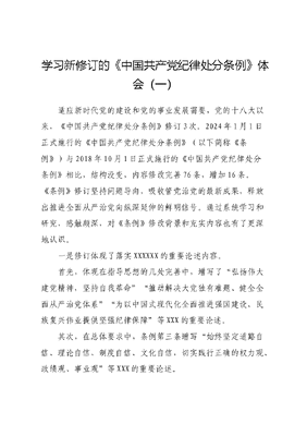 学习新修订的《中国共产党纪律处分条例》体会(一)适应新时代党的建设和党的事业发展需要,党的十八大以来,《中国共产党纪律处分条例》修订3次。2024年1月1日正式施行的《中国共产党纪律处分条例》(以下简称《条例》)与2018年10月1日正式施行的《中国共产党纪律处分条例》相比,结构没变,内容修改完善76条,增加16条。《条例》修订坚持问题导向,吸收管党治党的最新成果,释放出推进全面从严治党向纵深延伸的鲜明信号。通过系统学习和研究,感触颇深,对《条例》修改背景和充实内容也有了更深地认识。一是修订体现了落实XXXXXX的重要论述内容。首先,体现在指导思想的几处完善中,增写了弘扬伟大建党精神,坚持自我革命推动解决大党独有难题、健全全面从严治党体系为以中国式现代化全面推进强国建设、民族复兴伟业提供坚强纪律保障等XXX的重要论述。其次,在总体要求中,条例第三条增写始终坚定道路自信、理论自信、制度自信、文化自信,切实践行正确的权力观、政绩观、事业观等XXX的重要论述。再次,在纪律处分工作遵循原则《条例》第四条中,落实了XXX新时代全面从严治党的新要求,增写了把严的基调、严的措施、严的氛围长期坚持下去等内容。二是修订体现了贯彻党的XX大报告的精神。首先,体现在落实党的XX大提出的加快构建新发展格局,着力推动高质量发展的要求,《条例》新增一条第五十七条对领导干部政绩观错位,违背新发展理念、背离高质量发展要求的处分规定,并将搞劳民伤财的形象工程政绩工程的行为由违反群众纪律调整到违反此款政治纪律中。其次,体现在落实党的XX大报告关于推动干部能上能下、能进能出的要求,在组织纪律中增加了第八十五条对在推进领导干部能上能下工作中搞好人主义以党纪政务等处分规避组织调整或以组织调整代替党纪政务处分等避重就轻行为的处分规定,推动形成良好用人导向和从政环境。再次,体现在落实党的XX大报告关于加强干部斗争精神和斗争本领养成的要求,立足引导党员敢于担当、积极作为,在工作纪律中新增第一百三十条增加工作中不敢斗争、不愿担当面对重大矛盾冲突、危机困难临阵退缩,造成不良影响或者严重后果的处分规定。三是修订突出问题导向,坚决纠治形式主义、官僚主义。文可居文库——海量学习资料,手机电脑均可下载www.wenkeju.com首先,条例进一步增强了对搞形式主义、官僚主义行为的针对性处分规定。增写了脱离实际,不做深入调查研究,搞随意决策、机械执行慢作为、假作为,随意决策、机械执行,增加基层工作负担贯彻党中央决策部署只表态不落实违反精文减会有关规定搞文山会海在督查检查考核等工作中搞层层加码、过度留痕,增加基层工作负担等工作中形式主义、官僚主义行为的处分规定。其次,聚焦党员在履职尽责、规范用权方面存在的问题,条例在工作纪律中增写了多条处分规定,充实完善对统计造假、违反机构编制管理规定、不履行信访工作职责、滥用问责等行为的处分条款。再次,为推动解决新官不理旧账的问题,对党员领导干部对于到任前已经存在且属于其职责范围内的问题,消极回避、推卸责任,造成严重损害或者严重不良影响的行为的处理,增写了处分规定。第四,条例还加大对有关干预插手行为的规制力度。在分则工作纪律中《条例》增加一条第一百四十三条对按照有关规定对干预和插手行为负有报告和登记义务的受请托人,不按照规定报告或者登记,视情节给予党纪处分的规定。四是修订坚持与时俱进,与从严管党治党新制度呼应。文可居文库——海量学习资料,手机电脑均可下载www.wenkeju.com首先,维护了党纪新规定的严肃性,与相关规定同步更新。2022年中共中央办公厅《领导干部配偶、子女及其配偶经商办企业管理规定》,在条例廉洁纪律修订中就有多处体现。如,《条例》新增第一百零六条,对离职或者退(离)休后利用原职权或者职务上的影响,为配偶、子女及其配偶等亲属和其他特定关系人从事经营活动谋取利益;对离职或者退(离)休后利用原职权或者职务上的影响为他人谋取利益,本人的配偶、子女及其配偶等亲属和其他特定关系人收受对方财物等行为的处分规定。《条例》第一百零七条:党员领导干部的配偶、子女及其配偶,违反有关规定在该党员领导干部管辖的地区和业务范围内从事可能影响其公正执行公务的经营活动,或者有其他违反经商办企业禁业规定行为的处分规定等。其次,条例从执纪工作发现的问题出发,充实了对违反中央八项规定精神行为的处分规定,条例第一百一十九条增写了,对未经批准租用借用办公用房的处分规定;条例第一百一十八条在对违反会议活动管理规定条款中,增写了擅自举办创建示范活动或者借创建示范活动收费的处分规定。再次,条例从服务中心和大局的需要,进一步完善纪法衔接。对违法但未犯罪的党