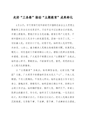 走好三条路推动主题教育成果转化4月3日,学习贯彻习近平新时代中国特色社会主义思想主题教育工作会议在北京召开。习近平总书记出席会议并强调,开展主题教育,要践行宗旨为民造福,教育引导广大党员、干部牢固树立以人民为中心的发展思想,坚持一切为了人民、一切依靠人民,自觉问计于民、问需于民,始终同人民同呼吸、共命运、心连心,着力解决人民群众急难愁盼问题,把惠民生、暖民心、顺民意的工作做到群众心坎上,增强人民群众获得感、幸福感、安全感。广大党员干部要以本次主题教育为起点,始终虚心学习、勇敢担当,不断续写为民、富民、利民的社会主义现代化新篇章。以主题教育为起点,始终踔厉奋发,走好为民解困之路。广大党员干部要始终坚定为民之心,不负人民期望,不负人民嘱托,不负民心所向,始终在基层工作中克己奉公、勤勉务实、励精笃行,始终坚持从群众中来、到群众中去的工作方法,始终胸怀国家、胸怀人民、胸怀天下,争做人民群众的勤务员、传令兵,始终为了人民的幸福,一往无前以赴之,夙兴夜寐以求之,不遗余力以成之;把对人民群众最深沉的热爱,化作敢干事、干实事,要干事、干成事的动力源泉,用一件件小事、一份份牵挂、一片片真情,来践行我将无我,不负人民的铮铮誓言,确保主题教育开出新成果。广大党员干部要始终牢记我是谁、依靠谁、为了谁这一根本问题,牢固树立为人民服务的宗旨意识,奋力锤炼实干担当、本领过硬的党员素质,真正把涉及群众切身利益的操心事、烦心事、揪心事解决好。以主题教育为起点,始终勇毅前行,走实为民担当之路。各级党组织要充分释放激励党员干部担当作为的强烈信号,让党员干部充满干劲闯劲,勇敢担起责任的重担,始终把人民群众放在最重要的位置,以主题教育为动力源泉,主动深入基层了解民生疾苦,了解制约人民群众发展的难题,千方百计、想方设法解决基层群众的实际困难,广大党员干部要始终秉持为人民服务、让人民满意发展理念,时刻把群众的安危冷暖放在心上、扛在肩上,深入基层一线找准群众所需、回应群众期盼,带头排查和收集产业发展、教育医疗、社会保障等重点领域存在的突出问题,从人民群众普遍关心的问题抓起,从最现实的利益出发,用心用情用力解决好群众的急难愁盼,切实增强人民群众的获得感、幸福感。以主题教育为起点,始终笃行不怠,走好为民造福之路。伟大的时代,必有领路人指引方向;伟大的事业,必有掌舵者沉着领航。我们坚信,在以习近平同志为核心的党中央坚强领导下,中华民族伟大复兴号巨轮必将乘风破浪、行稳致远。有习近平总书记做我们的主心骨,我们一定能战胜各种艰难险阻,能闯过各种暗礁险滩!广大党员干部要在习近平总书记的带领下,高擎为民造福、为民谋利、为民请命的大旗,始终奋力拼搏、真抓实干、笃行不怠、奋楫争先,以饱满的热情,踏实的脚步,深入基层、深入群众,了解人民需要、解决实际困难,不断积淀为民经验。群之所为事无不成,众之所举业无不胜。群众路线是党的根本路线,正是始终依靠人民群众、始终走群众路线,国家才能完成从站起来、富起来再到强起来的完美蜕变。广大党员干部要坚定不移走好新时代党的群众路线,通过各种渠道问政于民、问需于民、问情于民、问计于民,更好倾听民声、尊重民意、汇聚民智、顺应民心,及时解决群众诉求、给群众答疑解惑、为群众办好实事,推动主题教育稳步向前,再建为民新功。