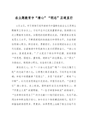 在主题教育中清心明志正道直行4月3日,学习贯彻习近平新时代中国特色社会主义思想主题教育工作会议上,习近平总书记发表重要讲话,强调要以这次主题教育为契机,加强党的创新理论武装,不断提高全党马克思主义水平,不断提高党的执政能力和领导水平,为奋进新征程凝心聚力,踔厉奋发、勇毅前行,为全面建设社会主义现代化国家、全面推进中华民族伟大复兴而团结奋斗。清心为治本,直道是身谋。广大党员干部当牢牢把握、深刻领悟学思想、强党性、重实践、建新功的总要求,以原文为基础点,做到清心明志,在奋进之路上正道直行。清贪欲之心,以一片冰心在玉壶明一切权力属于人民的忠诚干净之志,让理想之路正道直行。习近平总书记强调:年轻干部要勤掸思想尘、多思贪欲害、常破心中贼,以内无妄思保证外无妄动。回望历史长河,汪精卫们满心杂念、走上歧途,最终被钉在历史的耻辱柱上;而只要主义真的夏明翰、一肚子棉絮和树皮的杨靖宇、生命都交给党去了的方志敏……他们坚定信念、矢志不渝,用生命和鲜血践行初心。如今在这个物欲横流的时代,党员干部面临的诱惑更多、更复杂,如果思想上沾染了粉尘污垢不及时清理洗净,量变必将过渡为质变。因此广大党员干部要牢牢把握强党性的要求,主动把自己摆进去、把思想照进去,坚持把深化理论武装、加强党性修养作为终身课题来践行,时刻筑牢思想根基,守住原则底线,用规矩给自己的思想画好方圆。清无为之心,以一片丹心深国虑明俯首甘为孺子牛的实干担当之志,让实践之路正道直行。耳闻之不如目见之,目见之不如足践之。实践出真知,实践出政绩。从带领兰考群众治三害、拔穷根的好干部焦裕禄,到主动赴边疆、恋雪域的时代先锋孔繁森,从当樵夫的县委书记廖俊波,再到驻山村、献青春的扶贫干部黄文秀,共产党人用实际行动诠释了孺子牛的精神内涵。广大党员干部要把握好重实践的要求,学会将理论知识内化于心、外化于行,多主动走进百姓家中,深入田间地头,多听听家长里短,坚持服务群众不打烊不停摆,在与群众心连心零距离中当好知心朋友,进一步增强为人民服务的意识,提高为人民服务的本领。从实践中锤炼过硬的本领,夯实党员的实践根基,以扎实成效体现主题教育的积极效果。清功利之心,以臣心一片磁针石明功成不必在我的淡泊名利之志,让建功之路正道直行。习近平总书记强调年轻干部无论是立身处世还是从政干事,首先要解决好我是谁、为了谁、依靠谁的问题,不断追求我将无我,不负人民的精神境界。中国核潜艇之父黄旭华,为突破外国封锁,隐姓埋名30年,为国之重器奉献毕生心血;84岁的钟南山临危受命,不顾生命危险第一时间逆行抗疫一线,及时研判疫情,为控制疫情蔓延赢得先机;张桂梅扎根边疆教育一线40余年,帮助1800多名女孩走出大山……一代代中国共产党人甘为铺路人、为人民而无我,在各自岗位上做出了不平凡的成绩。新征程上,蓝图已经绘就,号角已经吹响。广大党员干部当按照党的二十大报告部署和要求,坚定听党话跟党走的信念,撸起袖子加油干,在奉献中建新功、找寻自我价值、彰显为民真谛,不断把党和国家的各项事业推进向前。