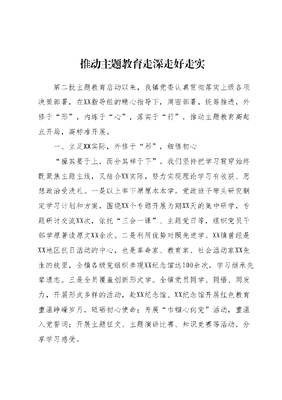 推动主题教育走深走好走实第二批主题教育启动以来,我镇党委认真贯彻落实上级各项决策部署,在XX指导组的精心指导下,周密部署,统筹推进,外修于形,内炼于心,落实于行,推动主题教育高起点开局,高标准开展。一、立足XX实际,外修于形,细悟初心操其要于上,而分其祥于下。我们坚持把学习贯穿始终既聚焦主题主线,又结合XX实际,努力实现理论学习有收获、思想政治受洗礼。一是以上率下原原本本学。党政班子带头研究制定学习计划和方案,围绕XX个专题开展为期XX天的集中研学,专题研讨交流XX次,依托三会一课、主题党日等,组织党员干部学原著读原文XX余次。二是利用优势对照先进学。XX镇曾经是XX地区抗日活动的中心,也是革命家、教育家、社会活动家XX先生的故里,全镇各级党组织参观XX纪念馆达100余次,学习继承先辈遗志。三是全员覆盖创新形式学。全镇党员同学、同悟、同发力,开展形式多样的活动,赴XX纪念馆、XX纪念馆开展红色教育重温峥嵘岁月,砥砺初心使命;开展巾帼心向党活动,重温入党誓词;开展主题征文、主题演讲比赛、知识竞赛等活动,分享学习感受。二、坚持实事求是,内炼于心,检视初心以人为鉴知得失,以史为鉴知兴替。我们坚持实事求是,以正视问题的自觉和刀刃向内的勇气,找存在差距,查自身不足,析初心使命。一是深入对标。组织开展初心是什么?使命干什么?奋斗比什么学习交流讨论,党政领导带头谈体会、明初心找差距。各级党组织召开专题学习讨论会,撰写心得体会,发表心灵感悟。二是深入调研。一方面,专题调研。紧扣发展稳定两大主题,重点围绕化解信访积案、发掘乡贤资源、聚力经济发展和群众关心的热点难点堵点问题选取调研方向,由党政领导带队到分工村和企业查问题、听真声、抓整改,形成XX篇专题调研报告。另一方面,认领调研。对各基层党组织采取上门座谈、问卷调查的形式了解主题教育开展情况、当前面临发展困境和对党委政府的意见和建议,发放问卷XX份,收集问题和为民办实事项目XX条。三是深入检视。召开座谈会,走访党员群众,配合挂钩市领导开展基层党建专项排查,全镇对照五个基本,查摆问题XX个,制定具体整改措施XX项,确定为民服务项目XX个。三、注重实际效果,落实于行,践行初心在真改实干中让初心使命外化于行,真正落实到行动中,讲实干,强服务,以解决问题的实效赢得群众满意。一是压实主体责任。按照抓主题教育XX个《责任清单》,党委书记带头示范,各基层党支部书记对照时间节点,全面履责尽责。二是落实难点问题。对检视过程中镇村两级查摆的问题进行重点办理,列出时间表,画好线路图,做好任务书,清单管理,月度跟踪,推动难题有效解决。如在解决XX新建工程重启的问题上,群众反映强烈党政一把手亲自全力以赴,多方协调,终于在XX月正式开工。在检视工作中,基层对加强意识形态和新时代文明实践载体建设呼声较高,我们引导社会力量参与,由地方乡贤投入XX万元,占地X亩的XX村级图书馆也于X月X日正式开工建设。三是抓实攻坚行动对照检视问题,配套出台专项整改方案,细化整改内容和措施,把主题教育作为推动全面工作的强大动力,在对X个软弱后进村的整改工作中,通过镇党委教育,第一书记帮扶,推动整改工作不断深入。开展村书记政治体检,听取党员群众对村书记的意见和建议,发放政治体检测评表,一对一谈话,收集党员干部群众意见,督促落实整改,夯实村级领头雁的政治能力和政治素质下一步,我们将认真落实本次推进会精神,紧扣学习贯彻新思想这一主线,坚持高标准严要求,持续抓好分类指导,全力推动主题教育取得实实在在的成效。