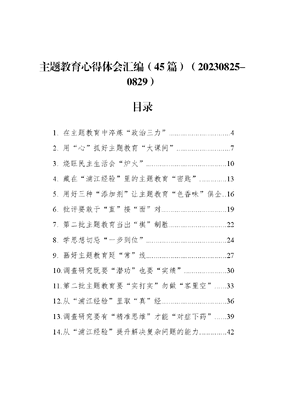 主题教育心得体会汇编(45篇)(20230825-0829)目录1.在主题教育中淬炼政治三力..42.用心抓好主题教育大课间.73.烧旺民主生活会炉火104.藏在浦江经验里的主题教育密匙..135.用好三种添加剂让主题教育色香味俱全..166.批评要敢于直接面对.197.第二批主题教育当出棋制胜228.学思想切忌一步到位249.画好主题教育延常线2710.调查研究既要潜功也要实绩.3011.第二批主题教育要实打实勿做客里空3312.从浦江经验里取真经.3613.调查研究要有精准思维才能对症下药3914.从浦江经验提升解决复杂问题的能力..4215.@党员干部主题教育要用点心..4616.走好浦江经验的亲民路、为民路、惠民路4917.三曲奏响以学铸魂的最强音.5118.@青年干部当在主题教育中学之有向..5319.绣好主题教育实字绣5620.第二批主题教育当谨防按下葫芦浮起瓢.5821.四步先行为第二批主题教育蓄能增势6122.批评要重点突出含真量..6323.主题教育评估要用事实说话6524.批评与自我批评要敢于爆料6925.奏响主题教育三重奏7126.行而不辍跑好主题教育接力赛7427.第二批主题教育需步步为赢7728.解锁浦江经验中的基层善治之道.8029.入心见行绽放第二批主题教育之花.8230.把握主题教育接力中的变与不变..8431.主题教育评估要看效果说话8732.第二批主题教育要开始更要开势..8933.第二批主题教育要把握三对关系.9234.真字做笔续写浦江经验新篇章9535.主题教育要真切勿了事9836.善用主题教育千万工程10137.以四次调研推动主题教育绵绵用力..10438.让以学促干再出发..10739.三个防止让高质高效贯通主题教育全过程.11040.第二批主题教育要行之有新.11341.在主题教育中学会以史、实、誓为鉴11542.主题教育要与问题较量11843.批评和自我批评要走深更走实.12044.给出第二批主题教育三道题的新解..123加减之间探寻主题教育最优解125在主题教育中淬炼政治三力当前,学习贯彻XXX新时代