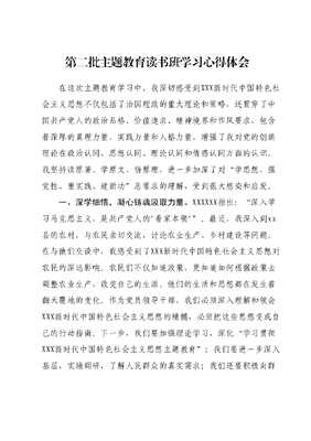 第二批主题教育读书班学习心得体会在这次主题教育学习中,我深切感受到XXX新时代中国特色社会主义思想不仅包括了治国理政的重大理论和策略,还贯穿了中国共产党人的政治品格、价值追求、精神境界和作风要求,包含着深厚的真理力量、实践力量和人格力量,增强了我对党的创新理论在政治认同、思想认同、理论认同和情感认同方面的认识。我坚持读原著、学原文、悟原理,进一步加深了对学思想、强党性、重实践、建新功总要求的理解,受到很大感染和启发。一、深学细悟,凝心铸魂汲取力量。XXXXXX指出:深入学习马克思主义,是共产党人的'看家本领'。最近,我深入到xx县的农村,与农民亲切交流,讨论农业生产、乡村建设等问题。在与他们交谈中,我感受到了XXX新时代中国特色社会主义思想对农民的深远影响。农民们不仅知道政策,更知道如何根据政策去调整农业生产,改变自己的生活。他们的生活和思想都在发生着翻天覆地的变化。作为党员领导干部,我们必须深入理解和领会XXX新时代中国特色社会主义思想的精髓,必须把这些思想变成自己的行动指南。下一步,我们要加强理论学习,深化学习贯彻XXX新时代中国特色社会主义思想主题教育;我们要进一步深入基层,实地调研,了解人民群众的真实需求;我们还要积极向群众宣传XXX新时代中国特色社会主义思想,让更多人明白这些思想的实际意义。二、躬身下沉,狠抓调研破解难题。XXXXXX指出:真正的能量不是在会议室里,而是在一线。去年,xx县在建设一个重大项目过程中遇到了很大的困难。为了解决这个问题,我带领团队深入项目现场,与建设者、群众面对面沟通,了解问题的真实情况。经过多次调研和深入研究,我们终于找到了破解难题的方法,项目顺利推进,为县里创造了巨大的经济效益。作为党员领导干部,我们必须坚持到基层去,到一线去,真实了解问题,找出问题的根本原因。下一步,我们要加强与基层的沟通及时了解和解决群众的实际困难;我们要加强项目建设的监管,确保每一个项目都能够顺利完成;我们还要不断深化改革,创新管理模式,提高工作效率。三、敢当善为,靶向发力奋楫争先。XXXXXX指出:必须敢于担当,善于作为,努力做到守正创新。在xx县推进乡村振兴战略的过程中,我们积极引入先进的农业技术,帮助农民提高农业生产效率,增加农民的收入。同时,我们还大力发展乡村旅游使得乡村不仅有了美丽的景色,还有了经济效益。作为党员领导干部,我们必须敢于作为,善于担当,为人民群众创造更多的实际利益。下一步,我们要进一步加强乡村振兴战略的实施,确保每一项政策都能真正落地生根;我们要大力支持农民创业,为他们提供技术、资金等支持;我们还要进一步加强乡村基础设施建设,为乡村的可持续发展提供坚实的基础。总之,学习贯彻XXX新时代中国特色社会主义思想,对于我们xx县来说,不仅是一个理论任务,更是一个实际行动。我们要真正做到学以致用,把学到的知识转化为实际的工作成果,为xx县的发展和人民的幸福生活做出更大的贡献