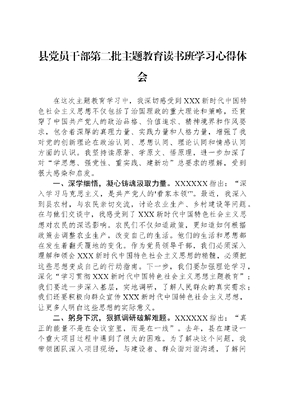 县党员干部第二批主题教育读书班学习心得体会在这次主题教育学习中,我深切感受到XXX新时代中国特色社会主义思想不仅包括了治国理政的重大理论和策略,还贯穿了中国共产党人的政治品格、价值追求、精神境界和作风要求,包含着深厚的真理力量、实践力量和人格力量,增强了我对党的创新理论在政治认同、思想认同、理论认同和情感认同方面的认识。我坚持读原著、学原文、悟原理,进一步加深了对学思想、强党性、重实践、建新功总要求的理解,受到很大感染和启发。一、深学细悟,凝心铸魂汲取力量。XXXXXX指出:深入学习马克思主义,是共产党人的'看家本领'。最近,我深入到县农村,与农民亲切交流,讨论农业生产、乡村建设等问题。在与他们交谈中,我感受到了XXX新时代中国特色社会主义思想对农民的深远影响。农民们不仅知道政策,更知道如何根据政策去调整农业生产,改变自己的生活。他们的生活和思想都在发生着翻天覆地的变化。作为党员领导干部,我们必须深入理解和领会XXX新时代中国特色社会主义思想的精髓,必须把这些思想变成自己的行动指南。下一步,我们要加强理论学习,深化学习贯彻XXX新时代中国特色社会主义思想主题教育;我们要进一步深入基层,实地调研,了解人民群众的真实需求;我们还要积极向群众宣传XXX新时代中国特色社会主义思想,让更多人明白这些思想的实际意义。二、躬身下沉,狠抓调研破解难题。XXXXXX指出:真正的能量不是在会议室里,而是在一线。去年,县在建设一个重大项目过程中遇到了很大的困难。为了解决这个问题,我带领团队深入项目现场,与建设者、群众面对面沟通,了解问题的真实情况。经过多次调研和深入研究,我们终于找到了破解难题的方法,项目顺利推进,为县里创造了巨大的经济效益。作为党员领导干部,我们必须坚持到基层去,到一线去,真实了解问题,找出问题的根本原因。下一步,我们要加强与基层的沟通,及时了解和解决群众的实际困难;我们要加强项目建设的监管,确保每一个项目都能够顺利完成;我们还要不断深化改革,创新管理模式,提高工作效率。三、敢当善为,靶向发力奋楫争先。XXXXXX指出:必须敢于担当,善于作为,努力做到守正创新。在县推进乡村振兴战略的过程中,我们积极引入先进的农业技术,帮助农民提高农业生产效率,增加农民的收入。同时,我们还大力发展乡村旅游,使得乡村不仅有了美丽的景色,还有了经济效益。作为党员领导干部,我们必须敢于作为,善于担当,为人民群众创造更多的实际利益。下一步,我们要进一步加强乡村振兴战略的实施,确保每一项政策都能真正落地生根;我们要大力支持农民创业,为他们提供技术、资金等支持;我们还要进一步加强乡村基础设施建设,为乡村的可持续发展提供坚实的基础。总之,学习贯彻XXX新时代中国特色社会主义思想,对于我们县来说,不仅是一个理论任务,更是一个实际行动。我们要真正做到学以致用,把学到的知识转化为实际的工作成果,为县的发展和人民的幸福生活做出更大的贡献。