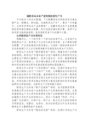 前瞻布局未来产业发展新质生产力中央经济工作会议强调,以颠覆性技术和前沿技术催生新产业、新模式、新动能,发展新质生产力,要求开辟量子、生命科学等未来产业新赛道。前瞻布局未来产业是重塑国际竞争新优势的必答题,是打造经济增长新引擎、培育产业体系新支柱的抢答题,是发展新质生产力的重中之重。认识新质生产力本质特征观瞻历史,一个时代有一个时代的未来产业。从未来产业看新质生产力,新质生产力由技术革命性突破、生产要素创新性配置、产业深度转型升级而催生,代表新一轮科技革命和产业变革浪潮下从工业化转型向数字化转型的先进生产力质态。新质生产力具有高质量发展特征。随着未来产业的群体性涌现,新质生产力意味着社会生产函数发生质的跃迁变化、全要素生产率的大幅提升,更多凸显技术、知识、数据等新型生产要素的密集投入,经济增长模式从更多依靠增加要素数量的外延式增长转向更多依靠创新驱动的内涵型增长。新质生产力具有大科创驱动特征。区别于传统生产力面临的关键核心技术卡脖子问题,以颠覆性技术和前沿技术催生的未来产业不断发展,意味着新质生产力在新一轮科技革命与我国加快转变经济发展方式的历史性交汇中逐步孕育形成。科技创新从更多依靠应用研究与集成创新转向更多依靠基础研究与原始创新,为新质生产力构筑强大基石。新质生产力具有新产业载体特征。技术密集度更高、发展潜力更大的未来产业是新质生产力发展的集中体现,这意味着新质生产力从更多依靠原有支柱产业的持续扩张转向更多依靠新兴支柱产业的培育壮大,通过一体推进科技—产业—金融良性循环,以新产品、新产业、新业态为代表的供给体系明显优化。完整性、先进性、安全性的现代化产业体系构成新质生产力最鲜明的产业载体。新质生产力具有强比较优势特征。区别于传统生产力依托的人口资源禀赋优势,未来产业高度依赖于数据资源投入。我国拥有的数据资源快速增长,未来有可能成为全球最大的数据圈,这意味着新质生产力对应的生产要素规模与结构发生深刻变化,其中数据成为最具时代特征的生产要素,数据快速融入生产、分配、流通、消费等各环节,加速线上线下、生产生活、国内国际全面贯通。数据比较优势的赋能效应将推动发展方式、经济结构、增长动力发生根本性改变。前瞻布局未来产业意义重大作为新质生产力最活跃的先导力量,未来产业处于产业萌芽阶段,但能对经济社会起到全局性引领性变革作用。从未来产业洞察新质生产力,新质生产力既具有先发效应,即先行国家与地区一旦在技术创新与产业转化上取得突破,就能够迅速构筑包括知识产权、产品标准等在内的先发壁垒;也具有融合赋能效应,未来材料、未来网络等能够广泛渗透传统产业链上下游各个环节,引领传统优势产业高端化、智能化、绿色化转型;还具有路径颠覆效应,能够不断突破人类认知极限和物理极限、拓展新的发展空间,深刻改变经济活动运行方式与企业组织经营模式等。抢占国际竞争制高点的迫切需要。未来产业正成为当前及今后较长时期全球产业竞争最激烈的战略必争之地。从全球形势看,美国、欧洲等纷纷出台战略规划,前瞻布局未来产业。从历史镜鉴看,在光刻机、工业软件、操作系统等上世纪70年代至80年代的未来产业领域,我国起步并不晚,但由于技术、市场、政策等因素制约,这些当时的未来产业没有得到有效培育壮大,一定程度上导致出现当前关键核心技术卡脖子问题。结合全球形势与历史镜鉴,前瞻布局未来产业、加快形成新质生产力刻不容缓,是增强自主发展能力、锻造非对称技术优势不容错过的战略机遇。打造经济增长新引擎的战略选择。当前,我国经济回升向好面临一些困难挑战,前瞻布局未来产业,既有利于培育发展文可居文库——海量学习资料,手机电脑均可下载www.wenkeju.com一批产业规模大、带动能力强的新支柱产业,为建设现代化产业体系提供更为坚实的战略支撑,也有利于增强经济发展韧性,不断增强国内大循环内生动力和可靠性、提升国际循环质量和水平,推动经济实现质的有效提升和量的合理增长。发挥体制机制和市场优势随着新一轮科技革命和产业变革深入推进,围绕未来产业的全球竞争越来越激烈,对于我国而言,前瞻布局未来产业、加快形成新质生产力关键要在体制机制、市场产业等方面发挥自身优势、探索特色模式。一方面,发挥有为政府作用,突出新型举国体制优势。从技术支撑看,发挥新型举国体制优势在于集中力量建设大科学装置,组建适应未来产业发展需要的新型研发机构,组织重大科研计划,强化国家战略科技力量,大幅提升科技攻关体系化能力,在若干重要领域形成竞争优势、赢得战略主动。从产业支撑看,发挥新型举国体制优势在于通过国家发展规划、专项规划以及重大工程、重大项目、重大改革等,围绕国家战略需求,超前部署一批事关国家长远发展的未来产业,全国一盘棋引导地方政府、各类企业加大对未来产业的支持。另一方面,发挥有效市场作用,突出超