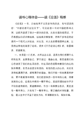 读书心得体会——读《论语》有感《论语》一书,已经有两千五百多年的历史,有句话说的好:半部论语可以治天下。可见论语一书对中国的影响之深,以前只是读了很少一部分的论语,从未全面的阅读过,于丹教授以白话诠释经典,以经典诠释智慧,把两千多年前的论语用一个现代人对社会,对生活,对人生的感悟演绎出来,让我得以系统的阅读了论语。读完《于丹论语心得》后,收获颇多,受益匪浅。一、生活是一门艺术。之所以这么说,是因为我们想要什么样的生活,主要靠自己,罗兰说过:境由心生,意思是我们的心态决定了我们的生活状态,对生活的态度影响着我们内心的快乐程度。生活永远是没有错的,有错的是人的心态,无论生活将机遇赐予谁,都有赐予的理由,我们不能一味的羡慕和妒忌,更不能奚落和哂笑,我们应该保持一份平和的心境,抱着淡然的心态,在得失中保持一颗平常心。其实所谓的好日子并不仅仅是物质的,更是精神的。作为一名国家公务员,更应该有一颗平常心,只有有了一颗平常心,要正确的对待财富、职位,在人生中才不至于迷失方向,所谓塞翁失马,焉知非福。二、少指责、少抱怨,少后悔,就能成功。于丹《论语心得》中有这么一个故事:一个孩子十分爱发脾气,于是父亲让他每发一次脾气就在篱笆上敲一颗钉子,一天下来,孩子看见他敲了许多钉子,心里很不好意思,父亲便让他如果一天不发脾气,就拔一颗钉子,当钉子拔完时,孩子高兴极了,因为他学会了克制,可是父亲却告诉他虽然钉子拔了,但却会留下一个个不能消除的洞。这个故事让我们明白了一个道理,我们做事一定要先往远想,这样避免对别人的伤害,也减少自己将来的悔恨。作为一名普通的公务员,只有爱岗敬业,乐于奉献,竭尽全力地干好本职工作;自觉自愿地约束自己,规范自己的言行,做到一心一意为人民服务、廉洁高效。做任何工作都不抱怨、不指责,默默工作、默默奉献,相信自己的人生就是完美的,因为自己做出了实实在在的事情,就会对自己的人生无怨无悔。三、做一个好学的人,与人为友。近朱者赤、近墨者黑这是一句老话,还有一句当局者迷、旁观者清,我们既然是社会人,就必然要和他人交往,三人行,必有我师,每个人不管他身处何位,身居何职,不管他是贫穷还是卑微,其身上都有我们值得学习的地方,和别人交往时,我们要学习他们的长处,要经常倾听他们对自己的意见和建议,以利于自己快速成文可居文库——海量学习资料,手机电脑均可下载www.wenkeju.com长,真正的朋友就是那种心胸正直的人,敢于直指你的缺点,因为有时候我们往往自己看不清自己,有些迷失,这时候一句关键的话甚至会改变我们的一生。另外我们要重视学习,要终身学习,知识会让我们永远年轻,我们要不断丰富自己的学识,提升业务工作能力,养成良好的行为准则。四、谨慎交友,交可靠朋友。人们常说,在家靠父母,出门靠朋友。社会环境中朋友是最重要的,从你的朋友身上可以照见自己的影子。其实人这一生有什么样的朋友直接反映他是一个什么样的为人,好朋友就是一本书,他可以打开整个你的世界。我们经常说物以类聚,人以群分。什么样的人你只要观察他的社交圈子,从这样一个外在环境是可以看到他自己内心价值取向。那么什么样的朋友对我们来说才算是好朋友,好朋友的标准是什么,会给我们的生活事业带来什么样的帮助;什么样的朋友算是坏朋友,会给我们的人生带来怎样的影响,我们又如何来分辨好朋友和坏朋友呢?于丹教授在讲论语时,谈及交友就有非常明确的标准,谓之,益者三友损者三友。也就是说,好朋友有三种,坏朋友也有三种:友直、友谅、友多闻,益矣;友偏辟、友善柔、友便妄,损矣。友直就是说要为人正直,要坦荡要刚正不阿,一个人不能有谄媚之色,要有一种朗朗人格,在这个世界上顶天立地,他的人格可以映校你的人文可居文库——海量学习资料,手机电脑均可下载www.wenkeju.com格,他可以在你怯懦的时候给你勇气;他可以在你犹豫不前的时候给你一种果断,这是一种好朋友;友谅,也就是宽容的朋友,其实宽容有的时候是一种美德,他是这个世界上最深沉的美德之一,我们会发现,当我们不小心犯了过错或者对他人造成伤害的时候,有时候过分的苛责还有一种批评,都不如宽容的力量来得恒久。其实有时候最让我们内心受不了的是一个人在忏悔的时候没有得到他人的怨气反而得到淡淡的一种包容,所以有一个好朋友,他会给我们内心增加一种自省的力量;宽容的朋友不会使我们堕落或者更多的放纵自己反而会让我们从他人的内心包容上找到自己的弊病,找到自己的缺失。所以宽容的好朋友,是一种做人的情怀,是我们在失落时需要的关怀,是黑暗中所需要的光明。友多闻,就是见多识广,学识渊博的朋友,当你在这个社会上感到犹豫彷徨有所踌躇的时候,到朋友那里以他的广见博识为你做一个参考,来帮助自己做出选择。知道了三种好朋友,同时,还有三种坏朋友,叫做友偏辟、友善柔、友便妄,这