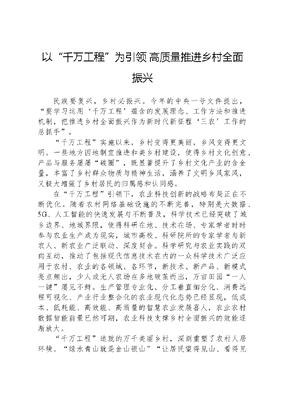以千万工程为引领 高质量推进乡村全面振兴民族要复兴,乡村必振兴。今年的中央一号文件提出,要学习运用千万工程蕴含的发展理念、工作方法和推进机制,把推进乡村全面振兴作为新时代新征程三农工作的总抓手。千万工程实施以来,乡村变得更美丽,乡风变得更文明。一些地方因地制宜推进和美乡村建设,使得乡村文化创意、产品与服务屡屡破圈,既显著提升了乡村文化产业的含金量,丰富了乡村群众物质与精神生活,涵养了文明乡风家风,又极大增强了乡村居民的归属感和认同感。在千万工程引领下,农业科技创新的战略布局正在不断优化。随着农村网络基础设施的不断完善,特别是大数据、5G、人工智能的快速发展与不断普及,科学技术已经突破了城乡边界、地域界限,使得科研在地、技术在场、专家学者时时参与农业生产成为现实,城市高校、科研院所的专家学者与新农人、新农业广泛联动、深度契合。科学研究与农业实践的双向互动,推动了包括现代信息技术在内的一众科学技术广泛应用于农村、农业的各领域、各环节,新技术、新产品、新模式亮点频出,少人或无人农场在多地破茧而出,万亩田园一人一键屡见不鲜。生产管理专业化、分工垂直细分化、消费远程可视化、产业行业整合化的农业现代化态势已经显现,低成本、低耗能、高效能、高质量的智慧农业发展喜人,农业农村数据智能前景已然可期,农业科技支撑乡村全面振兴的效能逐渐放大。千万工程造就的万千美丽乡村,深刻重塑了农村人居环境。绿水青山就是金山银山让居民望得见山、看得见水、记得住乡愁已成为乡村全面振兴的价值取向和现实路径。多地围绕家园、田园与资源谱写绿色华章,在持续深入打好污染防治攻坚战,一体化推进乡村生态保护修复,加强农业面源污染综合防治的同时,着力构建生态+科技型新生产模式、培育生态+简约型新生活方式。以人与自然和谐共生的绿色发展新动能,做强做大乡村全面振兴中的生态经济蛋糕;以绿色生活、绿色消费新样态,做深做实乡村生态文明建设。如今,良好的生态环境已成为乡村全面振兴中最普惠也最实惠的民生福祉。推进中国式现代化,必须坚持不懈夯实农业基础,推进乡村全面振兴。内涵不断深化的千万工程,是实现乡村增美、增绿,农民增收、增福,高质量推进乡村全面振兴的关键引领与康庄大道。在新的发展阶段,更需要凝聚包括情系家乡的专家学者在内的各方智慧与力量,广泛增强乡村全面振兴的共同体意识,依托新农人的根本性主体作用,树立更多千万工程新航标,让广袤的农村大地成为亿万人民幸福美好的生产生活家园。文可居文库——海量学习资料,手机电脑均可下载www.wenkeju.com