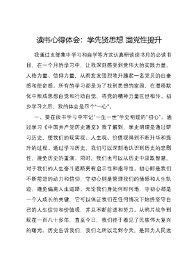 读书心得体会:学先贤思想 固党性提升我通过支部集中学习和自学等方式认真研读读书月的必读书目,在一个月的学习中,让我深刻感受到党伟大的实践力量、人格力量、信仰力量,从而愈发强烈地升腾起一名党员的自豪感和使命感。所有的学习都是为了找到思想的家园,在潜移默化中形成思想自觉和行动自觉,将党的精神力量巨世相传。初步学习之后,我的体会是四个一心。一、要在读书学习中牢记一生一世学史明理的初心。通过学习《中国共产党历史通览》我了解到,学史明理是通过研习历史,使我们的现实观、人生观、价值观得到不断升华和提升的过程。通过学习历史,我们可以深刻地认识到历史的悲剧性,避免历史的重演。同时,我们也可以从历史中汲取智慧,对于我们的人生奋斗道路更有启示性和指导性。初心即是我们不断前进的动力和信仰,守初心则是管理我们的情感和人生轨迹,避免偏离人生道路。无论我们身处何时何地,守初心都是一个人成长的关键,它可以保证我们在任何情况下始终坚守自己的人生信仰和价值观,并且不断前进和努力。从鸦片战争到现在一百八十多年,直至今日,我们终于看见了民族伟大复兴的曙光。历史告诉我们,我们之所以走到今天,是因为人民选择了正确的主义,主义催生了伟大的党,党产生了卓越的领袖领袖指明了正确的方向。所以,学党史,就是要搞清马克思主义为什么行,中国共产党为什么能,中国特色社会主义为什么好。作为青年党员,学习党史让我们在迷雾中找到信仰的罗盘,擦亮光荣的称号,时刻以党员自豪。二、要在读书学习中保持一点一滴学史增信的赤心。只有理论上的清醒,才有政治上的坚定。XXXXXX指出:中国共产党人依靠学习走到今天,也必然要依靠学习走向未来。在读《中国共产党历史通览》、《苦难辉煌》、《毛泽东文选》这几本书时,我深深感受到,以史为镜,可以知兴替。一百年来,披荆斩棘、历经风雨,战胜了一次又一次艰难险阻。在那风雨如磐的时光里,无数英雄烈士用血肉身躯传递绵绵革命火种,伟岸领袖先锋以坚定信念领导先进大义政党。中国能够由软弱贫穷、落后挨打的国家转变为独立自主屹立于世界民族之林的强国,都是先辈们浴血奋战的结果。这伟绩将永远载入史册,铭刻在每一个华夏儿女的心中,激励全国人民开辟复兴之路。作为警校生,我们更要知史爱党、不忘初心、砥砺奋进;尊重历史、立足眼前、放眼未来,不断在学习中锤炼自身党性修养,并从中汲取更多积极力量。文可居文库——海量学习资料,手机电脑均可下载www.wenkeju.com三、要在读书学习中坚定一心一意学史崇德的决心。我们应始终坚持把提升党性修养、道德情操作为必修课,深刻认识对党忠诚是共产党人首要的政治品质,对党忠诚必须一心一意、一以贯之,必须表里如一、知行合一,任何时候任何情况下都不改其心、不移其志、不毁其节,与党同心同德。深刻认识以德修身、以德立威、以德服众是干部成长成才的重要因素。广大党员干部应做守德的践行者、示范者,始终厚植人民至上情怀,厚植良好家风,守望道德高线,严守纪律底线,始终慎独慎微、严于律已,始终以天下为己任、以廉洁修身齐家,任何时候都能经受住诱惑、经得起考验、挺直共产党人精神脊梁,交出不负时代、不负人民的合格答卷。心中有信仰,脚下有力量。新时代新征程,面对世界百年未有之大变局,行走在全面建设社会主义现代化国家新征程中,作为一名党员干部就应在学习党史中明大德、守公德、严私德,让党的光荣传统和优良作风永放光芒,必能在新时代长征路上赓续精神、续写荣光。四、要在读书学习中常存一硅一步思想力行的恒心。敢于作为,勇于担当,是中国共产党人的立身之本、为政之基,也是成事之要。对于各级干部来讲,学史力行既体现在能不能以高的政治站位、高的政治标准要求自己上,更体现在能不能立足文可居文库——海量学习资料,手机电脑均可下载www.wenkeju.com岗位,讲担当、办实事、开新局。在学习的过程中,学会正视问题、解决问题,在党史中寻找问题的解决方法,走出机关,走进群众,学会用群众工作方法来做基层工作。在经典书籍中学习大局、格局思维,在工作中咬定青山不放松,在全局中胸怀功成不必在我的政绩观,一切为了人民,体悟"江山就是人民,人民就是江山。文可居文库——海量学习资料,手机电脑均可下载www.wenkeju.com