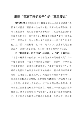 细悟看准了就抓紧干的三重要义XXXXXX参加他所在的十四届全国人大二次会议江苏代表团审议时提出要抓住一切有利时机,利用一切有利条件,看准了就抓紧干,把各方面的干劲带起来。从去年底召开的中央经济工作会议,到今年两会,XXX多次强调看准了就抓紧干,深思细悟,这句话蕴含着三重要义——从准处看方向,从紧处抓机遇,从干处下实功,三重要义层层递进深入,为我们攻坚克难、担当实干提供了科学的方法论。以规虑揣度,敢以定谋的韬略,从准处看方向。对于一艘没有方向的船,来自任何方向的风都是逆风一个错误的决策,一百个行动也无法挽救,这说明,干事创业不仅要有目标,而且目标要谋得准。看准了就抓紧干,强调的就是要以正确的方向牵引正确的行动,要求我们必须提高站位、认清方位、把准规律。广大党员干部做到看得准,首先就是要提高政治站位,深学细悟XXX新时代中国特色社会主义思想,牢固树立大局观念,把工作放到全局中去思考,看准本地区在国家战略全局中的定位,增强以一个区域服务全局的意识。党员干部要做到看得准,还要善于运用发展的眼光、系统的思维和辩证的逻辑去分析现象、认识本质,要运用科学的思维方式牢牢把握新时代各项工作的规律性,从中找到牵引性和撬动性强的发展锚点、工作抓手,提升工作的可行性、前瞻性,避免主观盲目性,牢牢掌握能动性和主动权,推动党和国家各项事业向好发展。以时不我待,只争朝夕的锐意,从紧处抓机遇。所当乘者势也,不可失者时也,XXX看准了就抓紧干的号召,字里行间流露的是时不我待的紧迫感。放眼世界,面临百年未有之大变局,新一轮科技革命和产业变革形成的国际竞争日益激烈,发展机遇转瞬即逝,不进则退、慢进亦退。着眼国内,现代化建设还存在不少堵点、短板,容不得走神观望,必须快马加鞭予以推进。广大党员干部要深刻意识到机不可失、时不再来,拿出只争朝夕的奋斗姿态和雷厉风行的工作作风,保持稍不留神就会被out的紧迫感,加强对新领域、新知识的学习,提高自身能力素质,以自身过硬的本领来应对外部环境的不确定性。要坚决摒弃一切守旧思维、守摊作风和懒汉思想,在不待扬鞭自奋蹄的自我加压中不断突破自我、适应形势、开拓新局,从而赢得主动、赢得优势、赢得未来。以行则将至,为者常成的踏实,从干处下实功。看准了是出发点,抓紧是关键点,干才是最终的文可居文库——海量学习资料,手机电脑均可下载www.wenkeju.com落脚点和根本目的,世间万事,最终都是要落实到两横一竖一个干字上来,否则便没有任何实践意义。看准了就抓紧干就是叮嘱我们,要把看准了的、定下来的事情一件一件落到实处。广大党员干部要争当执行者、行动派、实干家,把形式主义、官僚主义等不良风气从身上彻底革除,从自身的岗位做起,不小看任何一件小事,不忽视任何一个细小环节,把马上就干、真抓实干、干就干好的精气神立起来。要做到吾日三省吾身,反复叩问初心,以不忘来时路的自觉性、走好脚下路的责任心,扎扎实实把党中央的决策部署、省委的工作要求在各地各领域落实好。要把个人理想同国家的前途、民族的命运有机结合起来,把个人的选择和社会的需要、人民的需要有机结合起来,秉持我将无我的事业格局,在平凡的岗位上干出不平凡的成绩。文可居文库——海量学习资料,手机电脑均可下载www.wenkeju.com