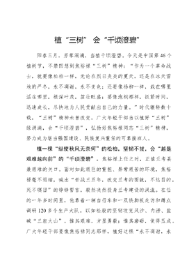 植三树 会千顷澄碧阳春三月,芳草涓滴,当植千顷澄碧。今天是中国第46个植树节,不禁回想到焦裕禄三树精神:作为一个革命战士,就要像松柏一样,无论在烈日炎炎的夏天,还是在冰天雪地的严冬,永不凋谢,永不变色;还要像杨柳一样,栽在哪里活在哪里,根深叶茂,茁壮旺盛;要像泡桐那样,抓紧时间,迅速成长,尽快地为人民贡献出自己的力量。时代辗转数十载,三树精神未曾改变,广大年轻干部当以植好三树绿涓滴,会千顷澄碧,弘扬好焦裕禄同志三树精神,努力成为堪当强国建设、民族复兴重任的可靠接班人。植一棵纵使秋风无奈何的松柏,坚韧不拔,会越是艰难越向前的千顷澄碧。焦裕禄上任之时,正值兰考县最艰难的关口。面对如此艰巨的重担、异常艰苦的环境,焦裕禄毫不退缩,喊出苦战三五年,改变兰考的面貌,不达目的,死不瞑目的铮铮誓言,毅然决然投身兰考建设的洪流。在任的一年多时间里,他靠着一辆自行车和一双铁脚板走访和蹲点调研120多个生产大队,以如松般的坚韧攻克风沙、内涝、盐碱三座大山。惟其艰难,方显勇毅;惟其磨砺,使得玉成。广大年轻干部要像焦裕禄同志那样,植好这棵永不凋谢,永不变色的松柏,以大雪压青松,青松挺且直的坚韧、敢教日月换新天的气魄、踏平坎坷成大道的闯劲,迎难而上、不畏困苦,跨过一沟再越一壑,翻过一山再登一峰,不断攻克前行中娄山关腊子口,在平凡岗位作出不平凡业绩。植一棵一树春风千万枝的杨柳,敢于斗争,会而今迈步从头越的千顷澄碧。焦裕禄决心改变兰考积贫积弱的旧貌,为了彻底整治三害,焦裕禄不顾肝部疼痛,风餐露宿、披星戴月,亲自带领一百余名三害调查队员,在雨最凶、风最猛、沙最大的地方,追洪水、查风口、探流沙。经过五千余里的艰苦跋涉,全县所有的沙丘、风口、河流都被一一绘图编号,为治理兰考三害奠定了最扎实、最科学的基础。天行健,君子以自强不息。广大年轻干部要像焦裕禄同志那样,植好这棵根深叶茂,茁壮旺盛的杨柳,以无心插柳柳成荫的顽强生命、吹尽狂沙始到金的坚韧不拔、不破楼兰终不还的如磐意志,在最艰苦的环境中也能茁壮成长、根深叶茂,真正做到逢山开道、遇水架桥,到艰苦环境中百炼成钢、在风险挑战中淬火成金,昂首阔步新征程。植一棵数叶迎风尚有声的泡桐,只争朝夕,会关山文可居文库——海量学习资料,手机电脑均可下载www.wenkeju.com初度尘未洗的千顷澄碧。肝部的疼痛愈发剧烈,但焦裕禄毫不在意,始终战斗在工作一线。病是个欺软怕硬的东西,你压住他,他就不欺侮你了。焦裕禄使用压迫止痛法对抗着痛楚,用硬物一头抵着腰、一头抵着藤椅,久而久之藤椅也被顶出了大窟窿。1964年,焦裕禄累倒在岗位上,直到生命最后一刻,仍然为改变兰考面貌而奋战着。生也沙丘,死也沙丘,生死父老系。广大年轻干部要像焦裕禄同志那样,植好这棵抓紧时间,迅速成长的泡桐,以一日不为,三日不安的责任感、我将无我,不负人民的使命感、今天再晚也是早,明天再早也是晚的紧迫感,苦练内功、修养功底,将乡村振兴一线等急难险重岗位作为壮筋骨、长才干的营养剂,迅速成长成熟,为人民对美好生活的向往贡献出全部力量。文可居文库——海量学习资料,手机电脑均可下载www.wenkeju.com