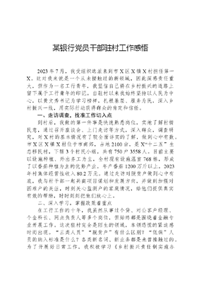 某银行党员干部驻村工作感悟2023年7月,我受组织选派来到市X区X镇X村担任第一X。这对我来说是一个从未接触过的新领域,因此深感责任重大,但作为一名工行青年,我坚信自己将在乡村振兴的道路上留下属于工行青年的印记。自驻村以来我始终坚持以人民为中心,以黄文秀书记为学习榜样,扎根基层、服务为民,深入乡村振兴一线,用实际行动获得群众的肯定和信任。一、走访调查,找准工作切入点到村后,我做的第一件事是快速熟悉岗位,实地了解村情民意,通过召开座谈会、上门走访等方式,深入群众,调查研究,对X村的基本情况有了较全面详实的了解,做到心中有数。市X区X镇X村位于市南郊,占地2100亩,是X十二五生态移民村,下辖3个村民小组,共有750户3558人。目前主要以设施种植、外出务工为主,全村现有设施温室768栋,形成了以番茄种植为主的优势产业,年产番茄1200万斤以上,2023年村集体经营性收入80.2万元。通过走访对脱贫户做到心中有底,我与村干部一起共商项目谋划和发展方向,并做到加强对困难户的关注,时刻关心监测户的家庭情况,给他们提供真实有效的帮助,时时刻刻把他们放心上。二、深入学习,掌握政策着重点在工行工作的十年,我虽然从事过个贷、对公客户经理、个金科长、网点负责人等多个岗位,但始终都是围绕着金融专业开展工作。这次驻村完全是陌生的领域,本领恐慌的紧迫感时而出现。三类人员脱贫户有什么区别?低保人员的纳入标准是什么?各类新名词、新业务都是未曾接触过的。为了开展好日常工作,我积极学习《乡村振兴责任制实施办法》《防返贫动态监测和帮扶机制》等各类政策文件,同时还通过工银研修中心学习掌握行内的种植e贷富宁贷等新产品新业务,进一步提升自身综合水平。通过学习逐步了解驻村工作的主要内容和工作方法,以及如何结合自己所擅长的金融工作开展好驻村帮扶工作,理清了思绪。三、融入乡村,用心为民办实事我虽然缺乏基层工作经历,但我来自农村,对农村、农民有天然的亲切感。驻村之后,我发挥自身优势,迅速转变角色融入农村和群众,驻进百姓心坎里。自驻村工作以来,我组织驻村工作队共走访全村三类人员、脱贫户、低保户等人群共420余户、540余次,三个村民小组入户达到全覆盖,建立八必访台账,详细记录、分析每户家庭的家庭成员和收入情况,对于存在返贫风险的农户及时纳入监测对象,同时针对每户具体情况,制定帮扶措施。2023年新纳入监测户8户,做到早发现、早帮扶,形成完整的动态监测帮扶闭环。X村果蔬仓储分拣中心,目前是X区内最大的乡村番茄交易市场,吸引全国各地百余家收购商入驻收购西红柿。在日常的入户过程中我了解到,果树分拣中心东侧的道路破损严重,交易高峰时期经常造成西红柿破损浪费。于是我积极争取行内帮扶资金10万元用于维修道路,完善了基础设施,也为农户解决了实际困难,此举得到群众的高度赞扬。四、回归金融,当好金融理财师驻村以来,我努力提升乡村金融服务水平,为乡村振兴注入源头活水。在每次与农户接触交谈的过程中,我都会向农户讲解电信诈骗、基础结算、贷款贴息以及贷款相关金融知识,我从刚开始的语言沟通不畅的外来客,逐步发展到农户主动找我来咨询相关业务的自家人。2023年9月的一天,种植大户虎师傅找到我说:苏书记,今年受水灾影响,山药价格可能要上涨,要是手里多些钱,我今年种植的山药不想着急出售,储存一段时间,肯定能卖个好文可居文库——海量学习资料,手机电脑均可下载www.wenkeju.com价钱。我说:那贷款啊,这事简单。这些年我虽然挣了点钱,可全都投到地里了。今年更是承包了几十亩地,名下没有房产啥的,贷款没啥可抵押的。虎师傅为难地说。听到这里,我马上向他介绍了工行种植e贷,并指导他准备好贷款相关资料。两天后,虎师傅申请的贷款已审批通过。资金到账后,他激动地对我说:没想到工行的贷款这么方便,今年不再因为资金问题仓促出售回笼资金,我的山药肯定能卖个好价钱。看着虎师傅脸上乐开了花,我的心里也感到特别欣慰。类似的事还有很多,村民因为资金周转困难暂时没法还款我对接贷款行为村民办理贷款展期;村委会账户大额资金长期放在活期账户,我引导财务细化资金使用,将资金分别存入通知存款、定期存款,提高资金收益;党支部对党员的管理,还停留在原始的手工台账管理状态,党费以现金收取,我建议为党支部上线党建云平台系统,细化党员管理。通过点点滴滴的小事件,让我懂得乡村振兴的重要性,也更有信心做好驻村帮扶工作。五、心系百姓,躬耕为民奉献很多人都说驻村苦,群众不理解,工作难推进,在我看来虽然工作有困难,但也乐在其中。都说群众的眼睛是雪亮的,当你真正情为民所系,认真为群众服务,群众是看得见的,这一点我体会很深。X村虽然离市区不远,但周边乡镇仅有一家农村商业银行,而且村上人员在
