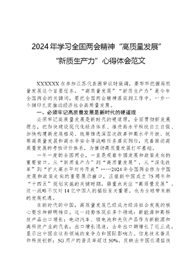 2024年学习全国两会精神高质量发展新质生产力心得体会范文XXXXXX在参加江苏代表团审议时强调,要牢牢把握高质量发展这个首要任务。高质量发展新质生产力是今年全国两会的关键词,要把全国两会精神落实到工作中,一步一个脚印扎实推动经济社会高质量发展。一、必须牢记高质量发展是新时代的硬道理必须牢记高质量发展是新时代的硬道理,全面贯彻新发展理念,把加快建设现代化经济体系、推进高水平科技自立自强、加快构建新发展格局、统筹推进深层次改革和高水平开放、统筹高质量发展和高水平安全等战略任务落实到位,完善推动高质量发展的考核评价体系,为推动高质量发展打牢基础。 一年一度的全国两会,一直是观察中国发展和政策走向的重要窗口。从新质生产力到高质量发展,从深化改革到扩大高水平对外开放……2024年全国两会作为中国发展和政策走向的重要展示窗口,正值新中国成立75周年和十四五规划实施的关键时期,将重点关注高质量发展。这一战略不仅对14亿中国人的福祉至关重要,也为全球带来新的发展机遇。在新时代的中国,高质量发展已经成为经济社会发展的核心要求和鲜明特征。这一趋势体现在多个领域:新能源和高科技产品出口增长:电动汽车、锂电池和光伏产品作为新能源和高科技产业的代表,出口增长迅速,去年出口额增长了近三成,显示出中国在这些领域的竞争力和国际影响力。信息技术普及和科技创新:5G用户的普及率超过50%,反映出中国在通信技术领域的领先地位。同时,超导量子计算机本源悟空的上线运行,标志着中国在量子科技领域取得了重要突破。经济增长和市场活力:新年伊始,中国经济延续回升向好的态势,新的消费场景和业态不断涌现,人流物流繁忙有序,这些都表明中国市场的活力和经济的内生增长动力。从中国制造到中国创造,中国经济从高速增长阶段转向高质量发展阶段,建设更加公平、可持续、繁荣的社会迈出重要步伐。创新为这一转变打下坚实基础,使今天的中国成为世界经济增长的重要引擎。 新时代的中国将高质量发展视为最重要的硬道理,这一理念贯穿于政府的工作报告中。对于2024年的中国经济,政府设定了5%左右的预期增长目标,与去年保持一致,同时提出单位国内生产总值能耗降低2.5%左右的目标。这一增一减的目标体现了中国政府在全面考虑国内外因素的基础上,对实现高质量发展的坚定决心。中国政府致力于通过创新驱动和产业升级,提升生产力水平,实现经济增长的质量和效益,而不仅仅是速度。高质量发展是十四五乃至更长时期我国经济社会发展的主题,关系我国社会主义现代化建设全局。高质量发展不只是一个经济要求,而是对经济社会发展方方面面的总要求;不是只对经济发达地区的要求,而是所有地区发展都必须贯彻的要求;不是一时一事的要求,而是必须长期坚持的要求。二、发展新质生产力是推动高质量发展的内在要求发展新质生产力是推动高质量发展的内在要求和重要着力点,必须继续做好创新这篇大文章,推动新质生产力加快发展。高质量发展需要新的生产力理论来指导,而新质生产力已经在实践中形成并展示出对高质量发展的强劲推动力、支撑力,需要我们从理论上进行总结、概括,用以指导新的发展实践。要立足现有产业基础,扎实推进先进制造业高质量发展,加快推动传统制造业升级,发挥科技创新的增量器作用,全面提升三文可居文库——海量学习资料,手机电脑均可下载www.wenkeju.com次产业,不断优化经济结构、调整产业结构。整合科技创新资源,引领发展战略性新兴产业和未来产业,加快形成新质生产力。在全国两会上,中国传递出了以新质生产力更好推动高质量发展的强烈信号,将大力推进现代化产业体系建设,加快发展新质生产力列为2024年政府工作的首要任务。推动高质量发展,还要树立系统观念,讲究策略和艺术。面对当前复杂形势,必须保持战略定力,统筹好质的有效提升和量的合理增长,防止为了短期效果而弱化高质量发展的导向以及新发展理念的贯彻。推动高质量发展,需要久久为功、善作善成,避免把长期目标短期化、系统目标碎片化,避免把持久战打成突击战、把攻坚战打成消耗战。要处理好破与立的关系,坚持先立后破、破立并举,防止出现转轨真空,更要防止操作不当干扰经济运行和群众生活。中国正在制定全面的深化改革重大举措,旨在为推动高质量发展和推进中国式现代化注入持续的强劲动力。在全国两会上,一系列以改革促进高质量发展的举措受到了广泛关注。针对民营企业面临的问题,如账款拖欠,中国明确要求建立长效机制来防范和化解这些问题。在融资方面,提出了提高贷款占比、扩大发债融资规模等具体措施。此外,为了优化营商环境,中国将解决市场准入、要素获取、公平执法、权益保护等方面的突出问题。中国还致力于加强全国统一大市场建设,维护公平竞争的市场秩序,并有效防范和化解重点领域的风险。同时,